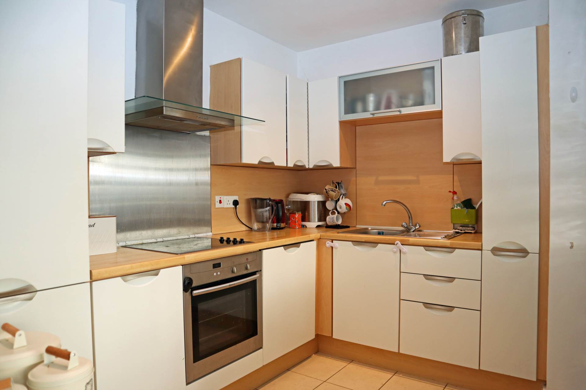 Opening off the main living space. Fitted kitchen, fully equipped with integrated fridge/freezer, dishwasher, Electric oven and hob, with stainless steel hood and splashback. Larder unit. Stainless steel sink with mixer taps. Tiled floor. Separated from the main living area by a glass block partition wall. Door to utility room.