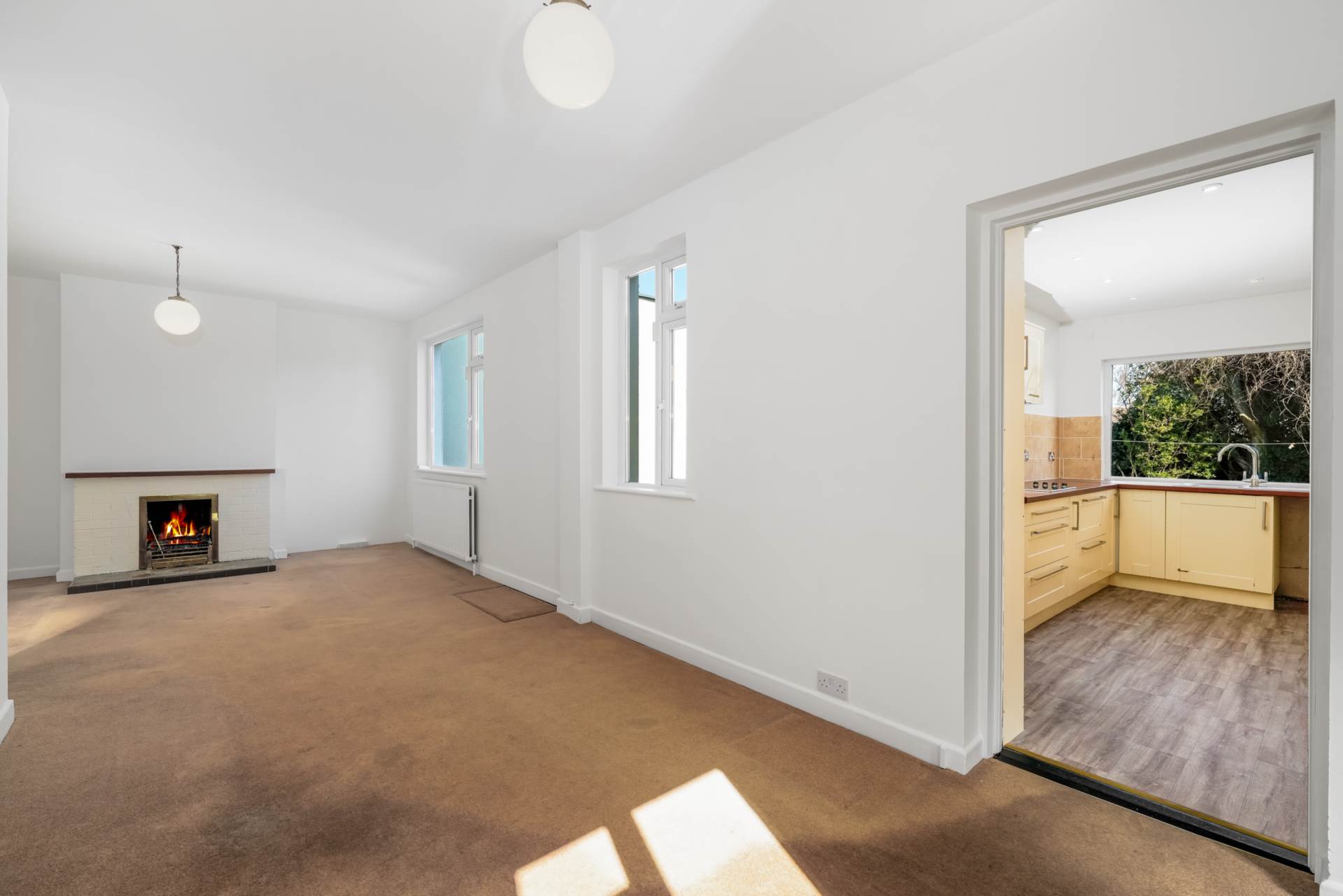 Painted brick fireplace with stone hearth. Three windows. Doors to kitchen and bedroom extension. If desired, the dining area of this room could be incorporated into a granny flat area. Carpet over pine floorboards.