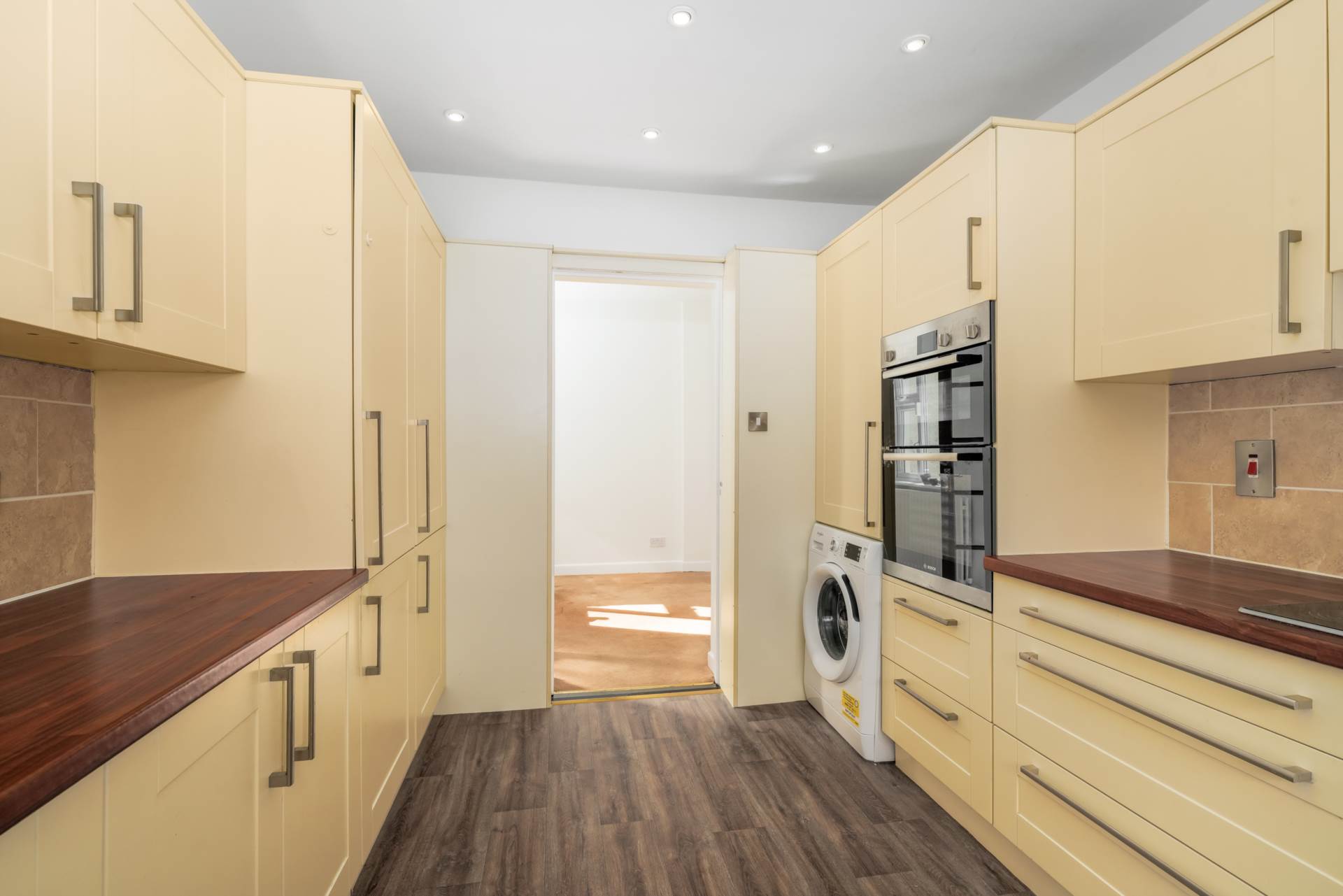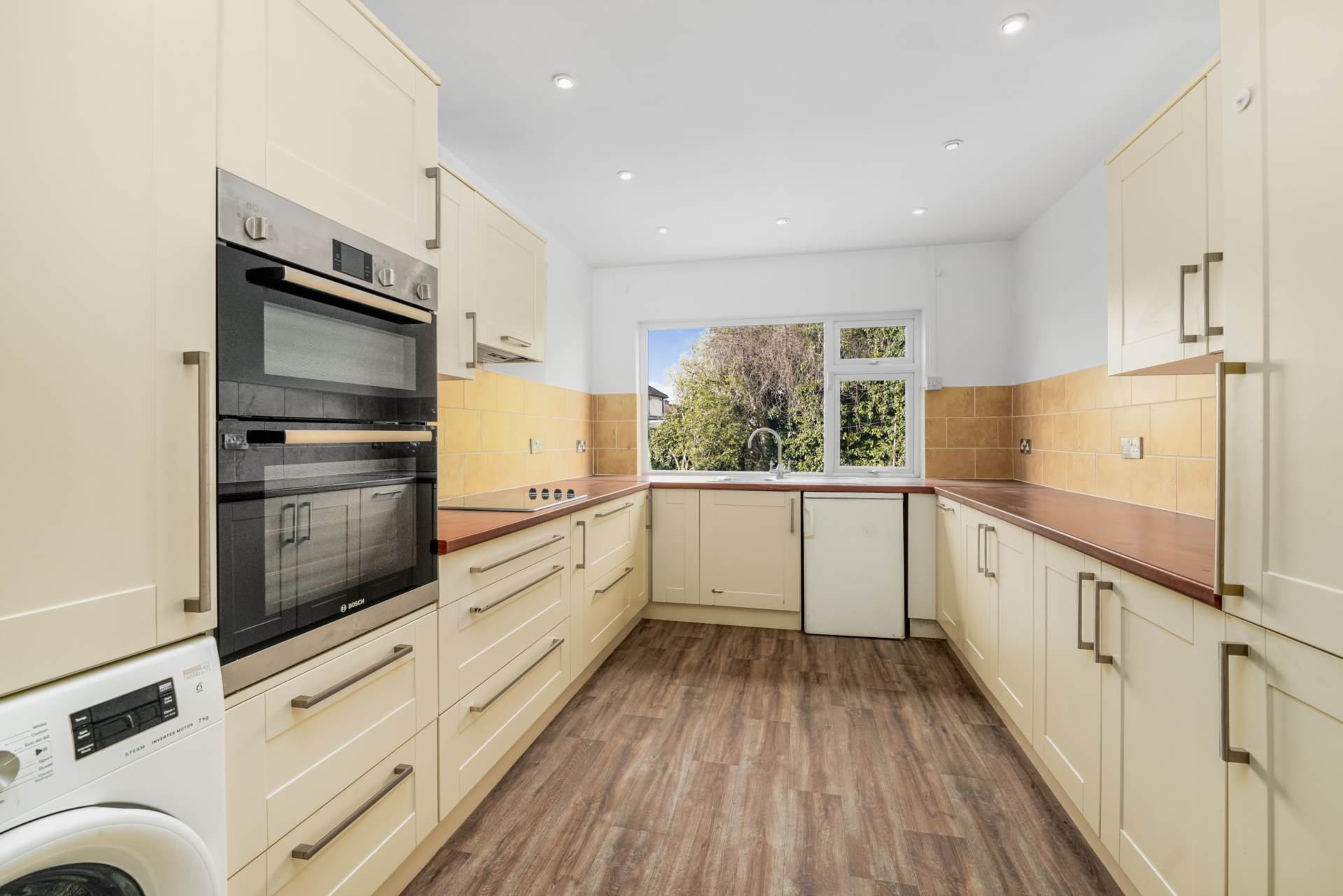 Cream fitted kitchen. Large kitchen window to the back garden. Recessed lighting. Tiled splashback. Washing machine. Eye level Bosch double oven. Electric induction hob. Self-closing drawers. Large saucepan drawers. Space for dishwasher. Space for fridge-freezer.