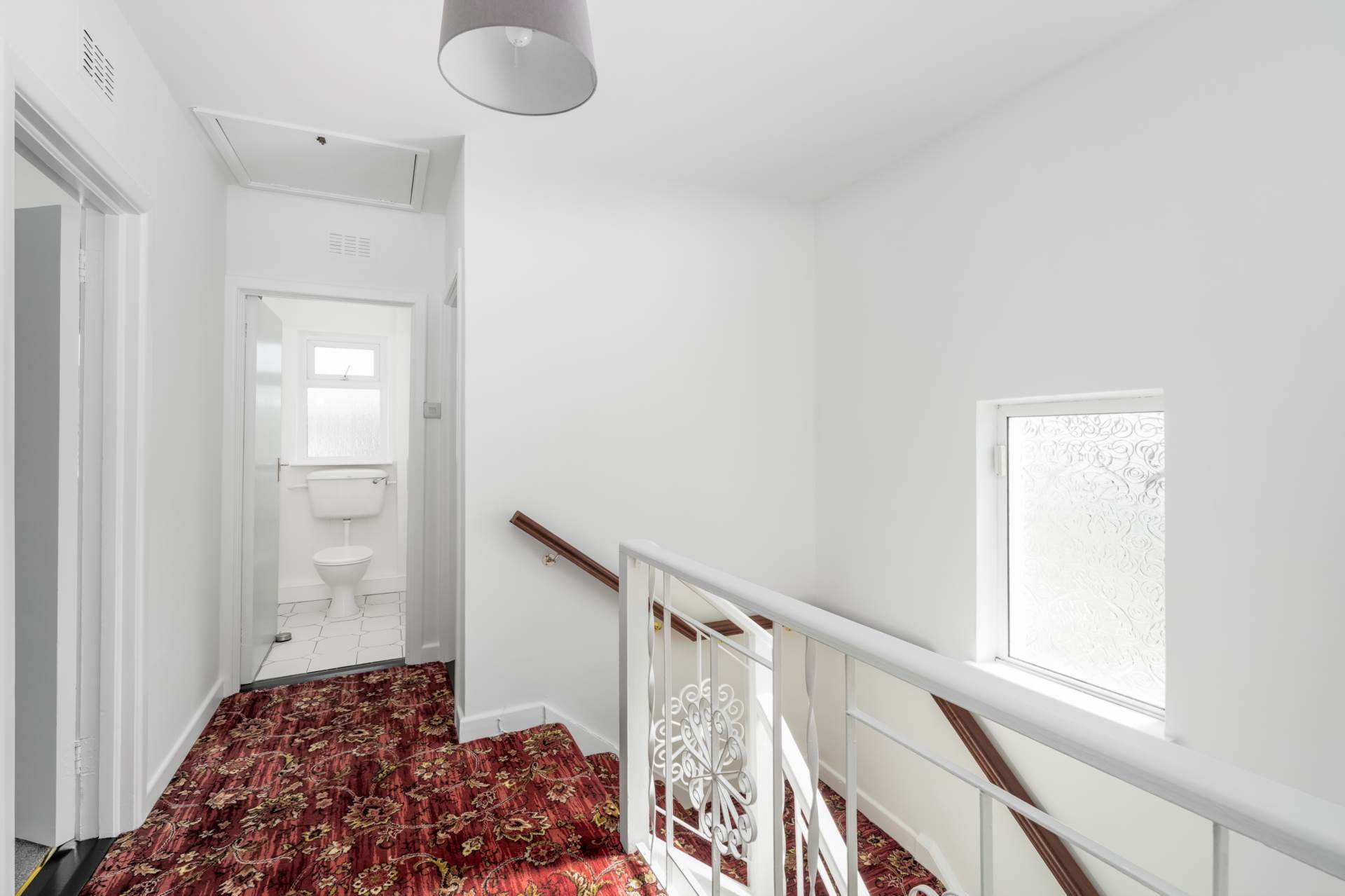 Window. Attic access hatch. Large attic suitable for conversion to habitable space. Attractive white painted cast iron banisters. Hot press. Carpet over pine floorboards.