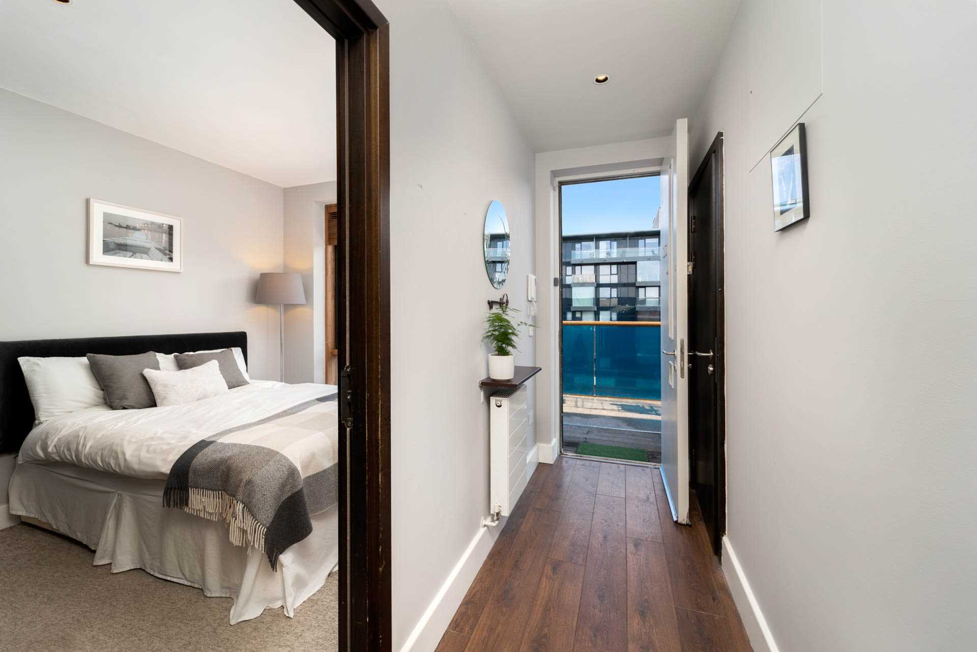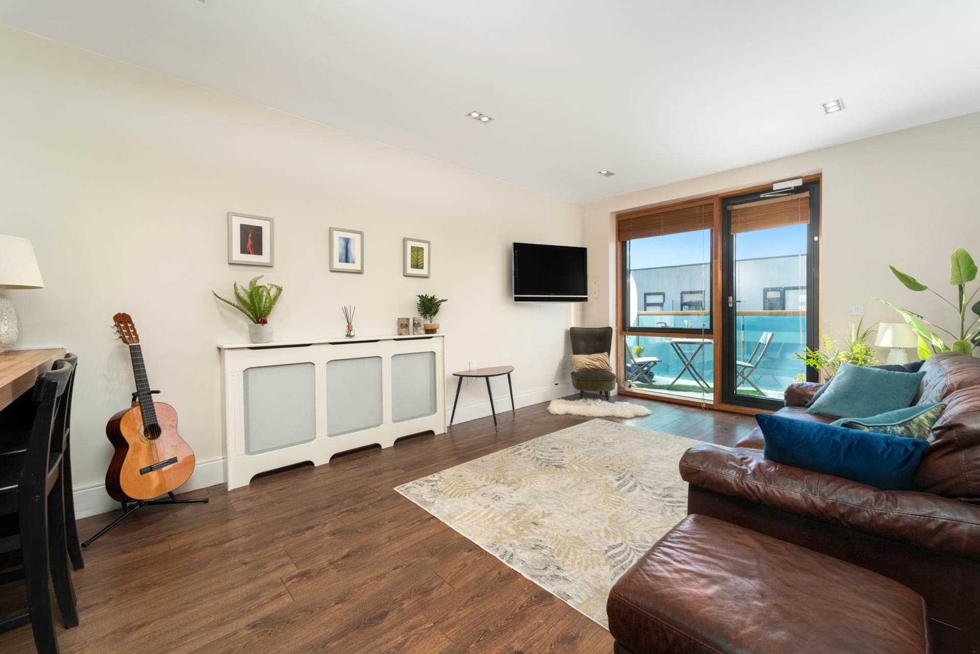 It comes with a black gloss fully fitted kitchen with a breakfast bar and space for a dining table and chairs. All appliances are included. Both double bedrooms have large fitted wardrobes. The spacious bathroom is beautifully finished to a very high standard. To the rear is a large balcony which gets afternoon and evening sun. There is also a decked area with space for seating on the south-easterly facing front terrace. There is a selection of roof garden spaces on the third floor.
