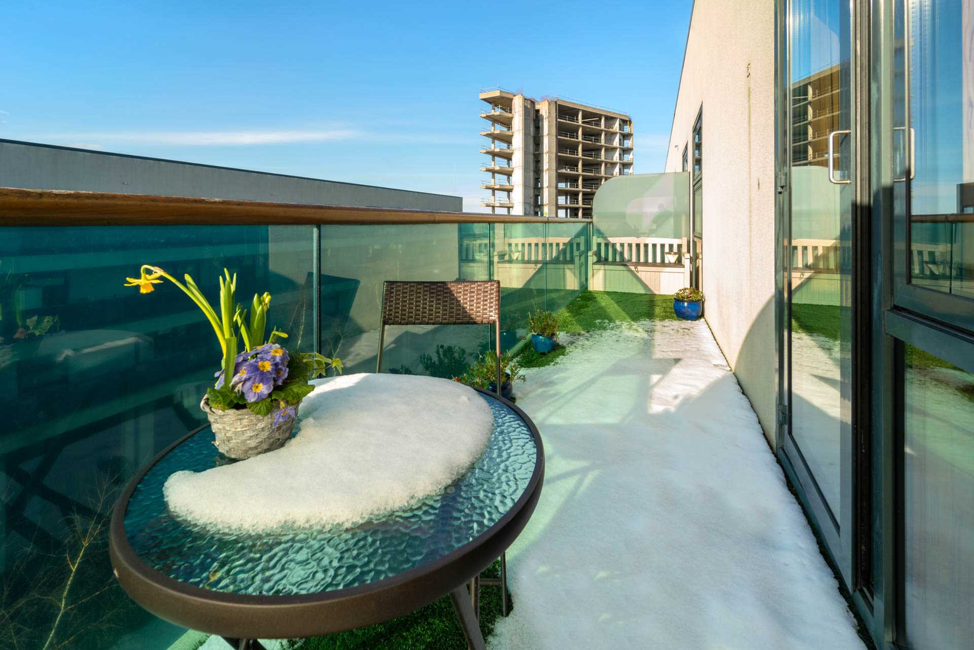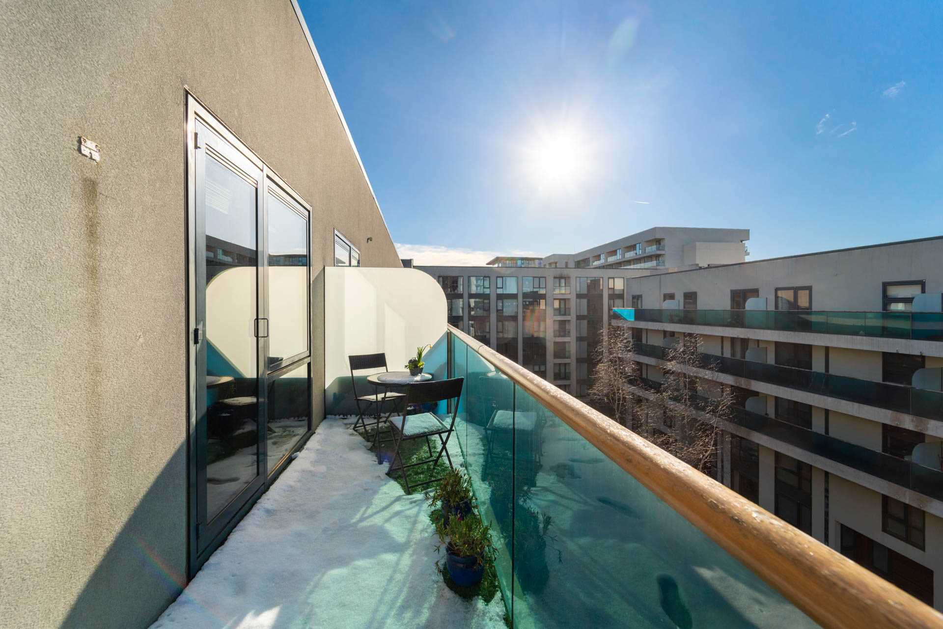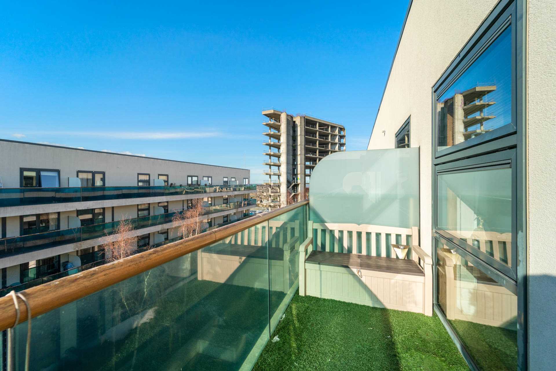 Accessed by door from living area. Westerly facing orientation catching afternoon and evening sunshine. Southerly facing sun bench. Decked with artificial grass covering. Frosted glass privacy screening on both ends. Glass balustrade.