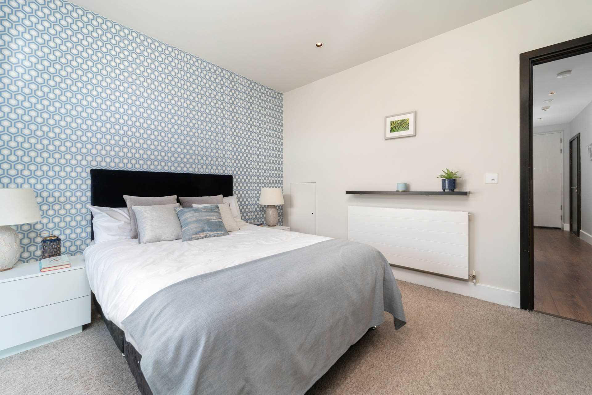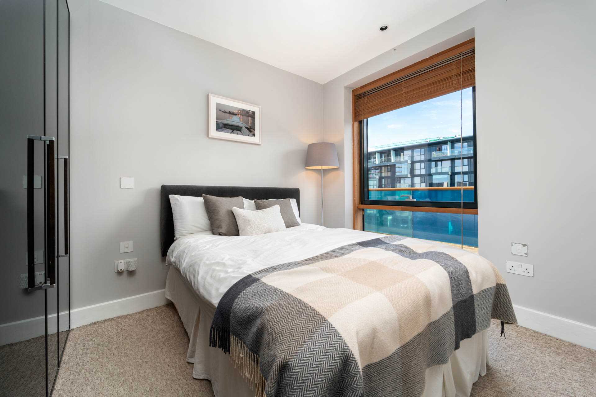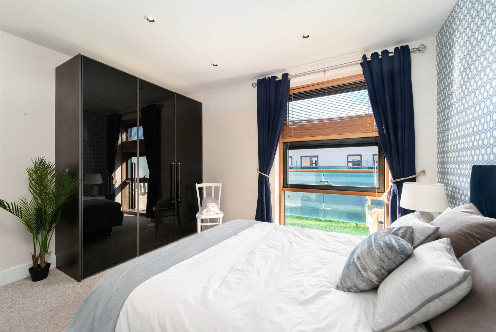 Large double bedroom. Floor-to-ceiling window. Fitted wardrobes. Curtains, Curtain rod. Blinds.