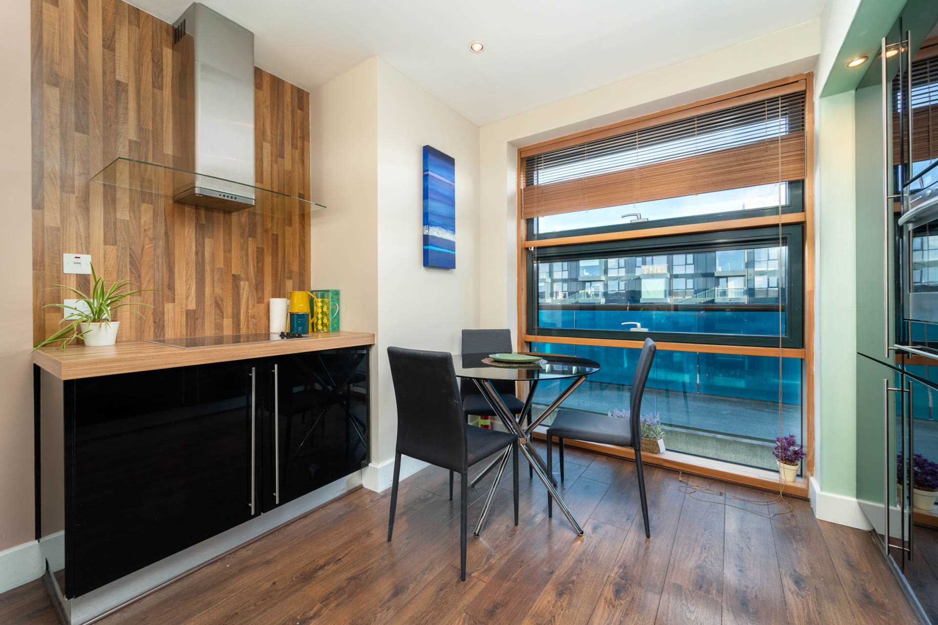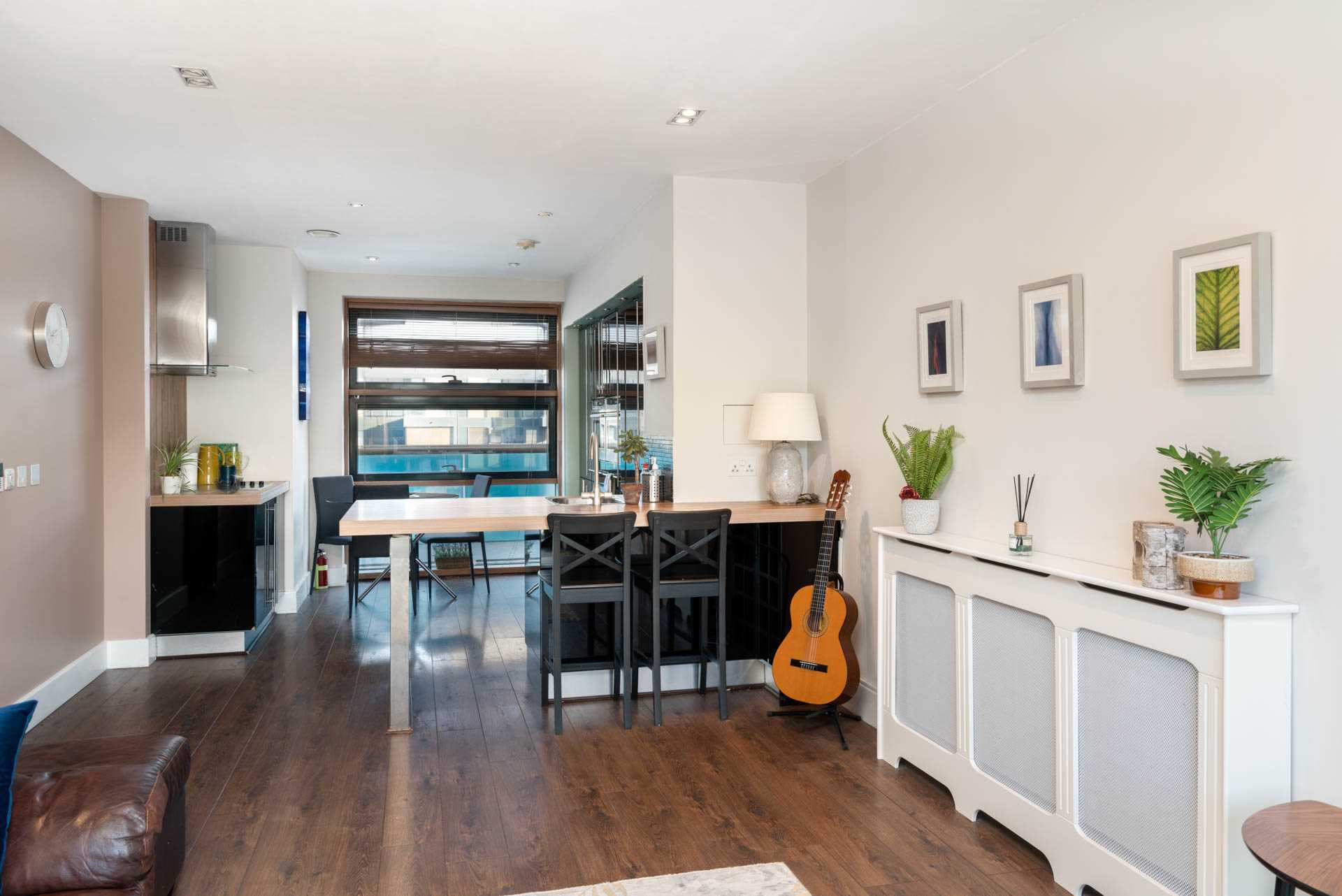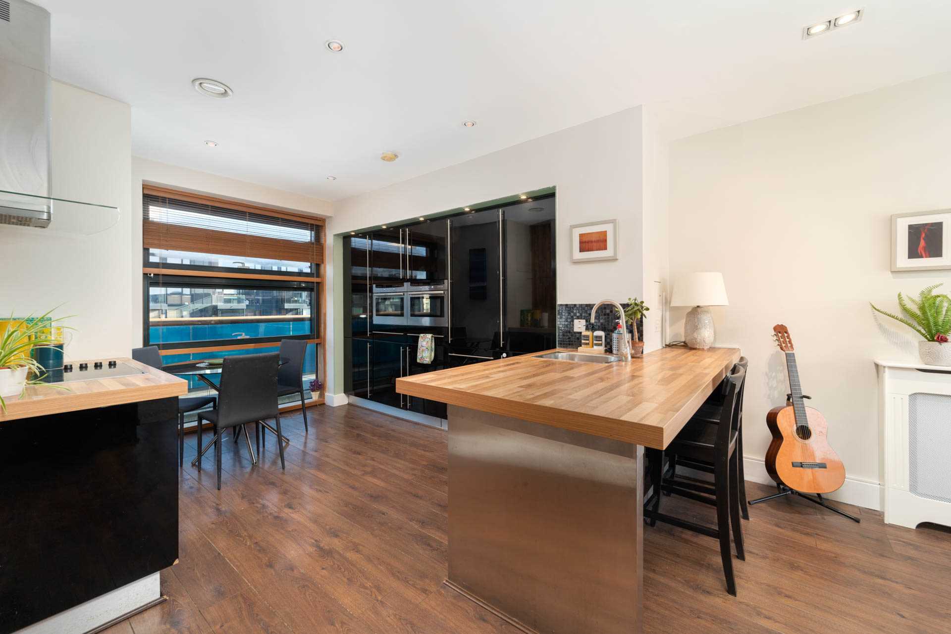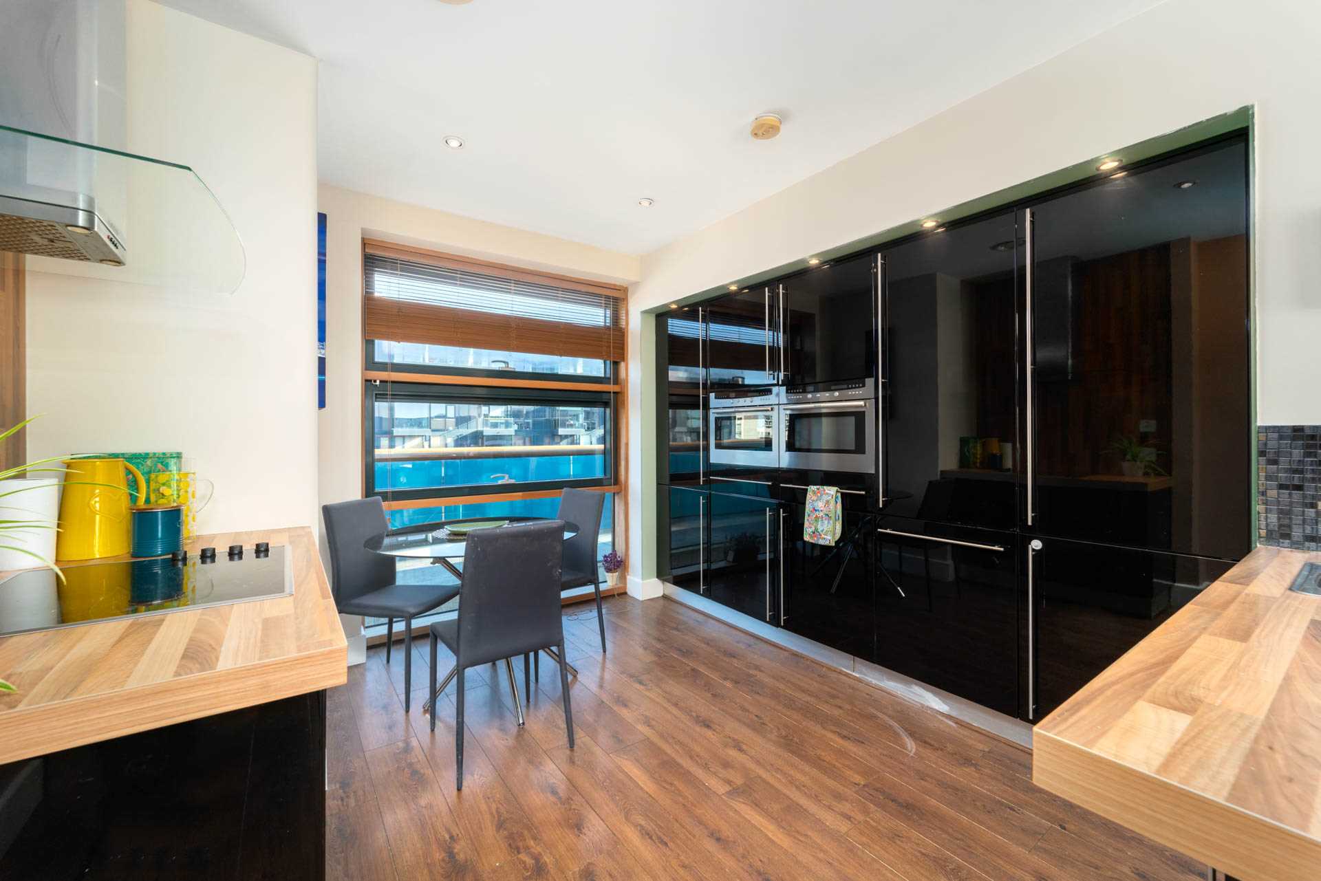 Dual aspect space with floor to ceiling windows at both ends. Gloss black fitted kitchen with integrated fridge-freezer, dishwasher, ovens and washing machine. Small breakfast bar with two stools. Electric induction hob with hood. Door to balcony.