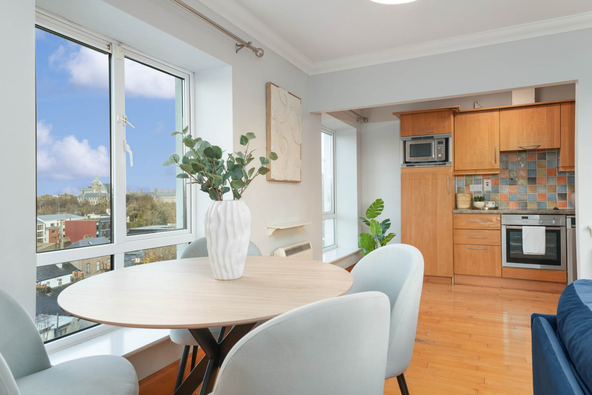 The heart of the home is the expansive open-plan kitchen, dining, and living area, thoughtfully laid out to maximise space and ease of living. With dual-aspect windows, this impressive room enjoys an abundance of natural light and offers great views. From the living area, doors open onto a lovely private balcony, ideal for enjoying fresh air, and seating in the warmer months