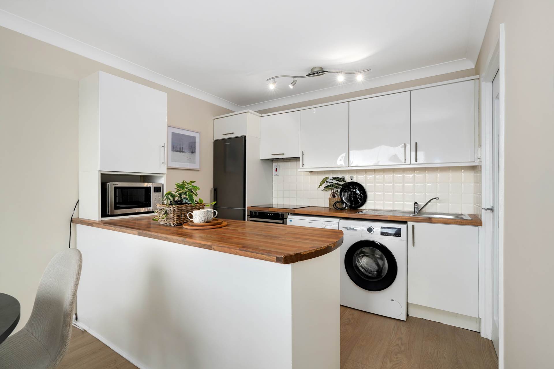 The kitchen is fully fitted and there is ample countertop space for preparing meals. The two bedrooms are well-proportioned and feature built-in wardrobes for storage.