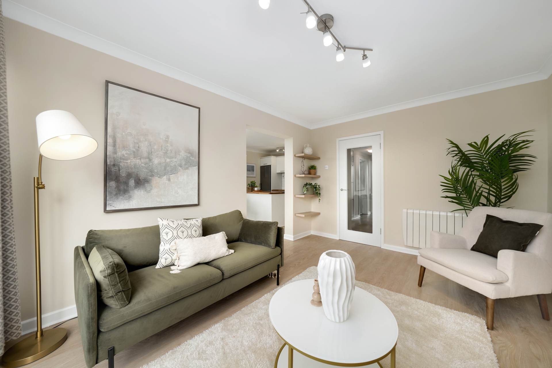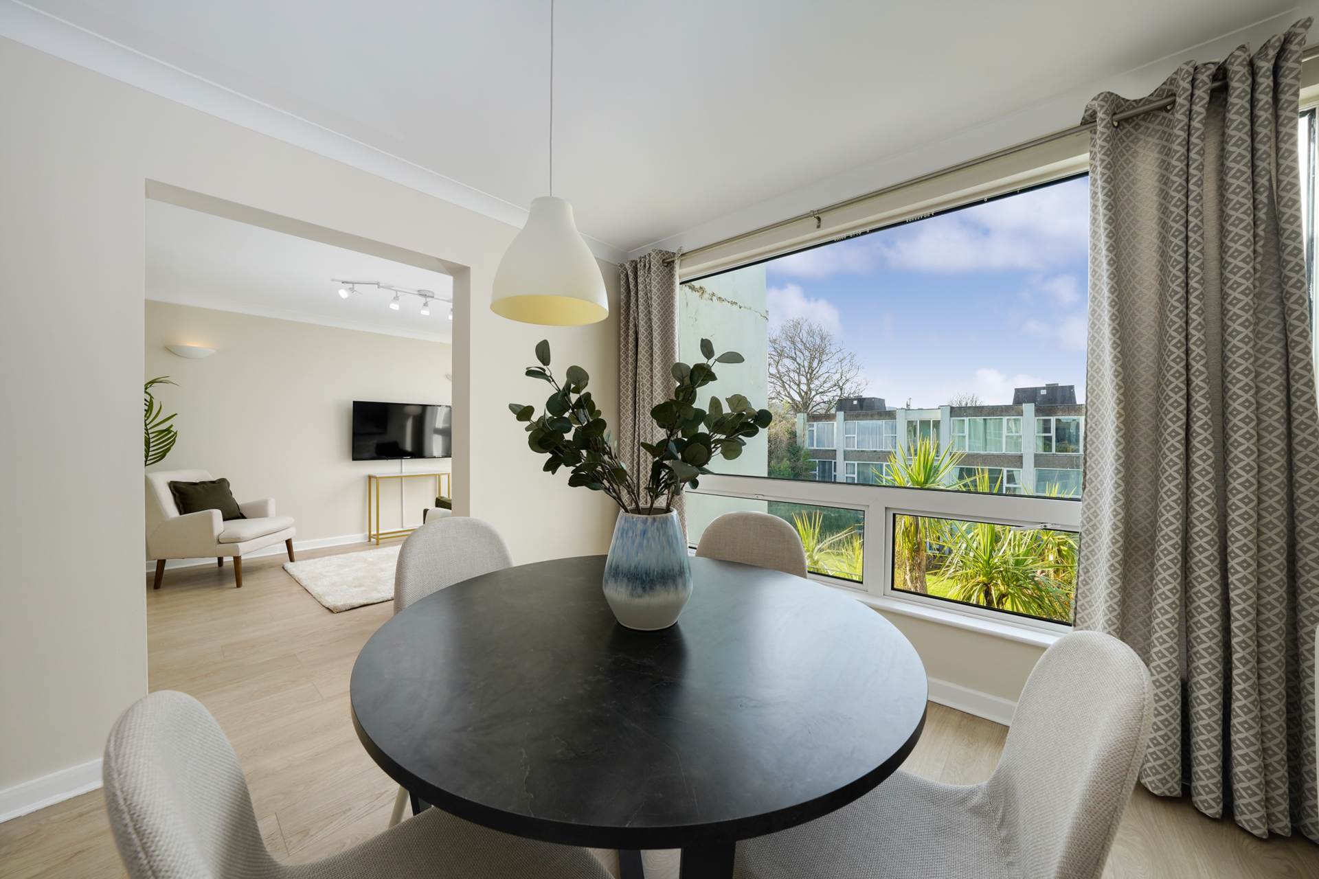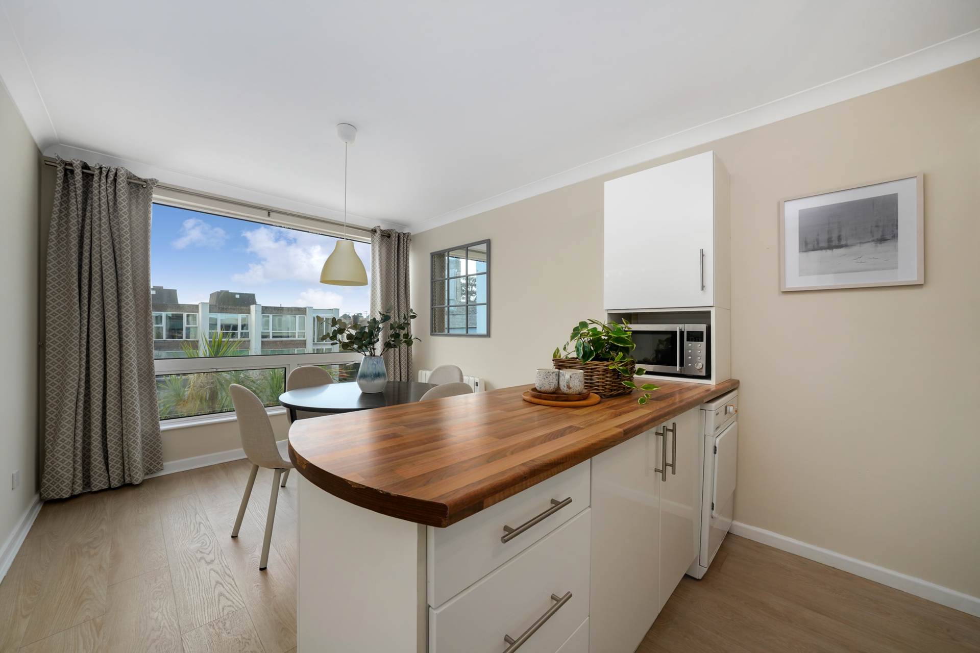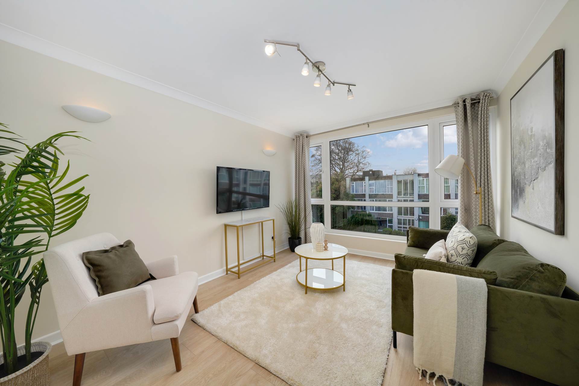 Open plan with kitchen. Large windows looking onto communal gardens