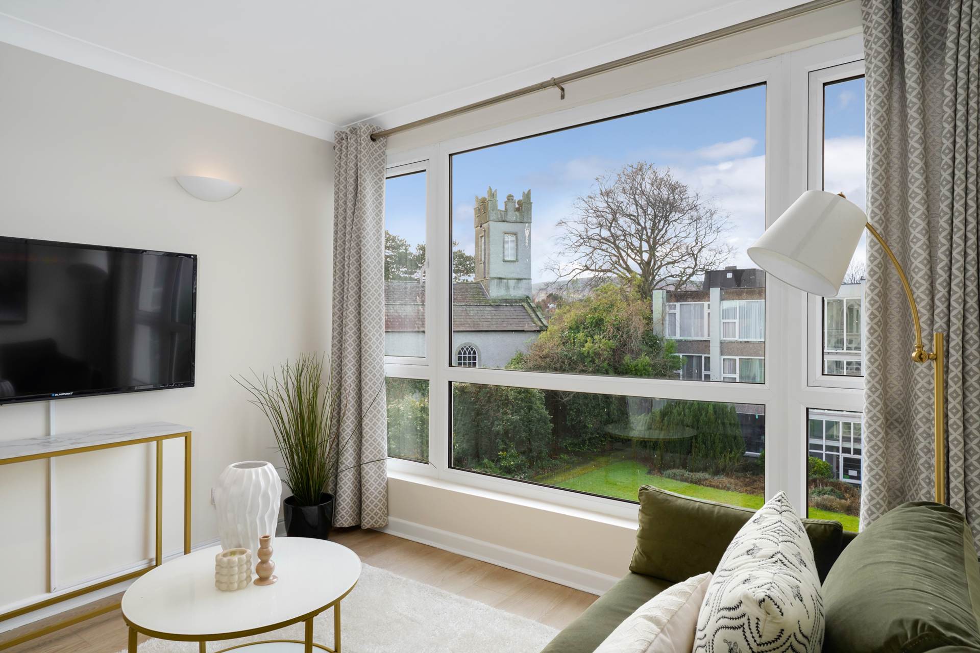 Offering a spacious living room adorned with a large window that bathes the space in natural light. Both the living room and the dining/kitchen area provide a delightful view of the meticulously manicured, almost pastoral communal gardens comprising a lawn, trees and shrubbery as well as a cut stone cottage looking onto St. Brigid`s Church through its own sizable window. The apartment features two generously sized double bedrooms, one of which boasts a small balcony, a perfect spot for enjoying fresh air. There is a good size main bathroom with a bath and designated parking within the development.