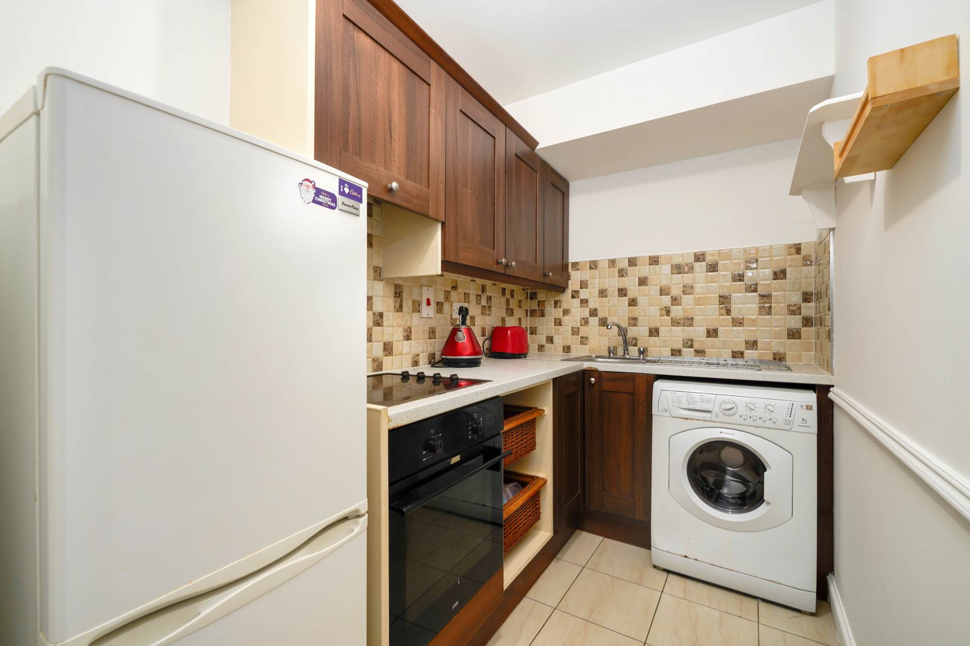 A small hallway off the living area leads to a stylish, modern tiled bathroom and a generously sized double bedroom, offering ample storage and a peaceful retreat.