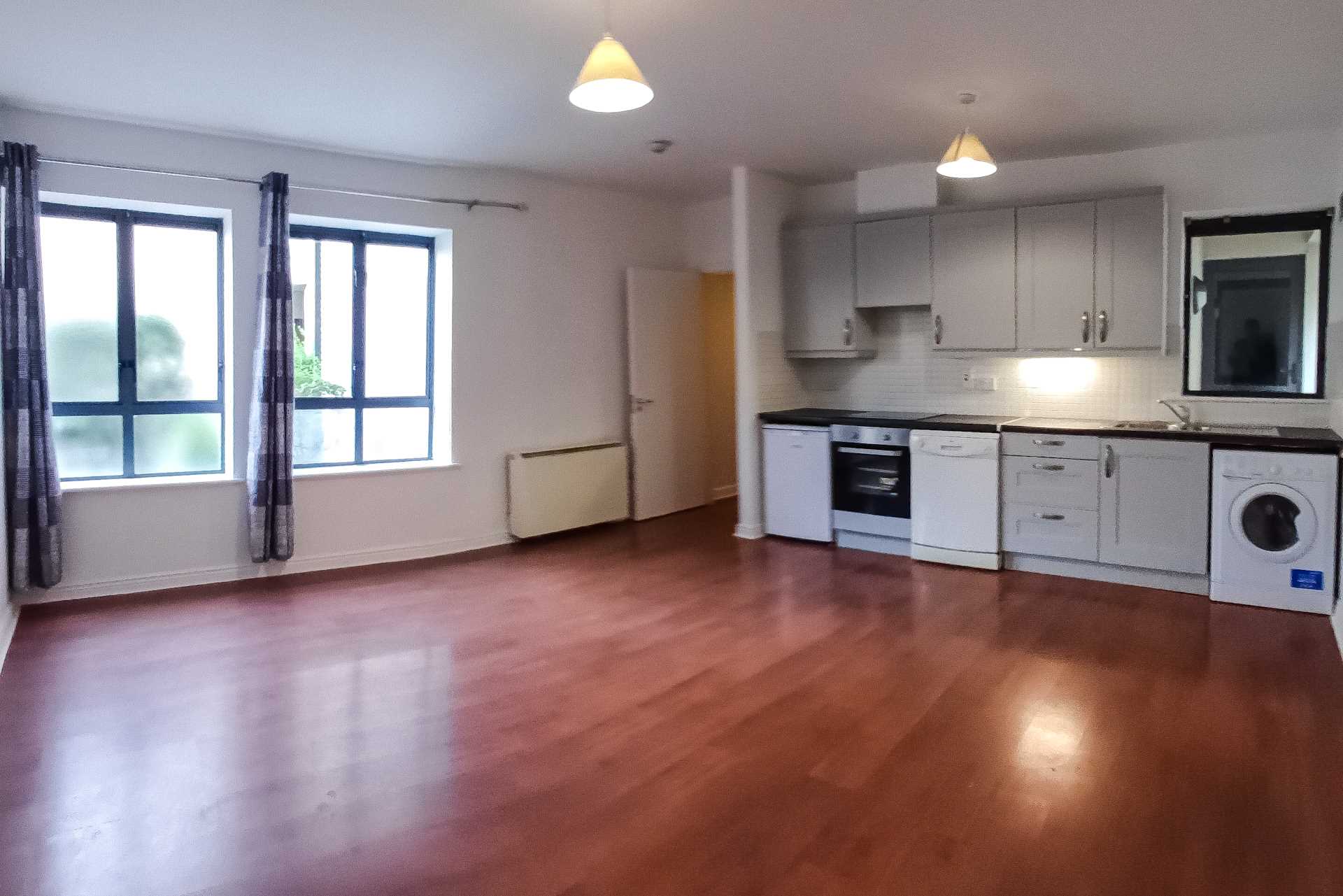 Spacious room with a fitted kitchen along one wall. Wood laminate flooring. Three windows, two of which open to a small walled courtyard to the rear and one beside the kitchen opening to the end of the balcony. Kitchen appliances included. TV/Broadband connection point.