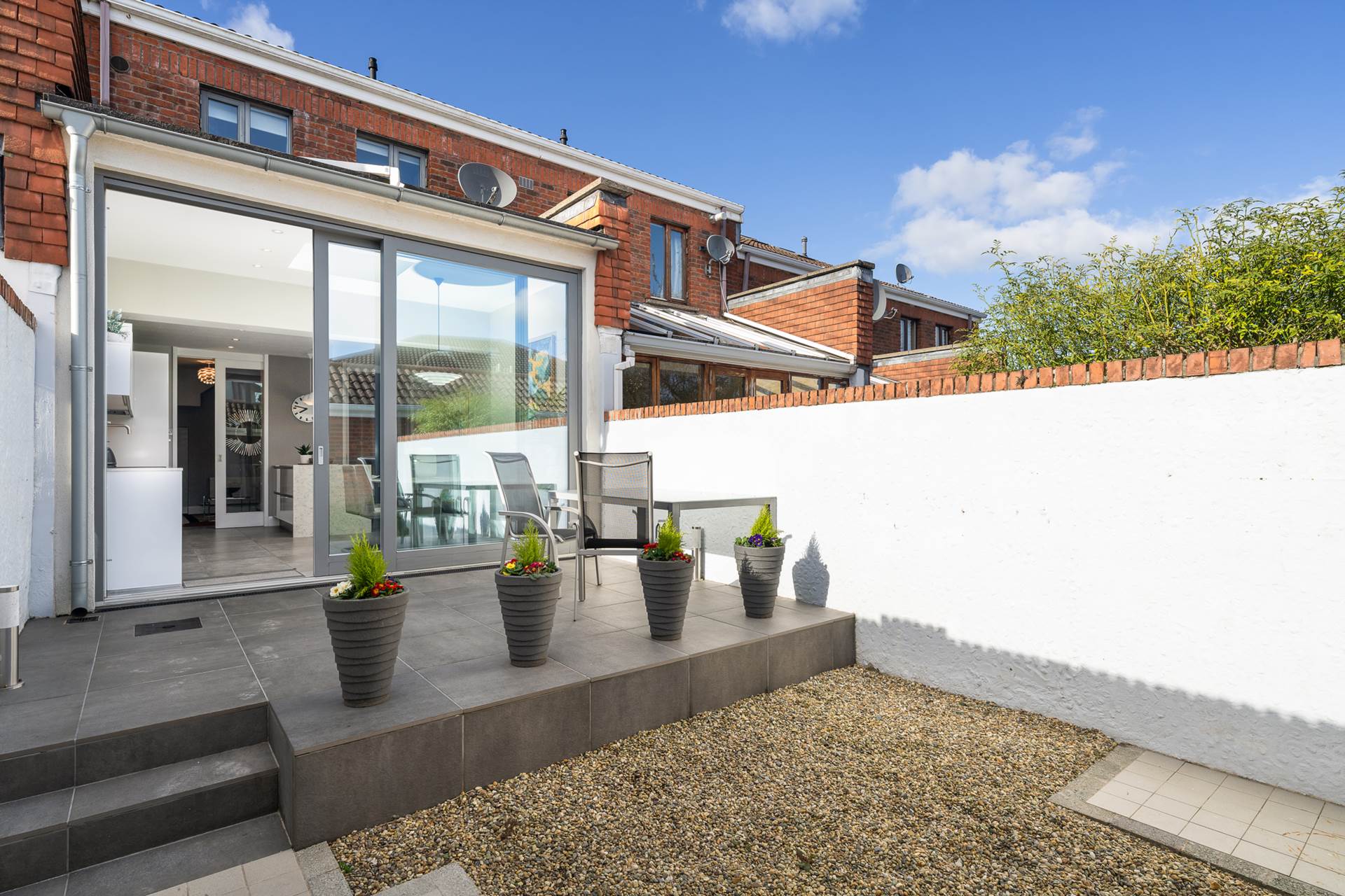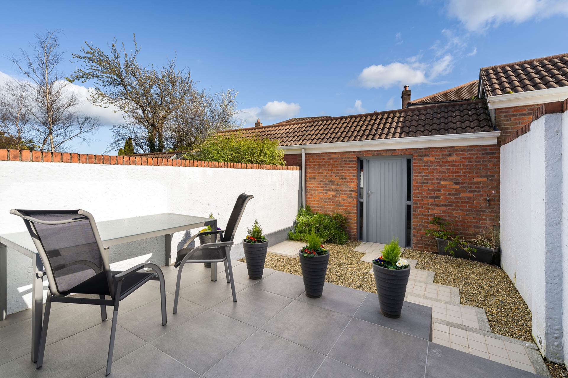 Split level, low maintenance garden. The upper level right outside the patio door is ideal for al-fresco dining with a grey tile finish and outdoor lighting. The lower level is easy maintenance gravel with stepping-stone tiles leading to the shed door. Planters either side of shed door.