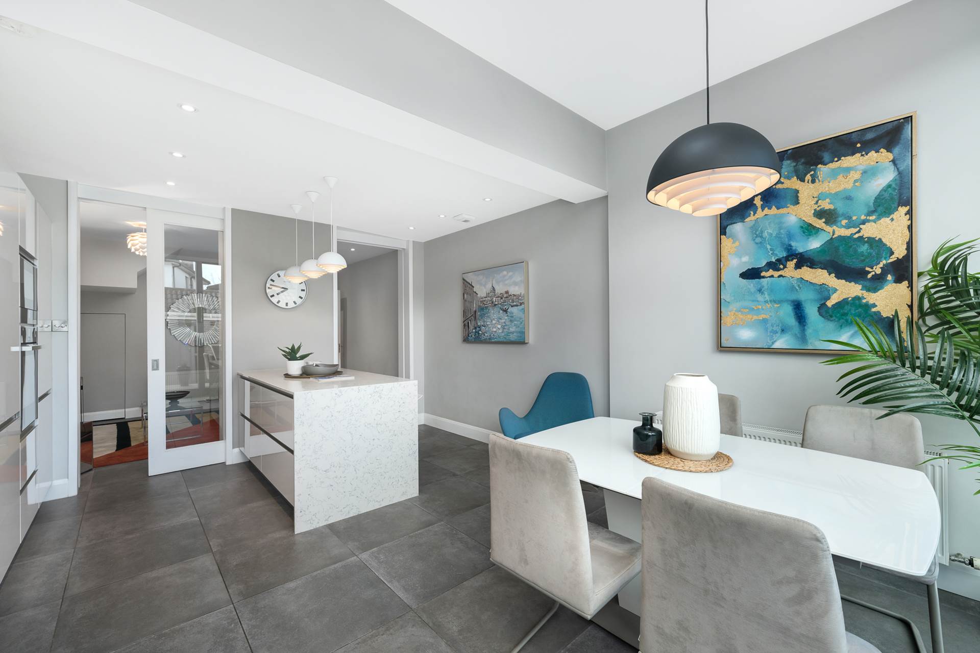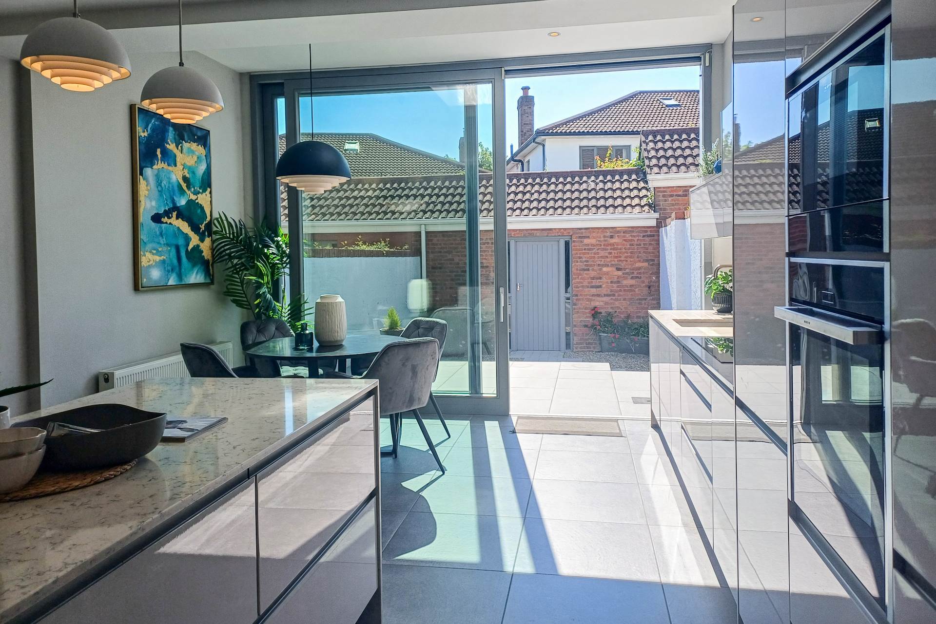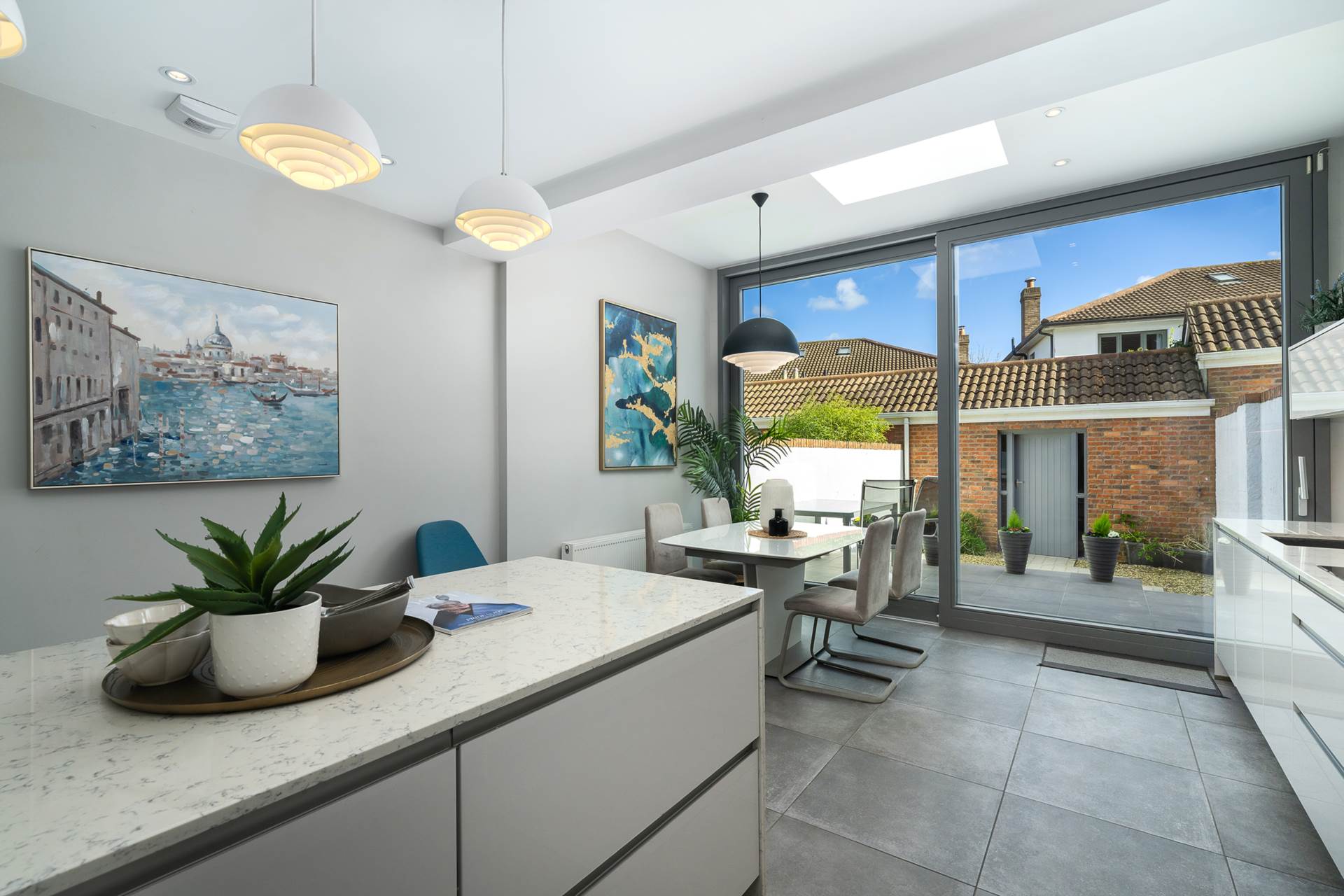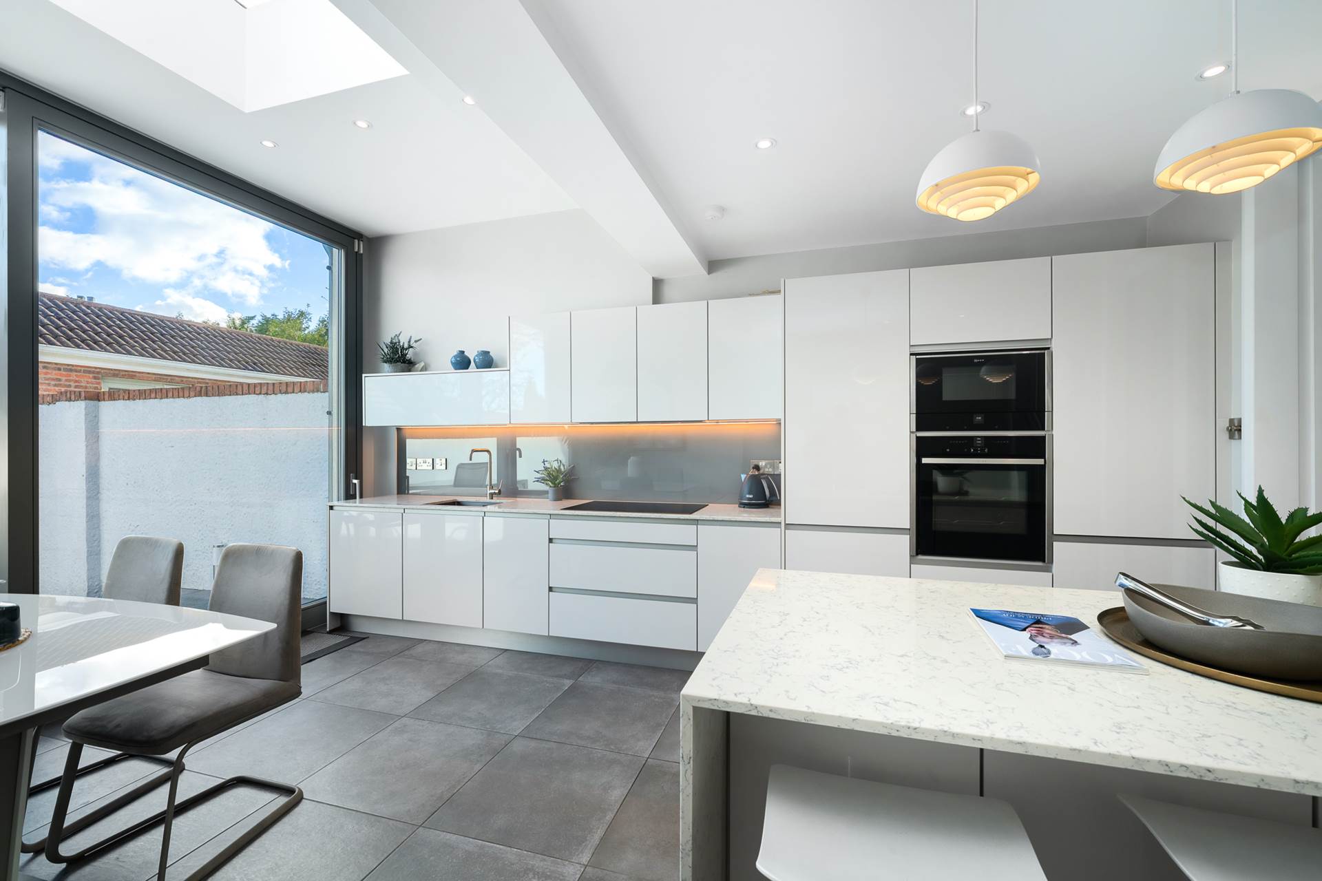 Lovely bright space with large roof-light and extra-height sliding patio door to outside al-fresco dining patio. Modern high-quality fitted kitcehn. White stone counter tops and breakfast bar. Integrated appliances including fridge-freezr, dishwasher, induction hob, eye-level oven, microwave,. Larder unit. Easy-clean glazed splashback. Kitchen sink with mixer taps. Recessed lighting. Ceramic floor tiles.