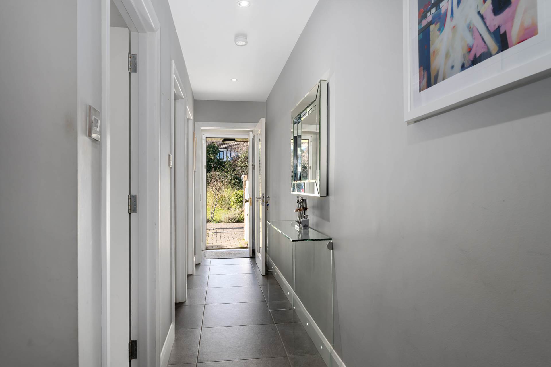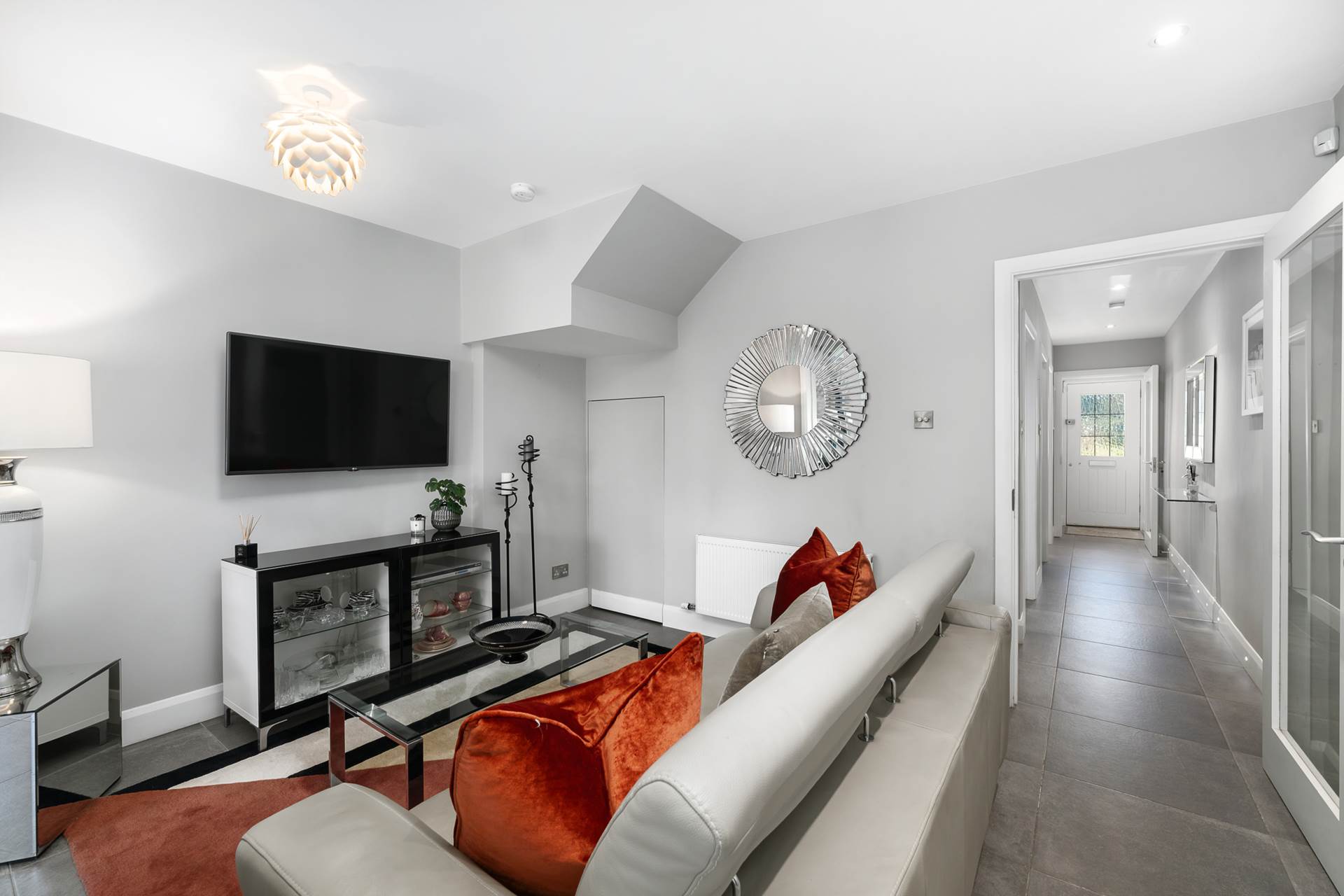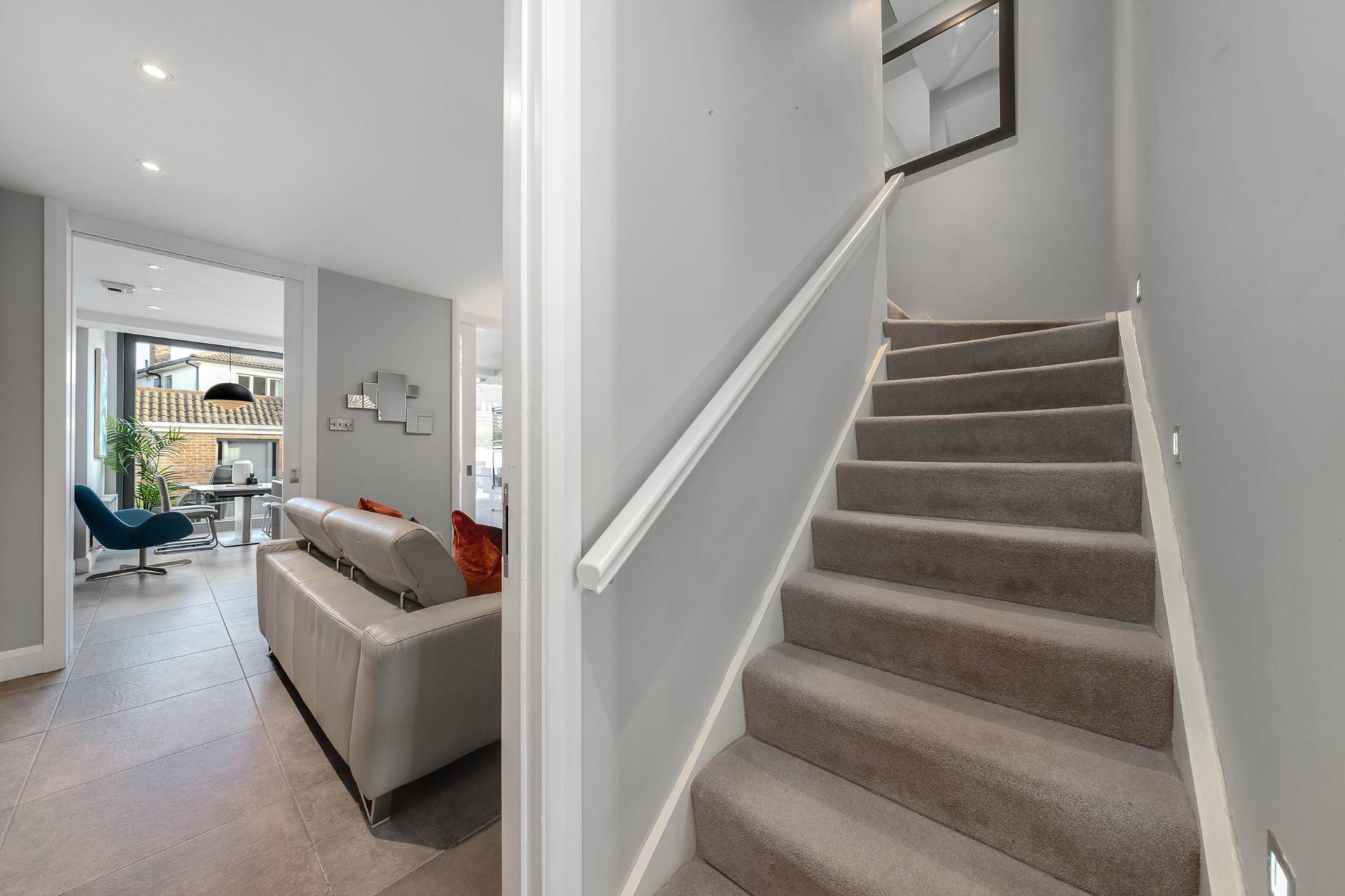 Grey ceramic floor tiles. Skirting board with integrated lighting. Recessed lighting. Glazed internal doors. Doors to Sitting room, guest WC, lounge/kitchen and utility room. Carpeted stairs with integrated wall lights.