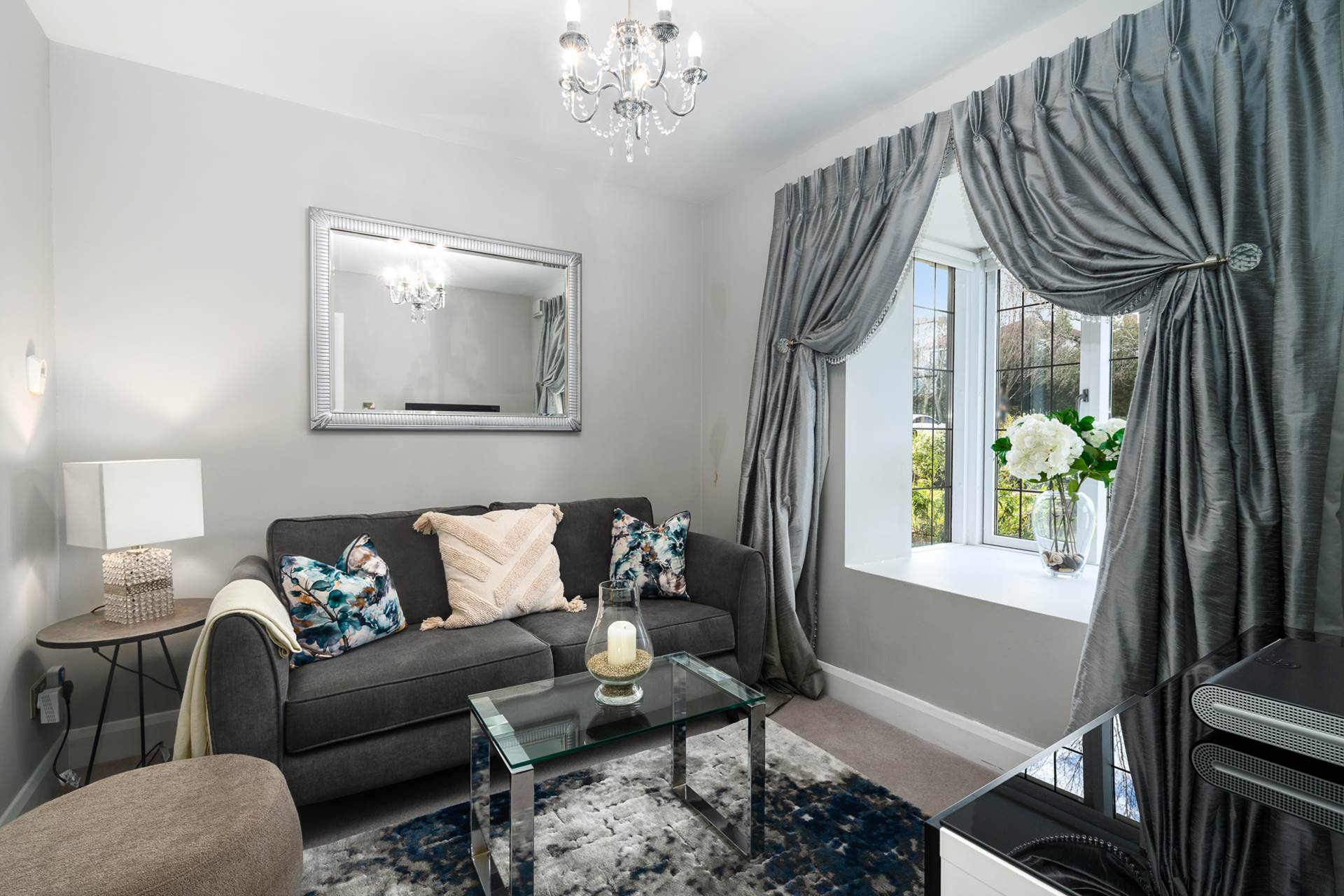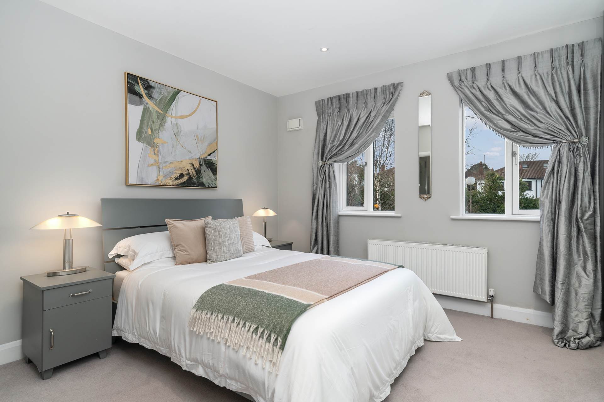Bay window. Carpet.Light fitting. Curtains. Blinds. TV point.