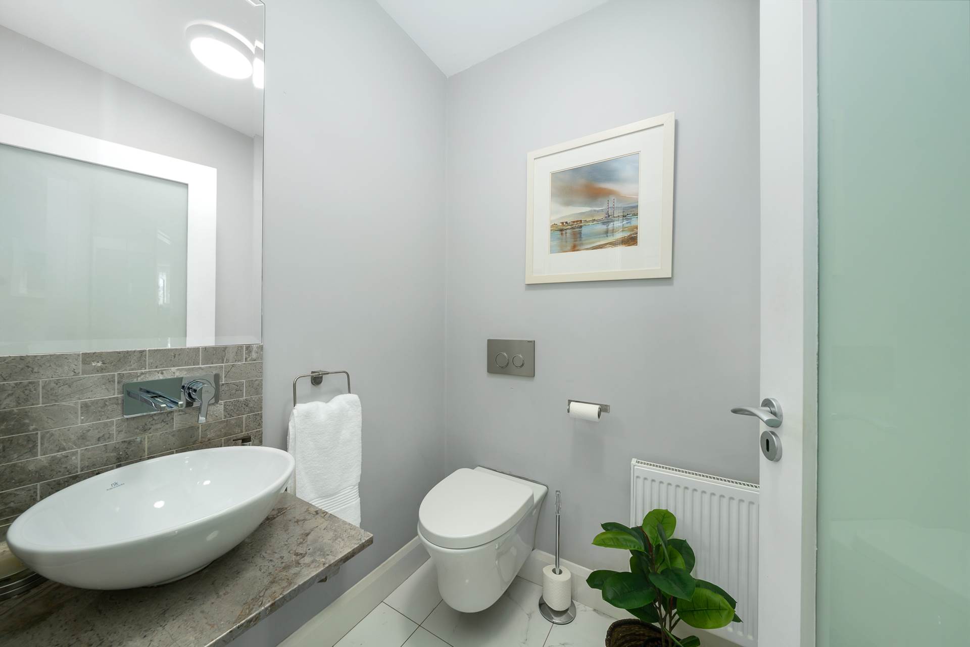 Light fitting. Ceramnic floor tiles. High quality NK Porcellanosa bathroom fittings. Round WHB with mixer taps and marble base. Floating WC with hidden cistern. Towel ring. Extractor fan.