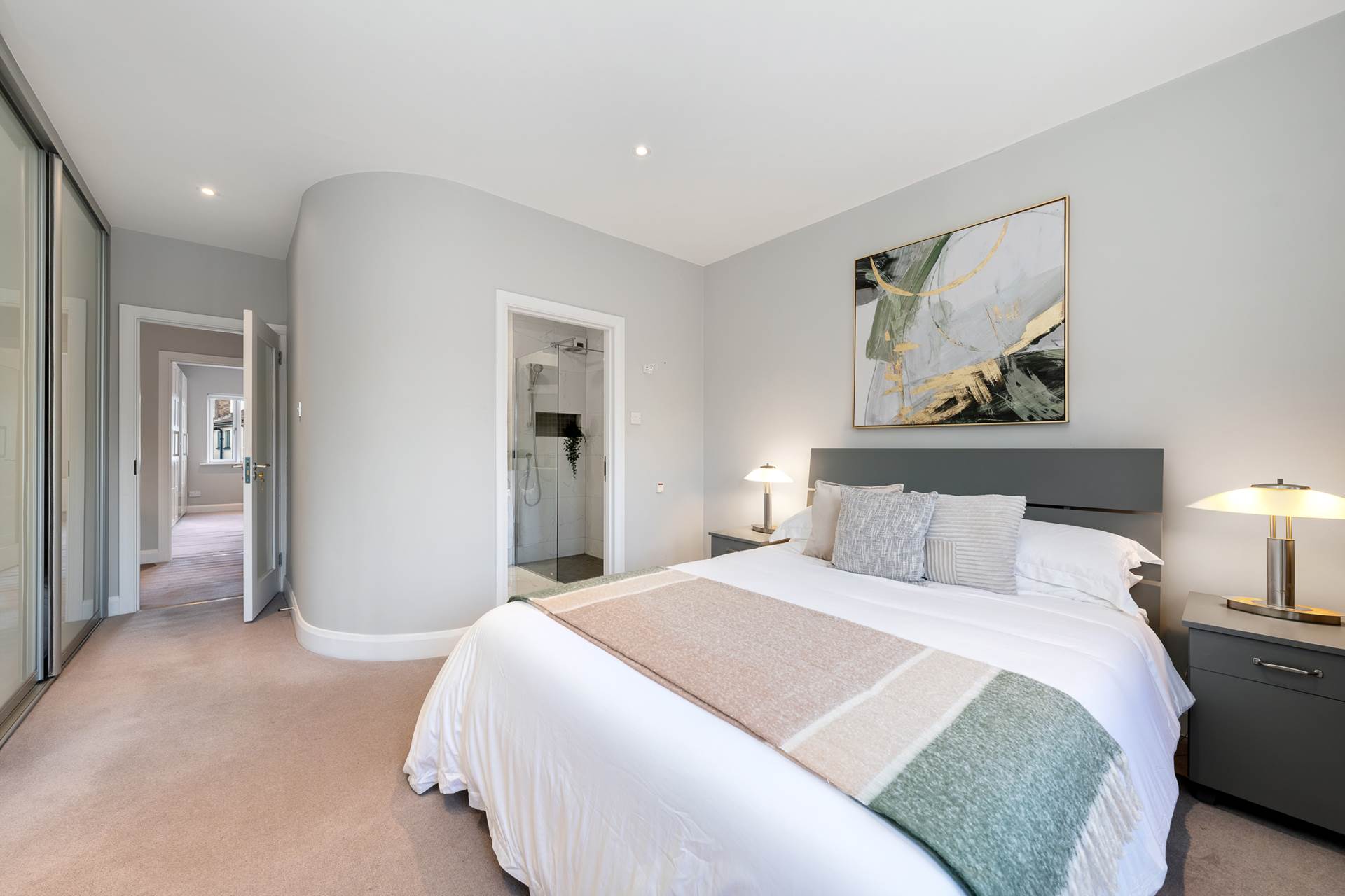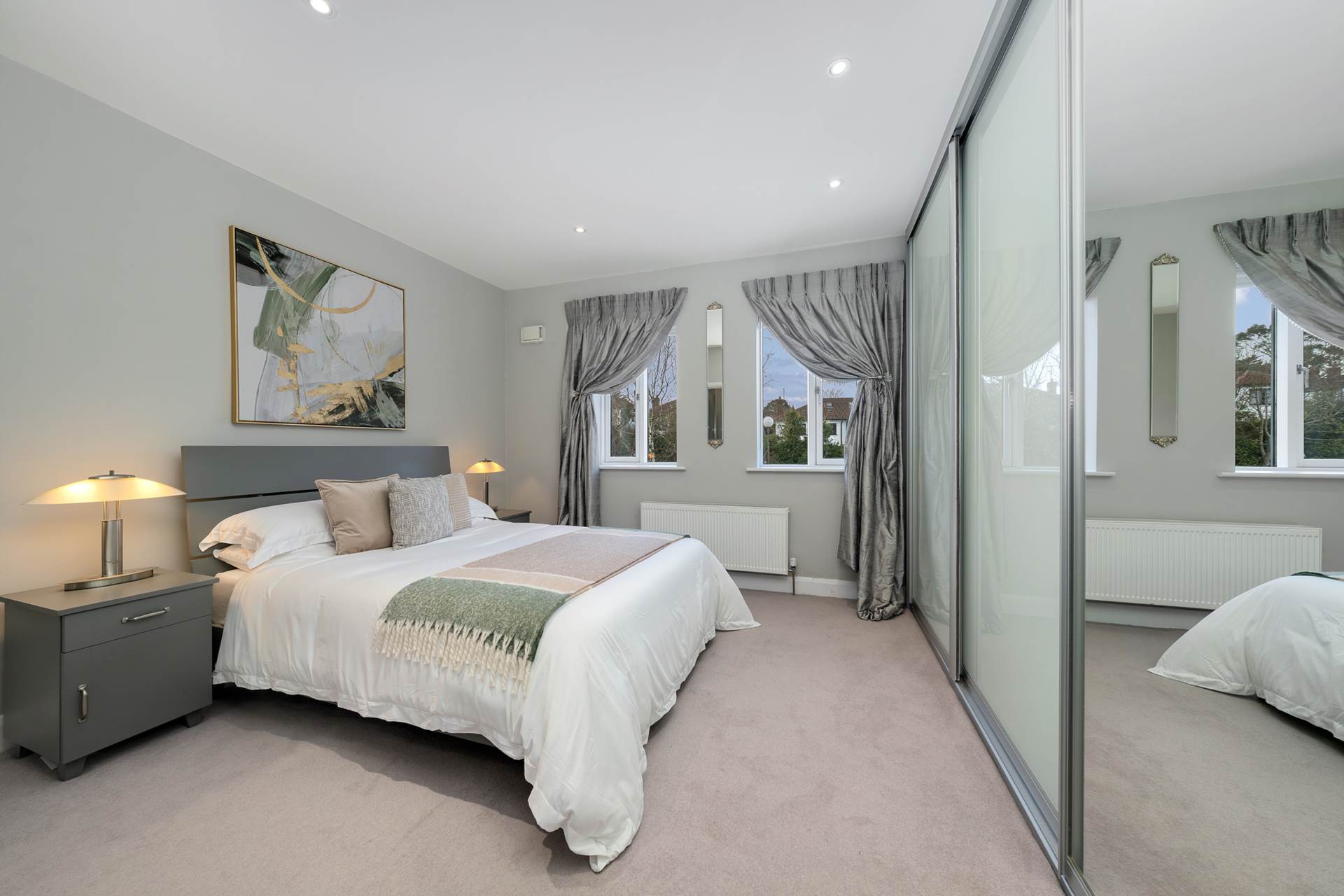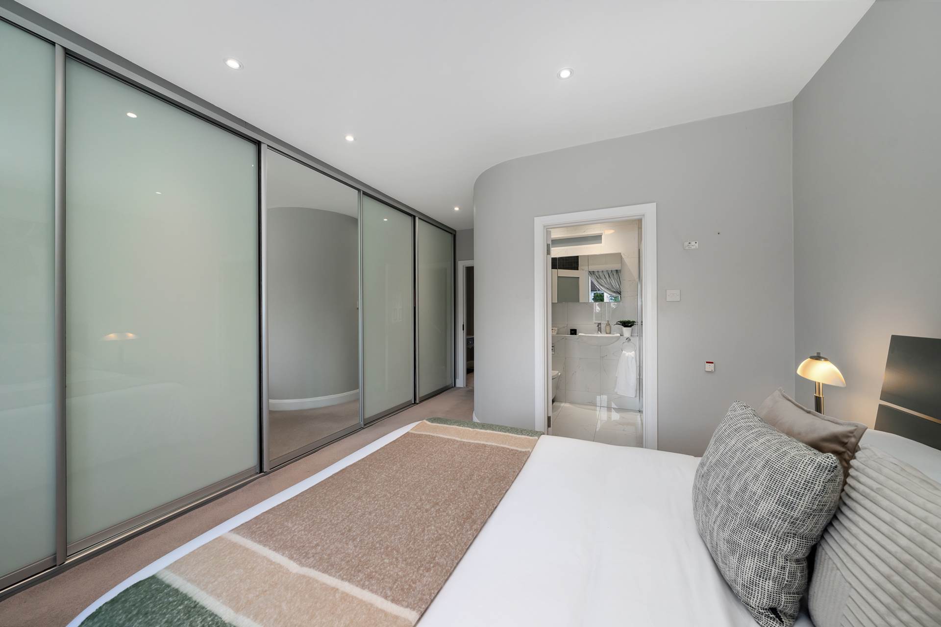Two windows to front. Curtains. Blinds. Sliderobes extending all along one side, providing superb storage. Recessed lighting. Carpet. curved wall to ensuite.