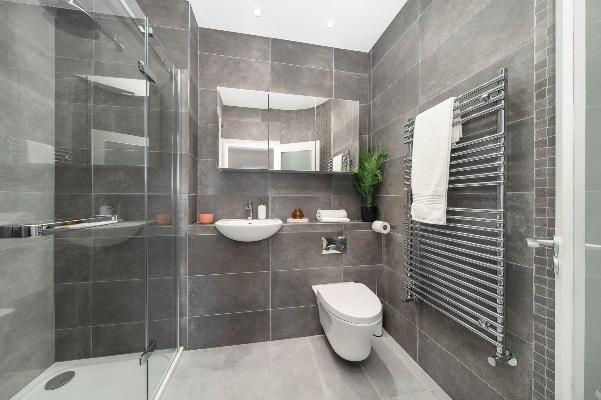 Fully tiled - grey tiling. Skylight. High quality NK Porcellanosa white suite. Lit vanity mirror / medicine cabinet. Heated towel rail. Eaves access.