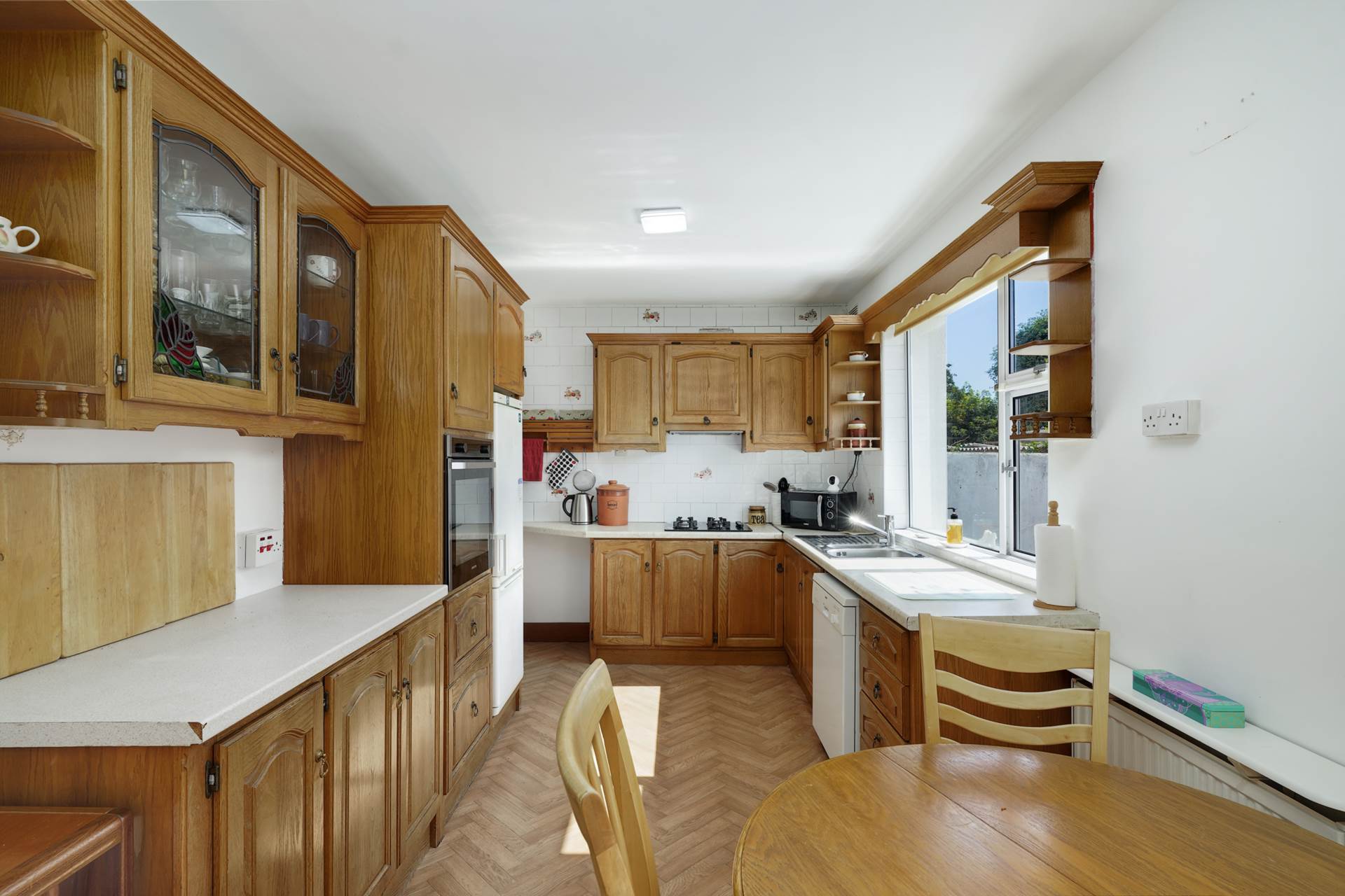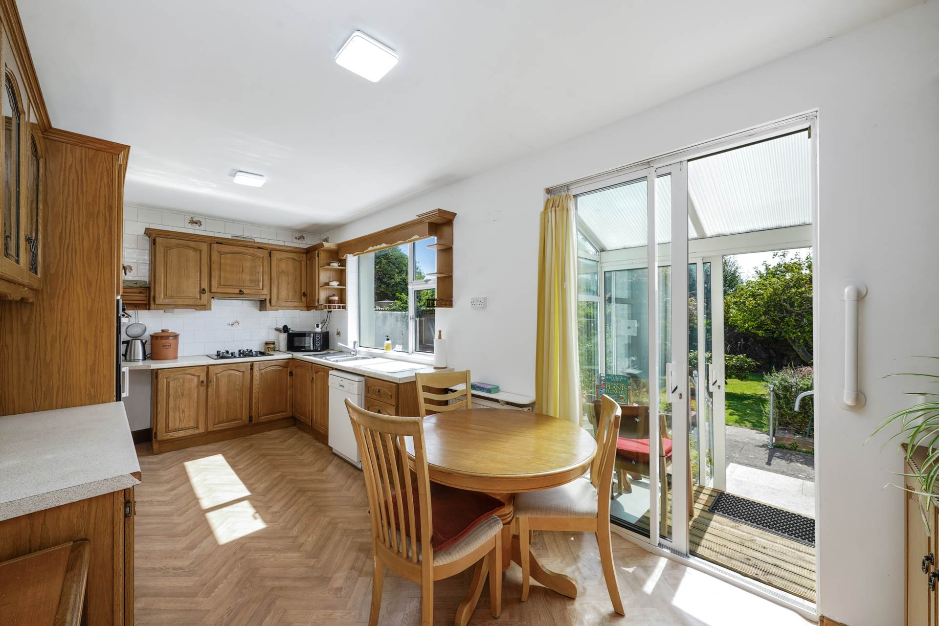 Fitted kitchen with solid oak doors. Large kitchen window.Stainless steel sink with rinse bowl and draining board. Eye level oven. Separate gas hob, hood, firdge/freezer, dishwasher, Two large saucepan drawers. Display cabinet. Tile splashback wall with fruit bowl motifs. Patio doors to rear sun porch. Door to garage.