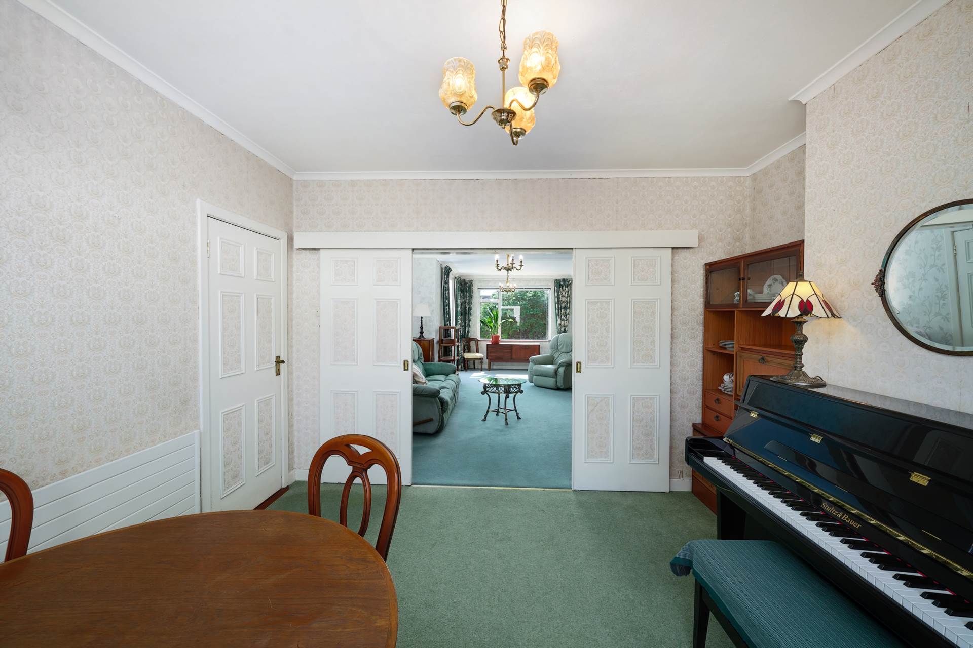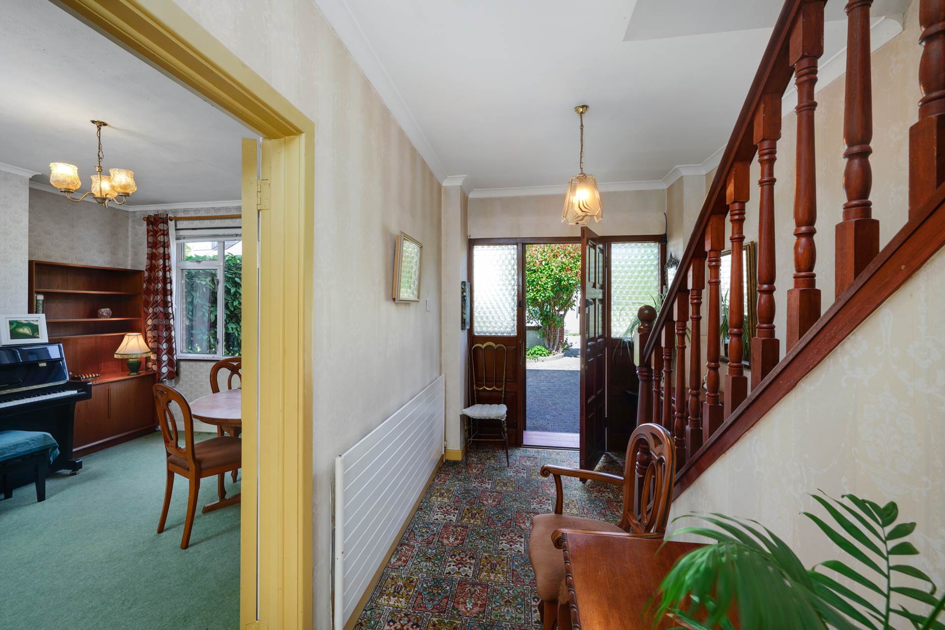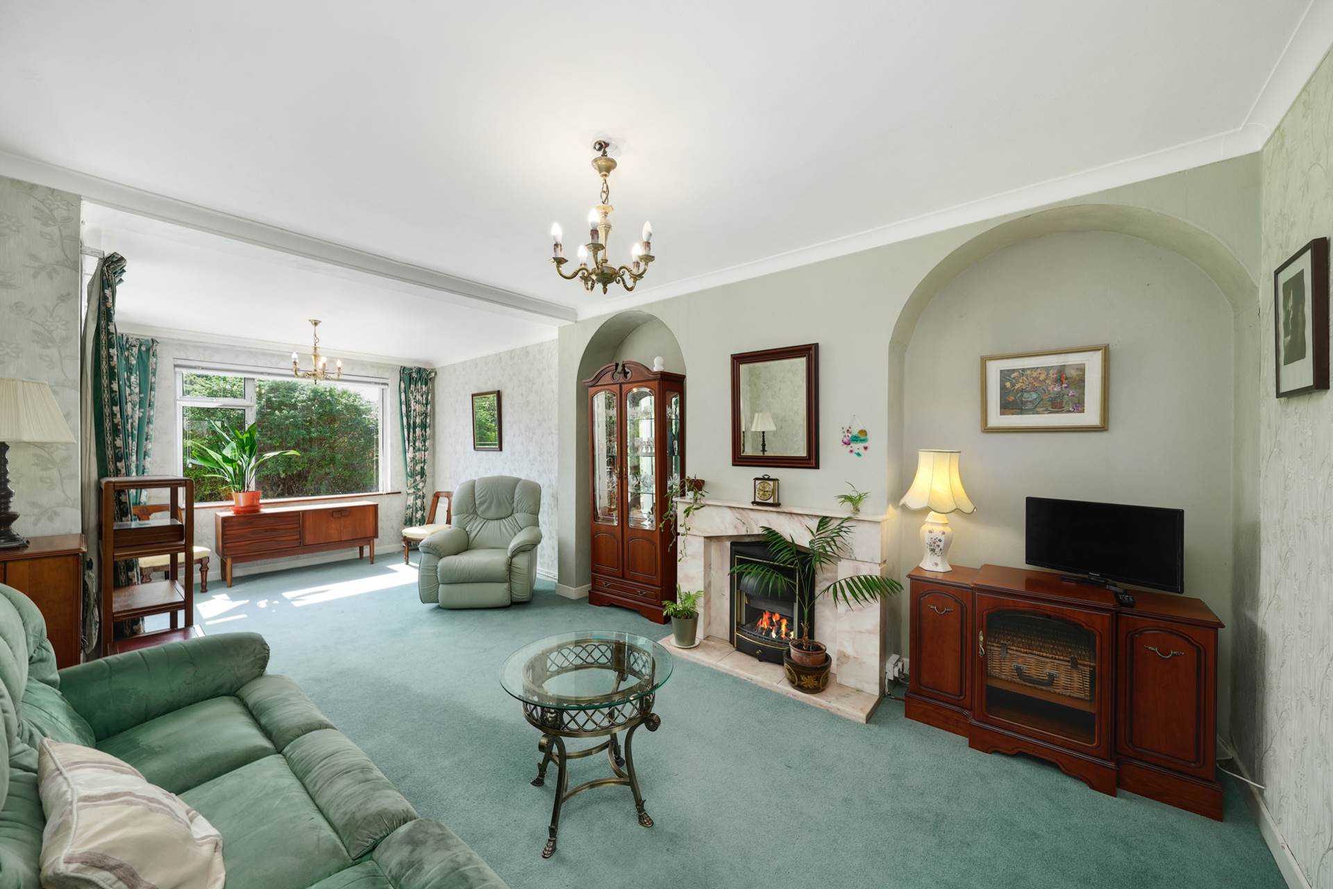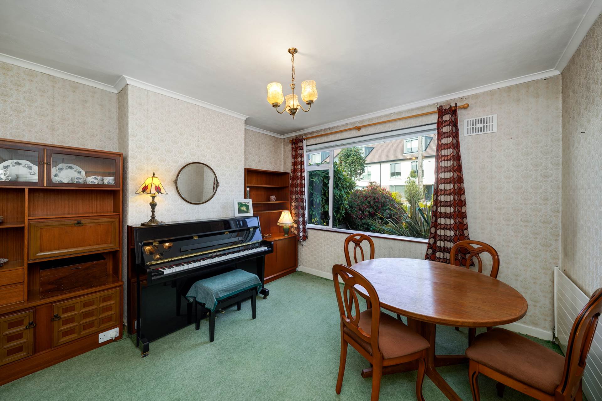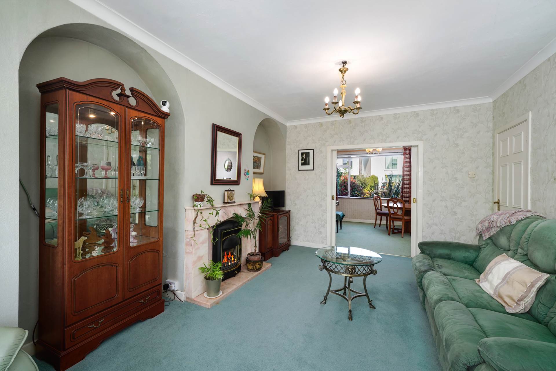 Stretching the full depth of the house and extended to the rear. Front room 3.65m long used as a music and formal dining room. Rear room 3.97m long with an atttractive pink marble fireplace flanked by two feature arches. Extension 3.30m long with a sliding patio door to the back garden and a SW facing garden window.Curtains. Coving.