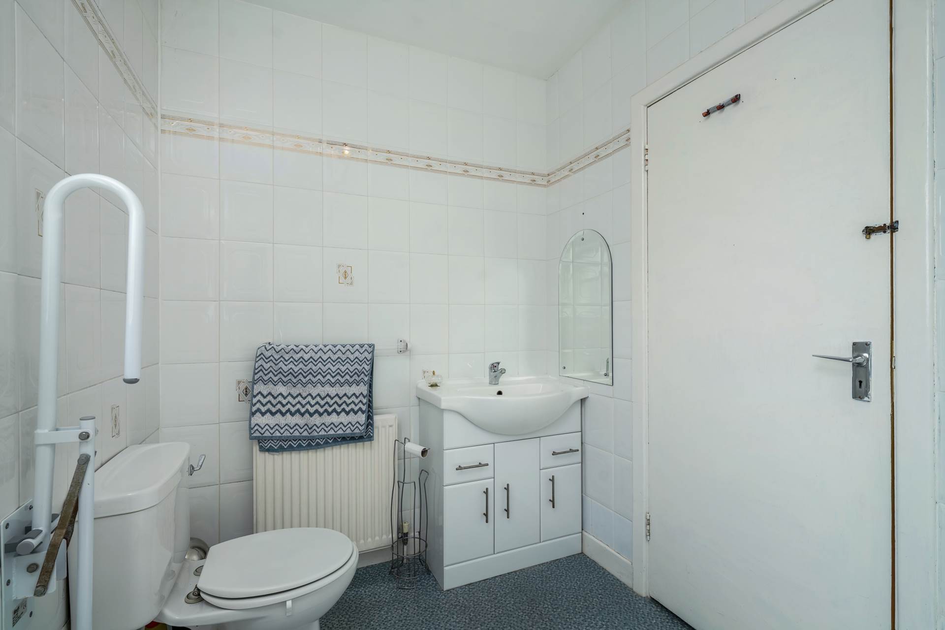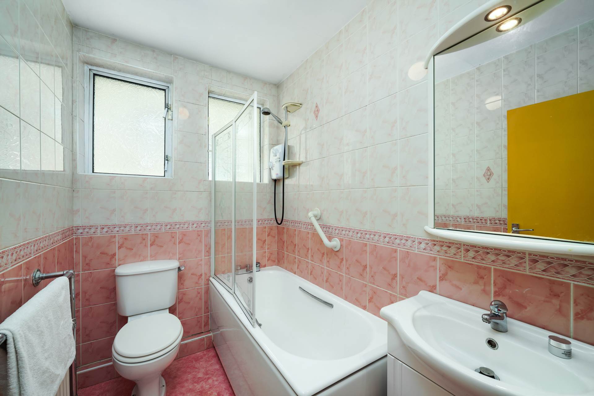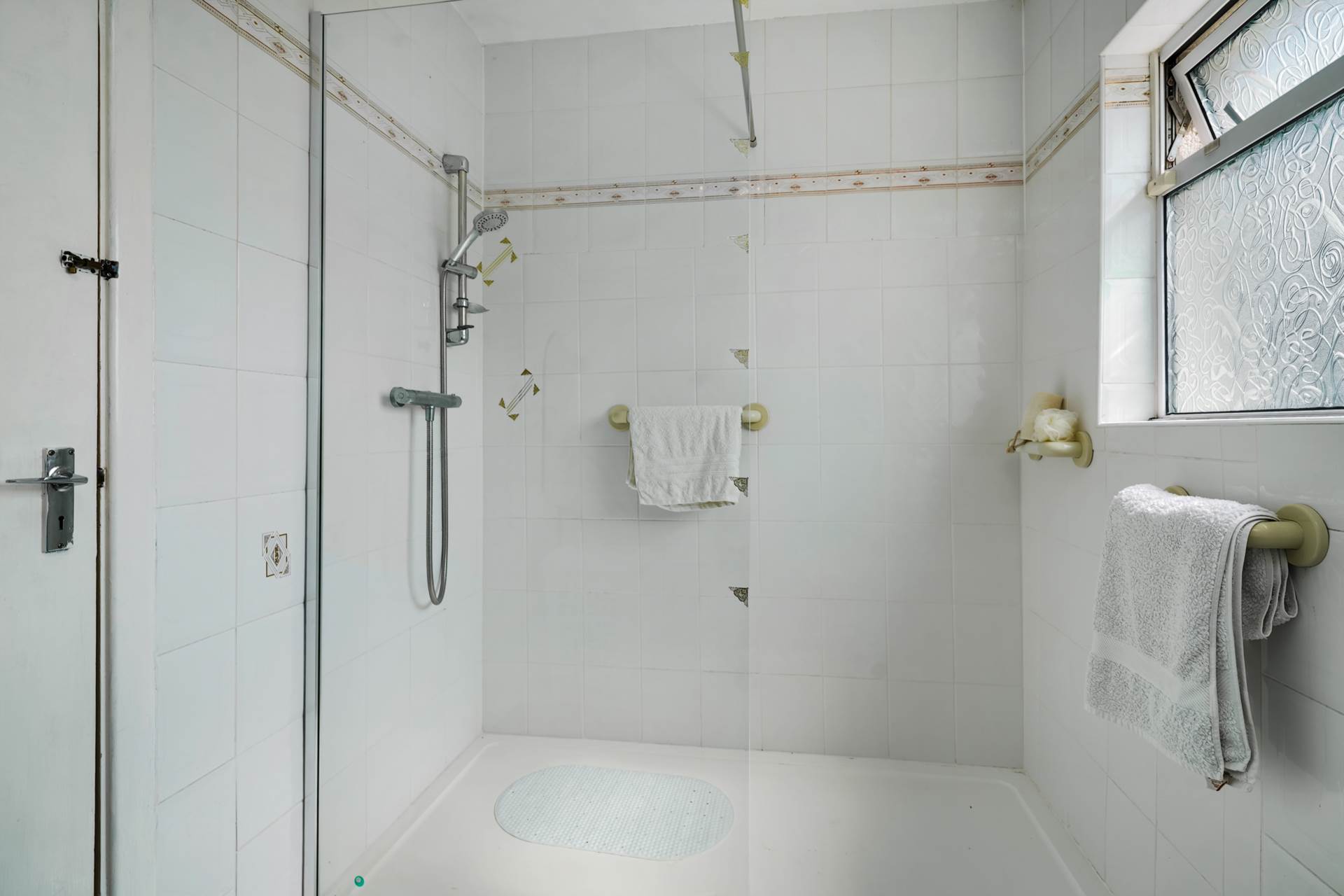 Bath tub with wall-mounted Dimplex electric shower and shower screen. WC. WHB. Heated towel rail. Tiled walls. Two frosted glass windows.