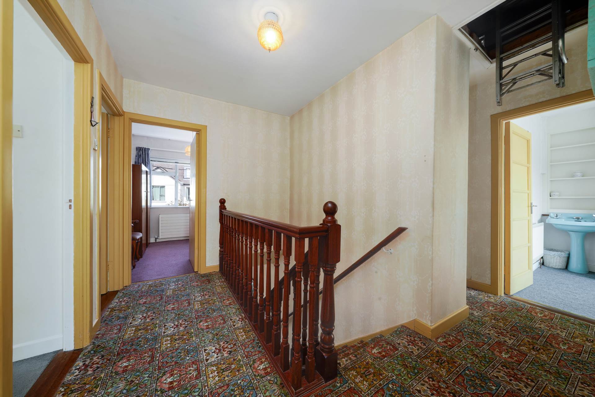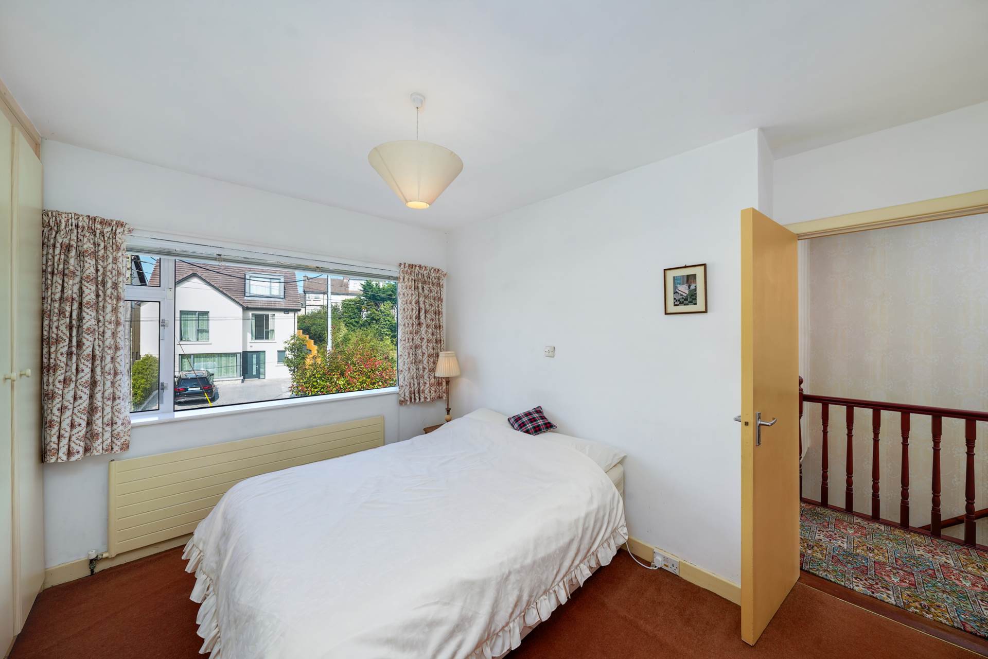 Double landing wrapping around into the extension over the garage. Carpet over pine floorboards. Attic access. Hot press with factory insulated hot water cylinder. Linen press in extension.
