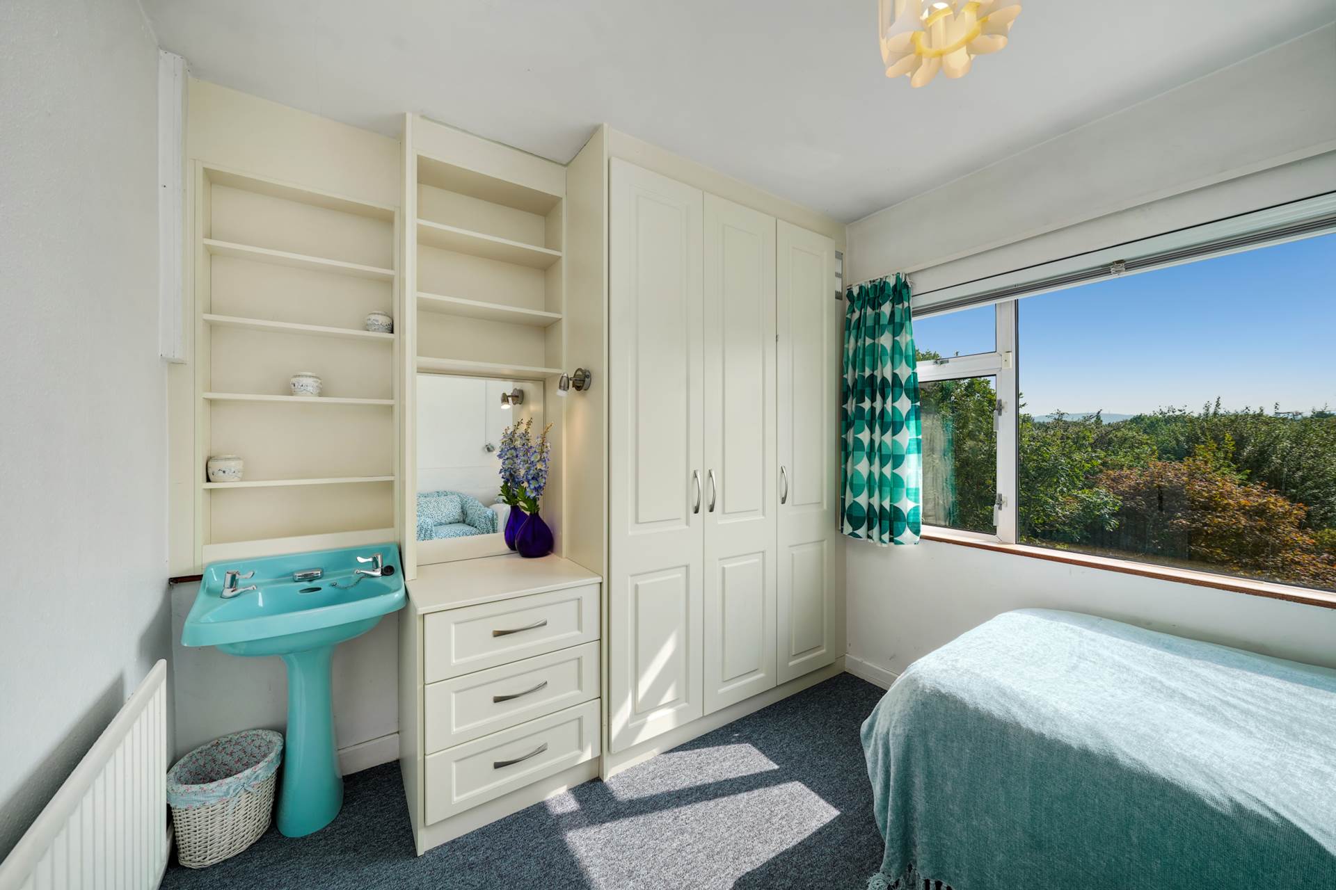 Carpet over pine floorboards. Reading light. WHB with vanity light and mirror.Fitted wardrobes. Integrated dressing table. Shelving. Window to rear.