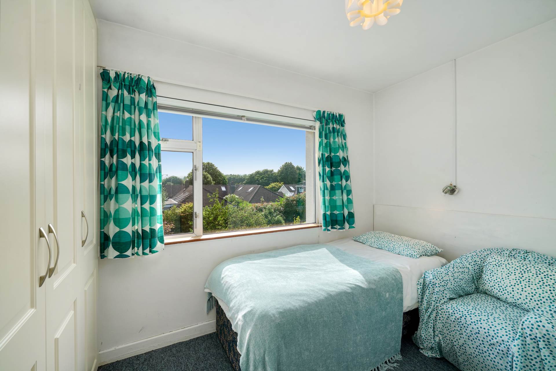 Carpet over pine floorboards. Fitted wardrobes with integrated dressing table. Reading light over the bed. Window to rear.