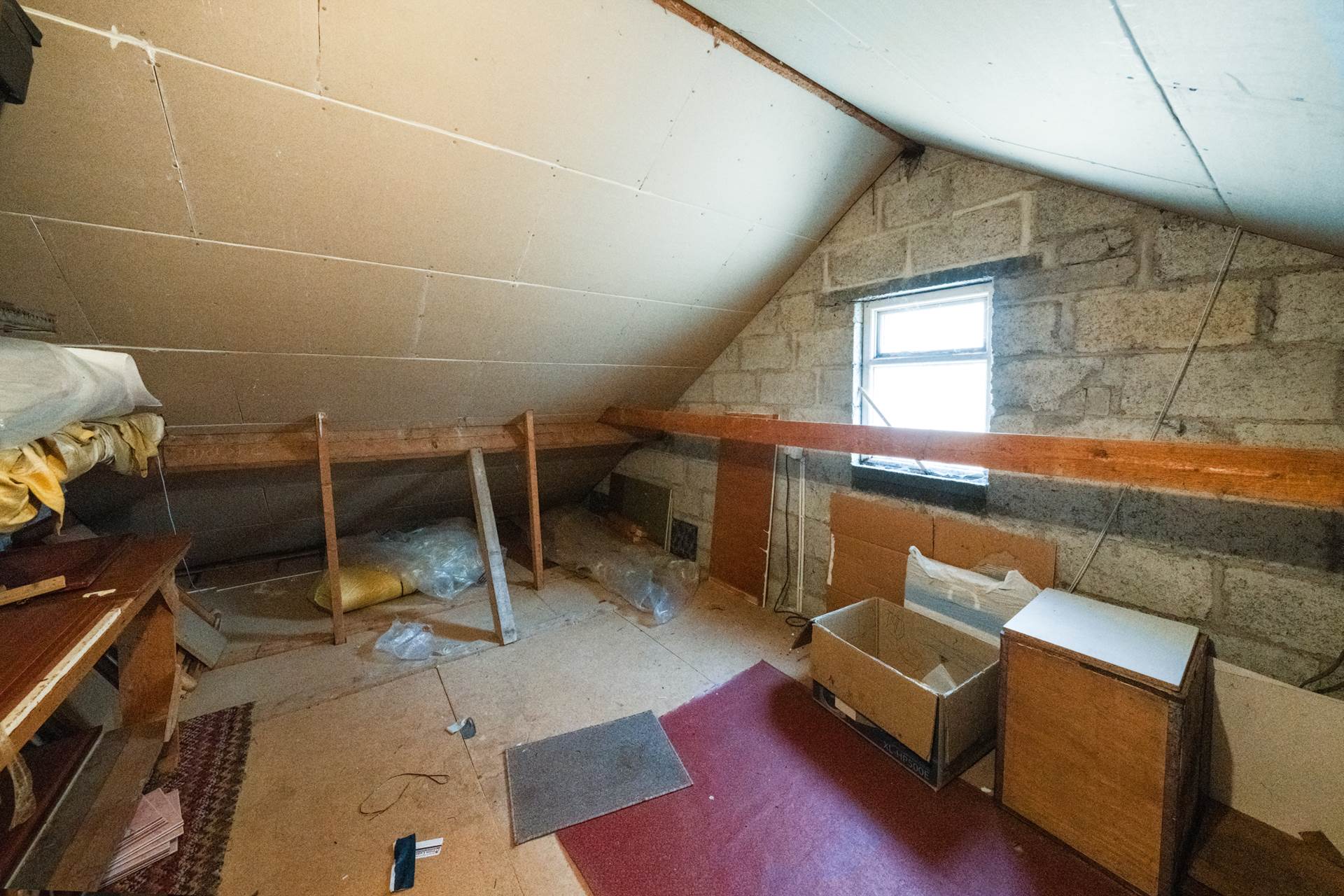 Accessed by retractable ladder from landing. Apex height 2.65m. Gable window. This is the attic over the extension. There is another attic over the main house accessed via a hatch from the bathroom. This would be the same height. Combined they give the potential for an enormous amount of extra habitable space (S.P.P.) as has been done in some similar properties in the area.