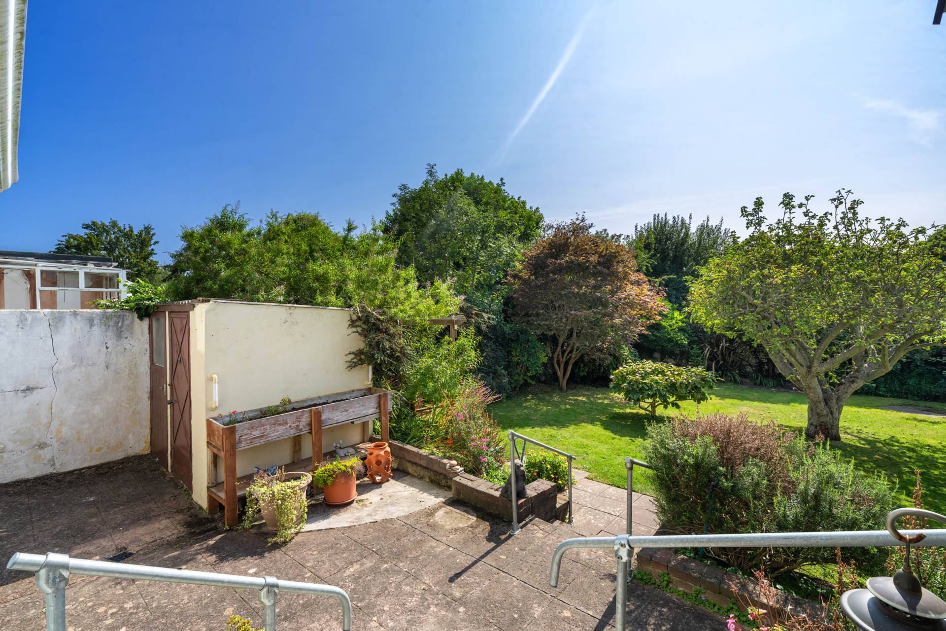 Spacious SW facing back garden. Apple tree. Large lawn. Swing bench. Maple tree. Fuschia. Colourful borders.Sunny patio area. Two block built sheds - originally a fuel store and outside loo. Side passage.