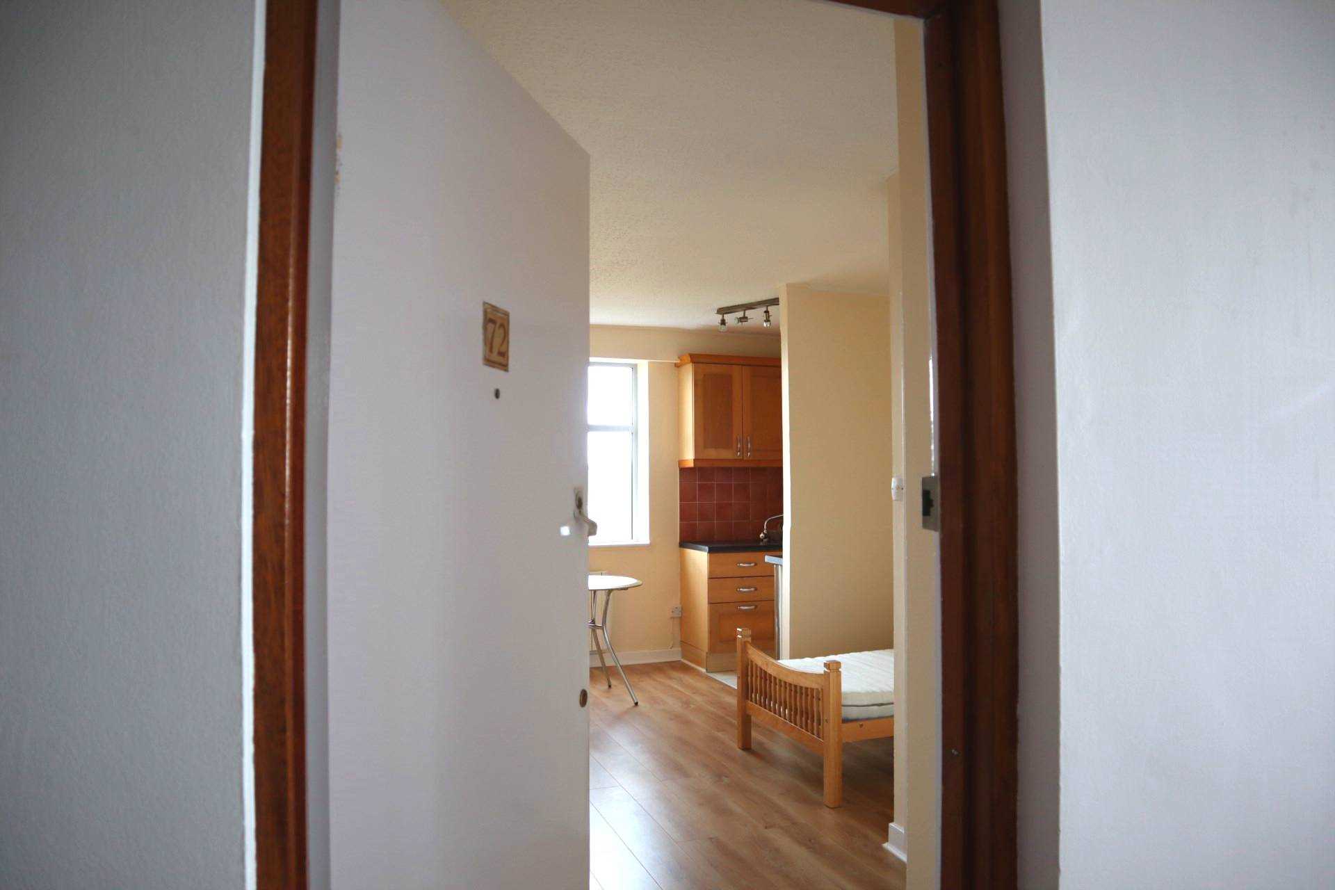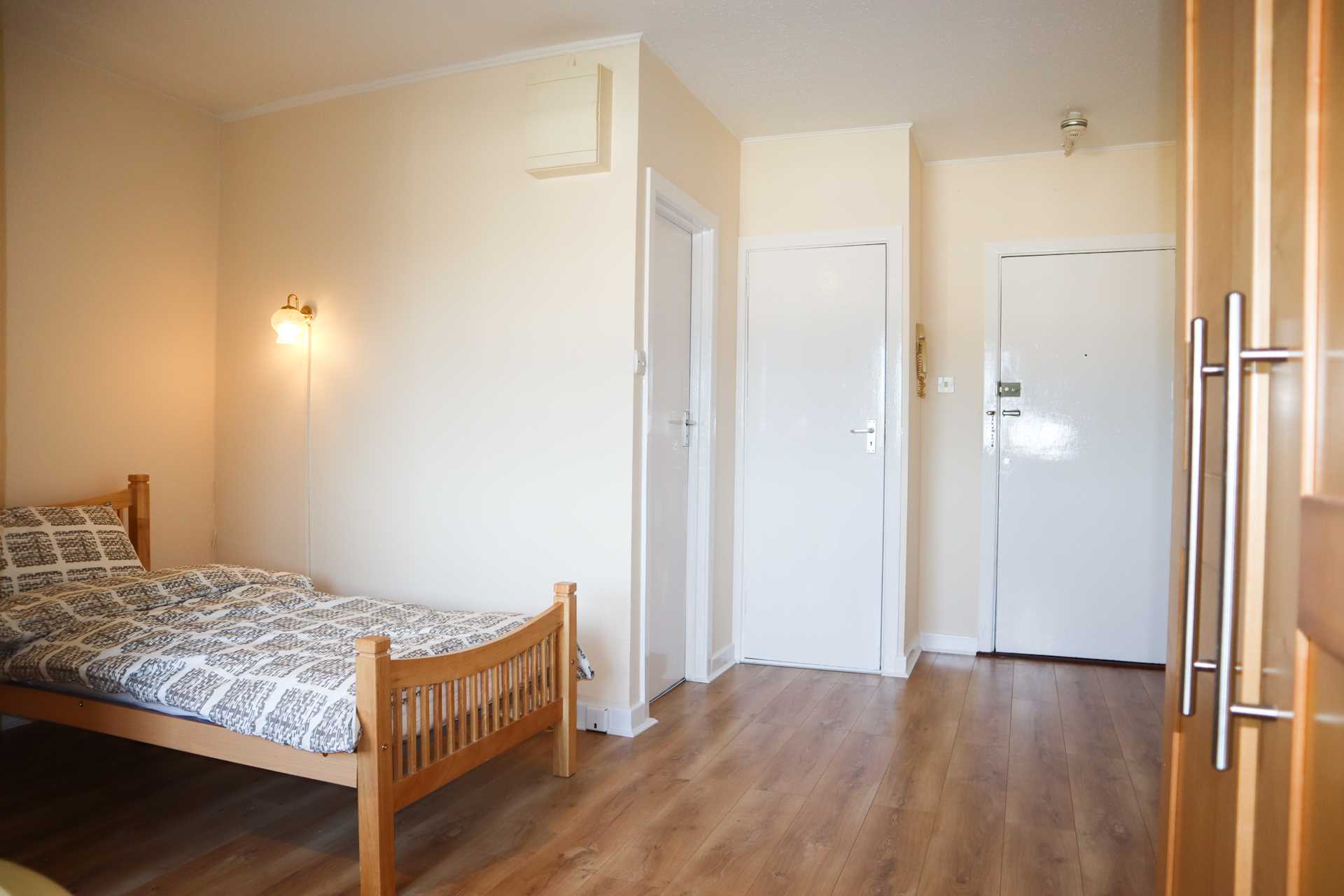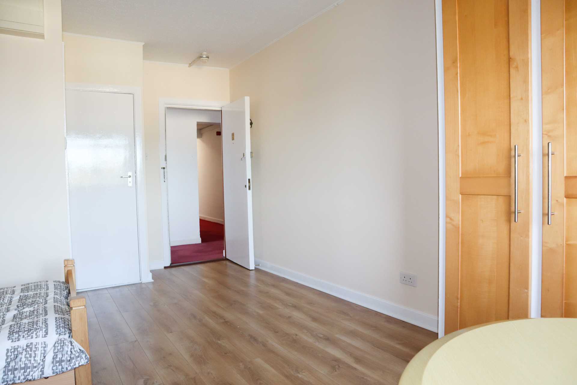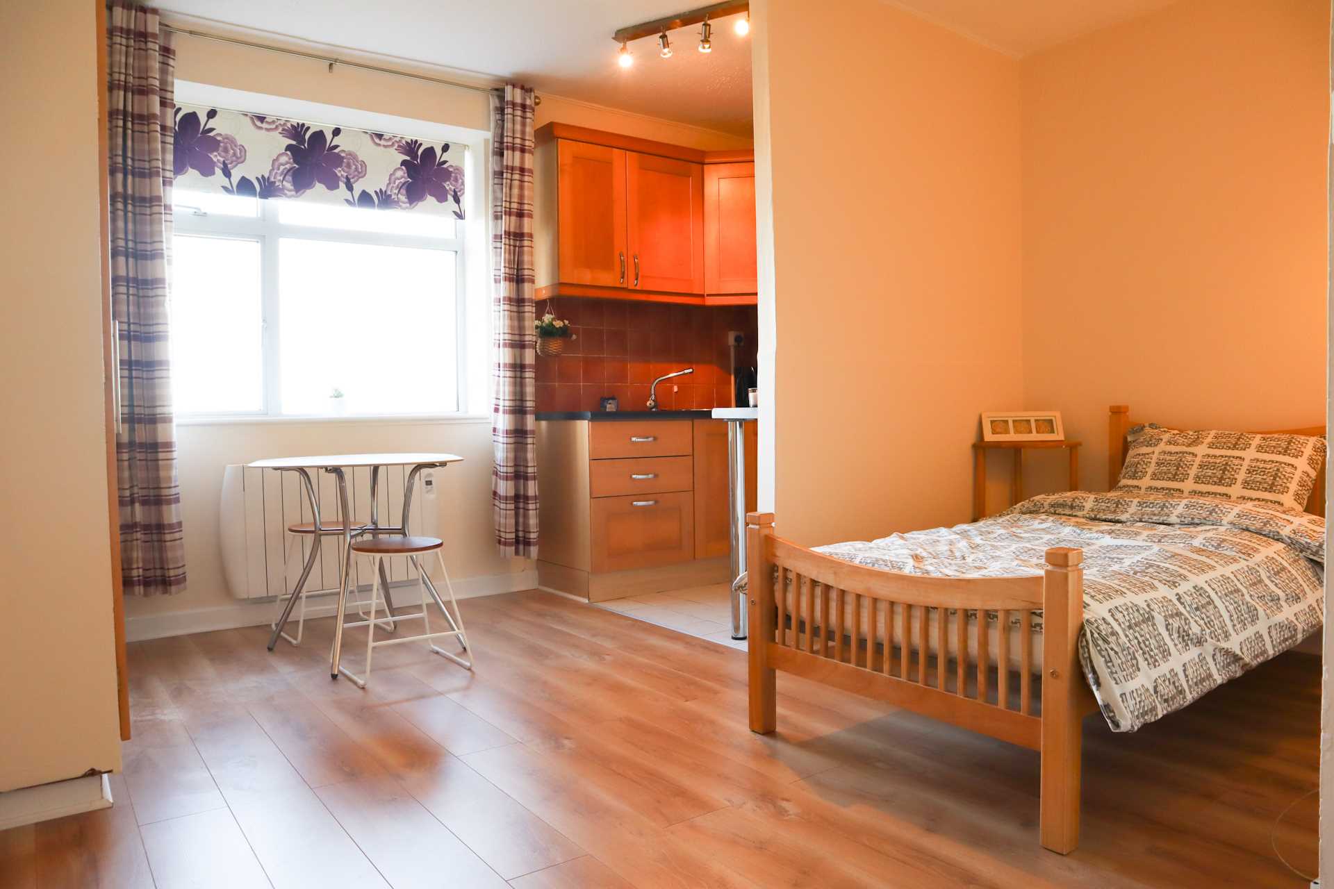 Studio apartment with open-plan living/dining area with two alcoves for the kitchen and for the sleeping area. Fitted wardrobes. Wood laminate flooring.