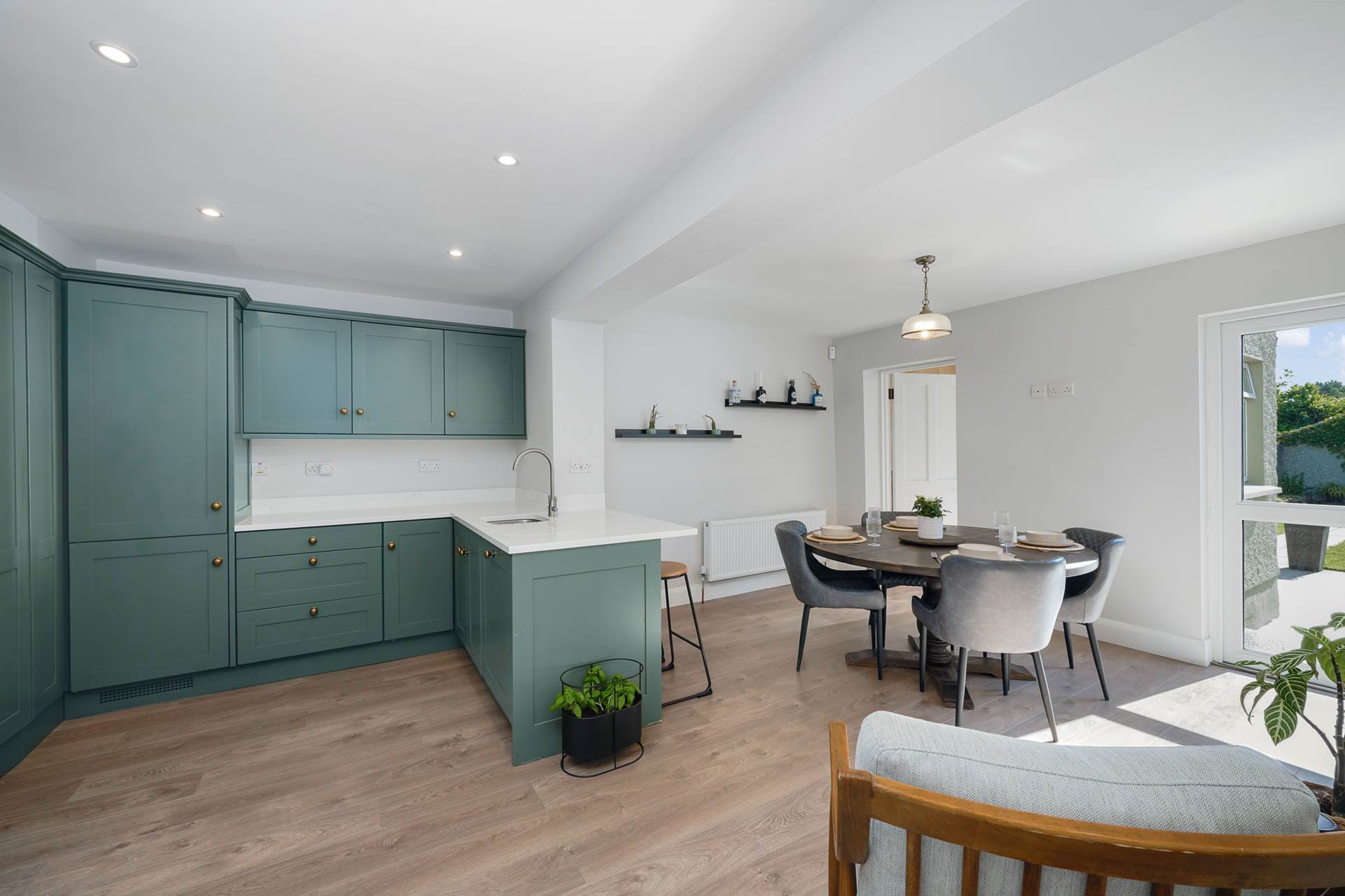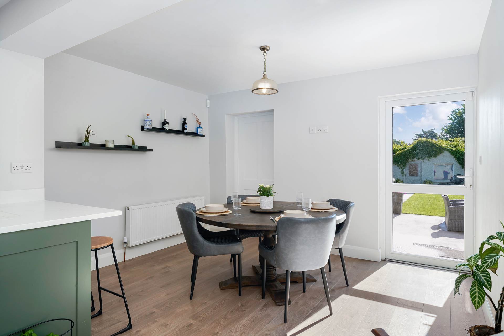 This home has a delightful open-plan kitchen/dining room with a new shaker style kitchen, handy larder, breakfast bar and bright food preparation area. The white marble counter -tops and splashback contrast beautifully with the kitchen cabinets. Throughout the ground floor there is high quality 30 year water resistant, wood laminate flooring.