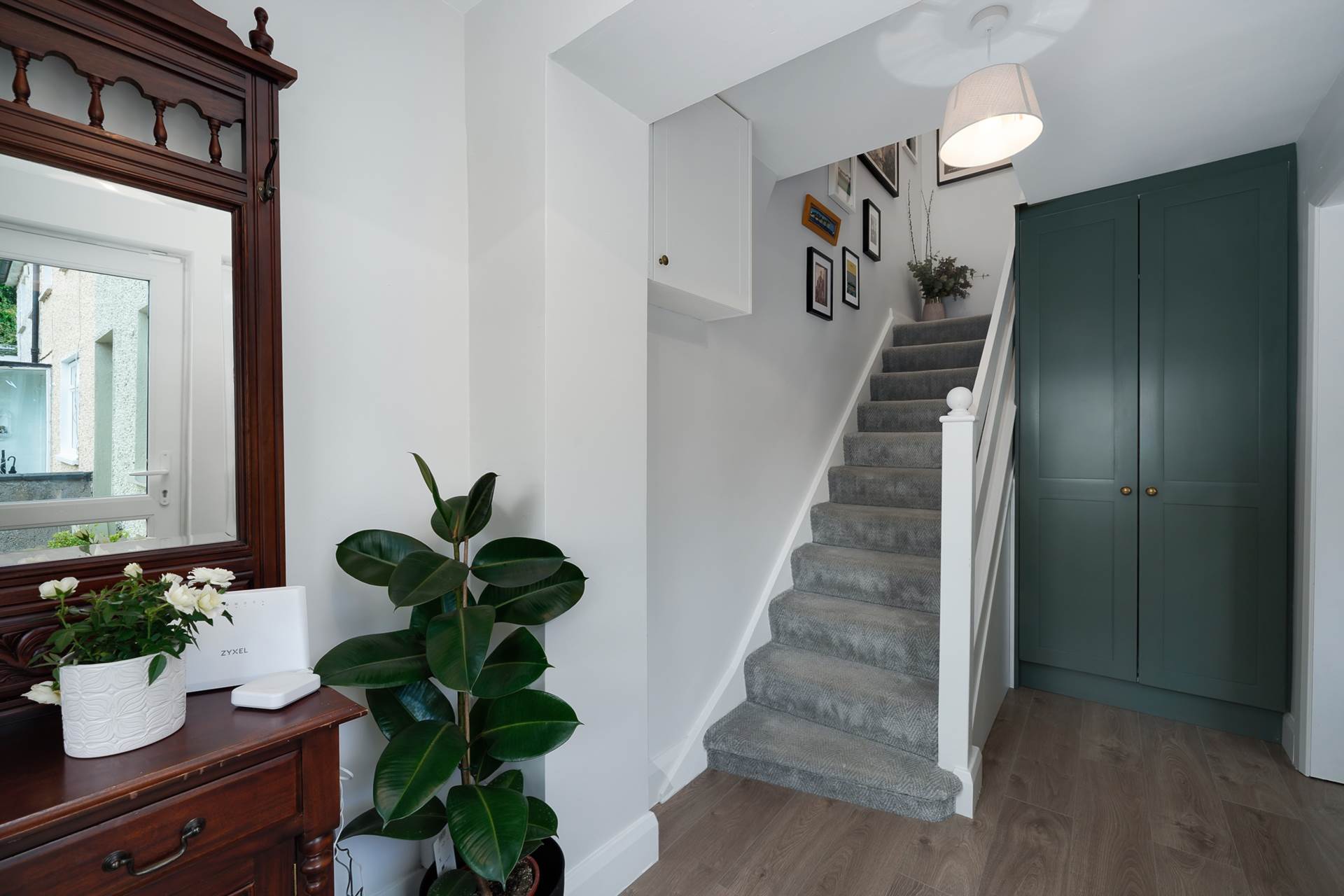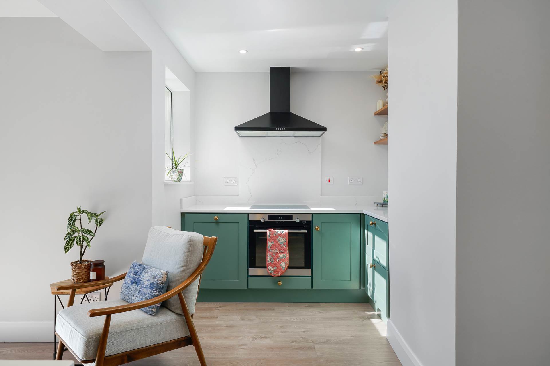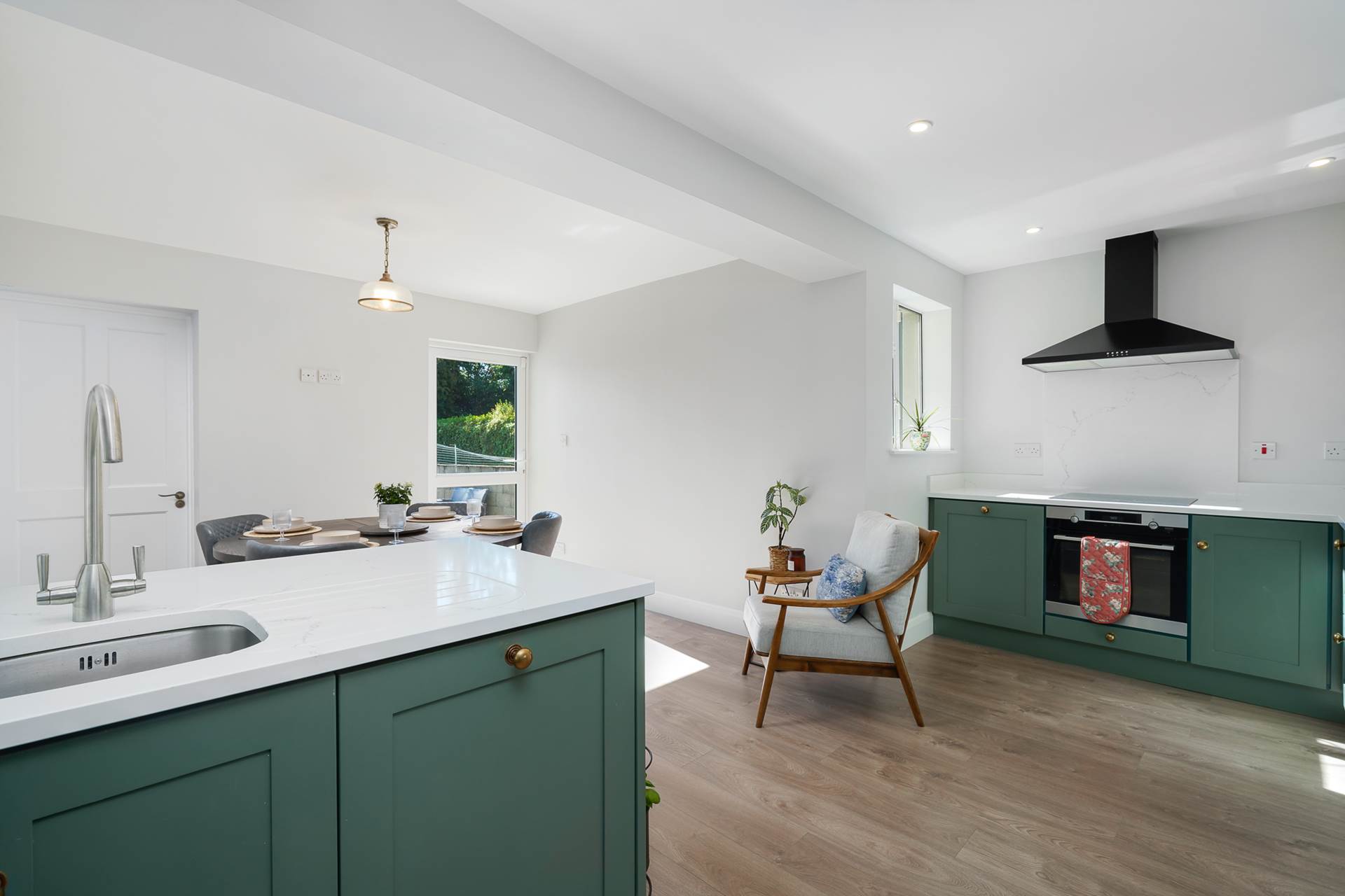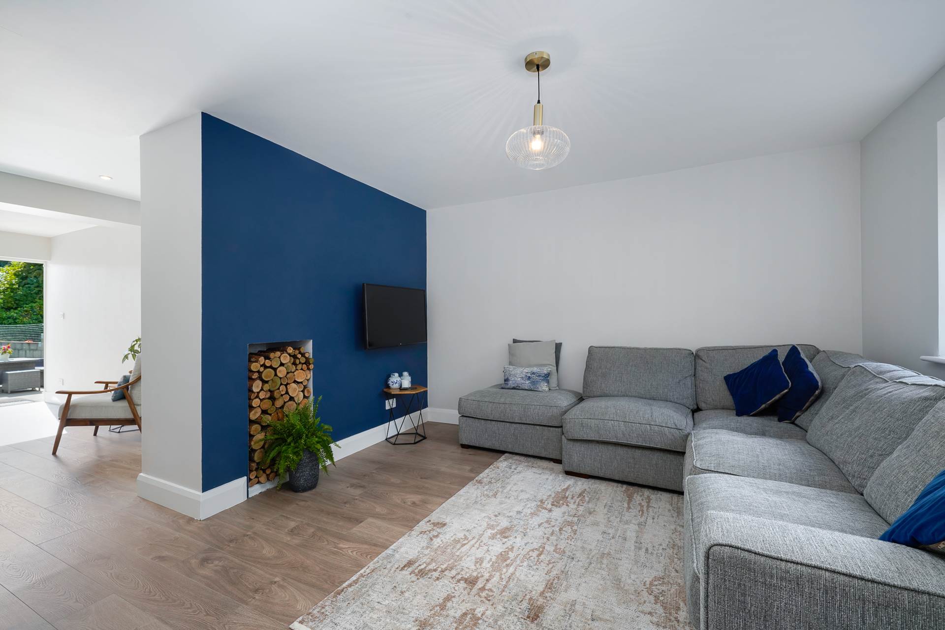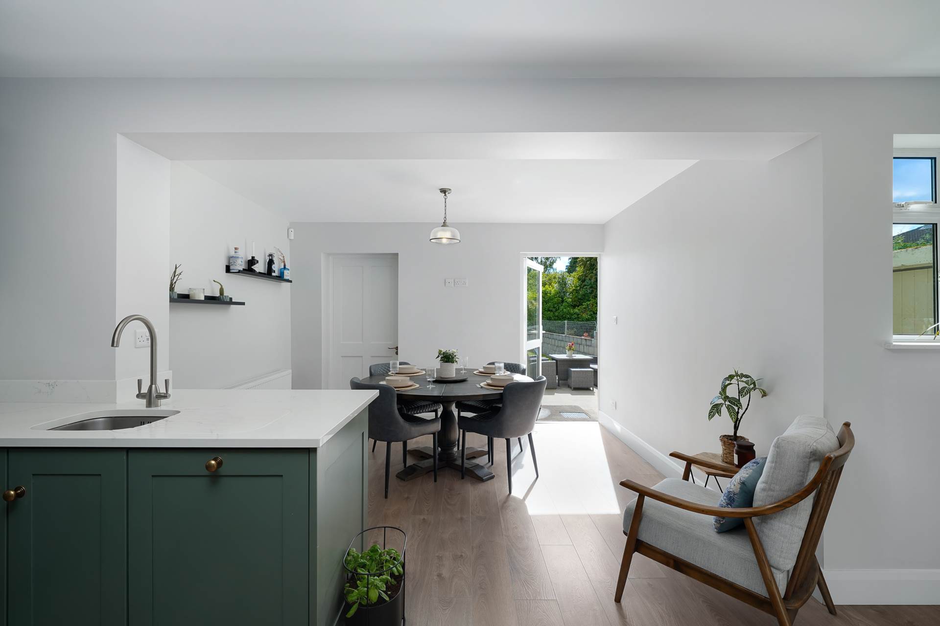 Maintaining the open-plan theme the door from the sitting room has been widened to create a larger opening connecting these two spaces. The original fireplace in the sitting room has been removed and instead there is an opening with a flue, prepared for a solid fuel stove.