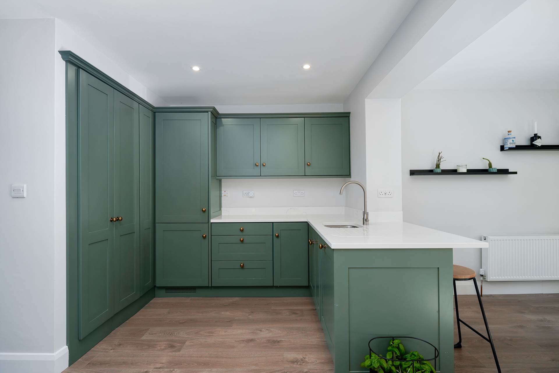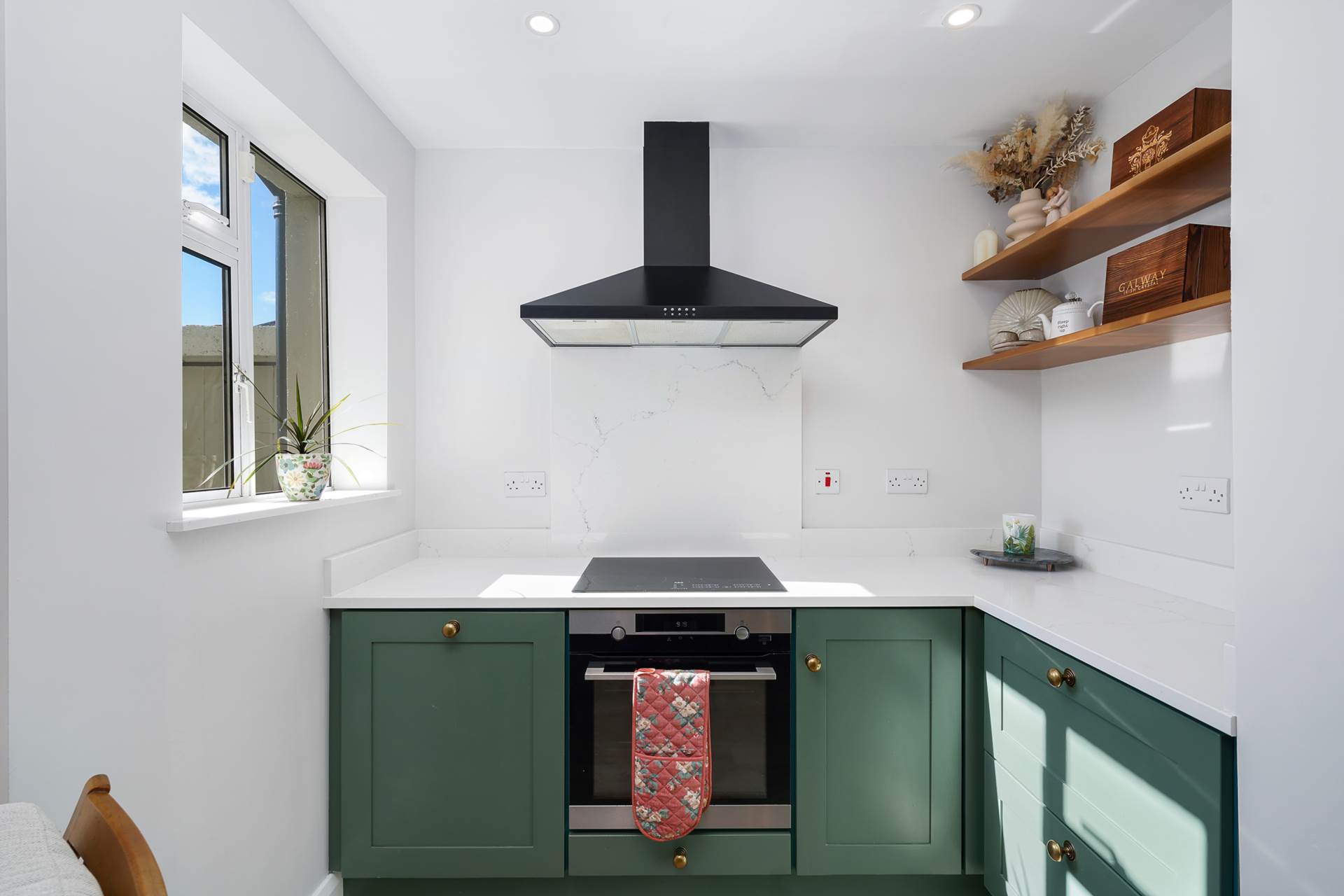 Superbly designed shaker style kitchen in green/grey with contrasting white marble counter tops. Breakfast bar. Sink with mixer tap. Lovely bright food preparation area with adjacent window. Integrated appliances included in sale - fridge-freezer, dishwasher, oven, hob. Large black steel hood. easy clean white marble splashback. Glazed door to back garden.