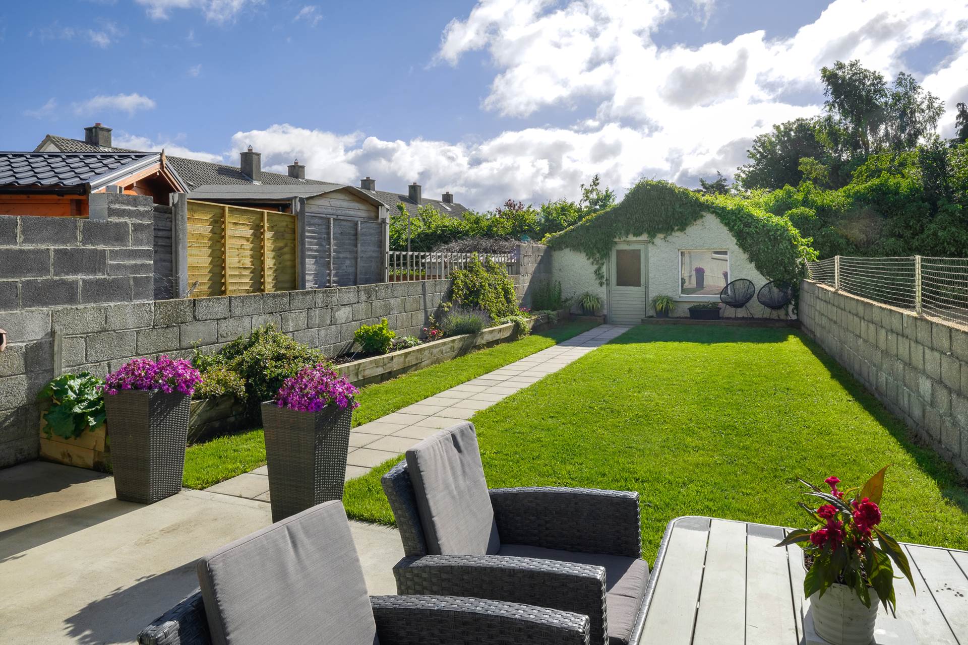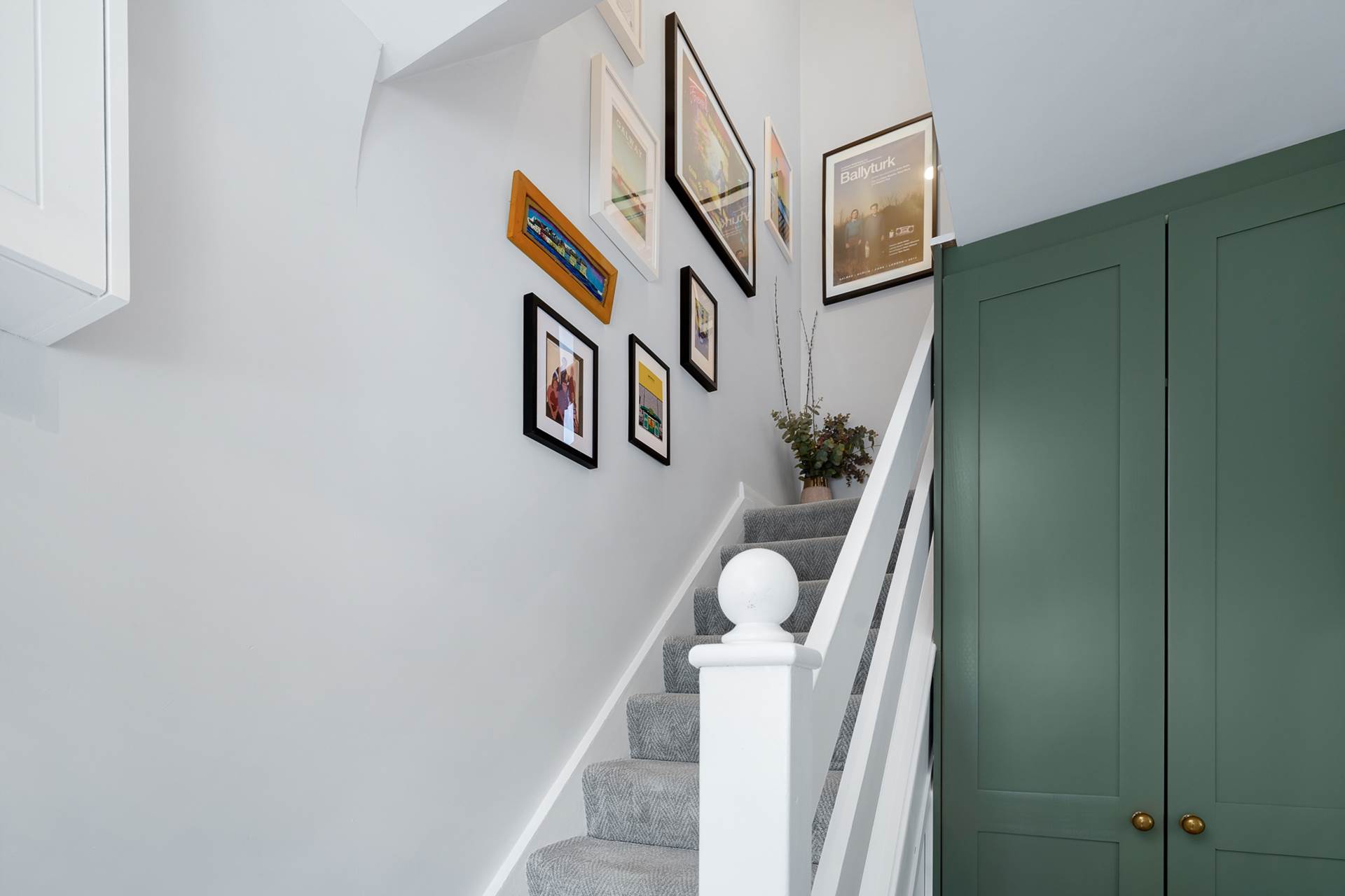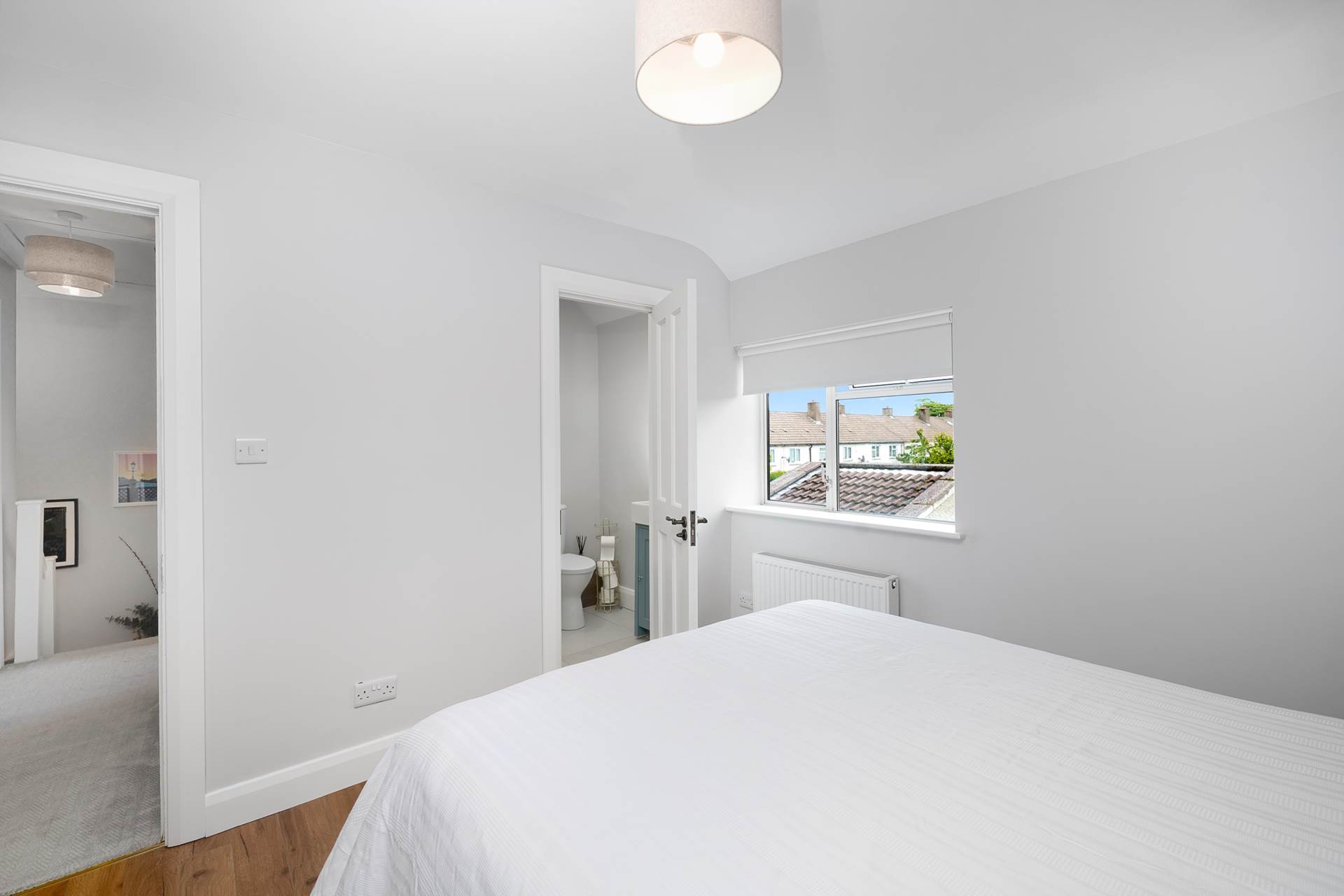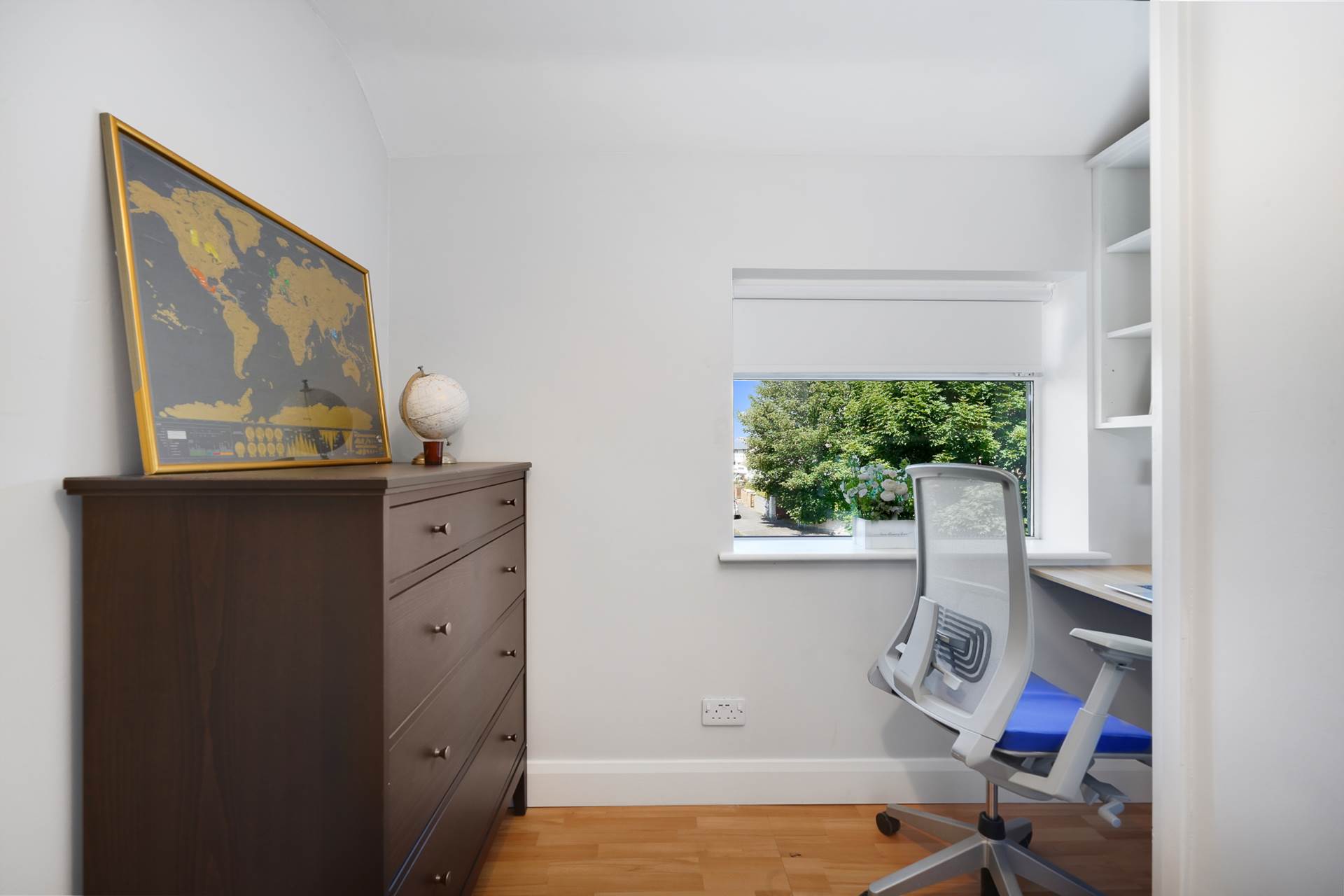 Upstairs are four bedrooms, with a lovely modern master ensuite. The hot press has been converted to a wardrobe for one of the bedrooms. The space over the stairs has been fitted out as a home office with fitted desk and shelving. If this is needed as a 4th bedroom, these could be removed to fit the head of a single bed. From the landing a retractable ladder leads to the spacious attic with an apex height over 6ft.