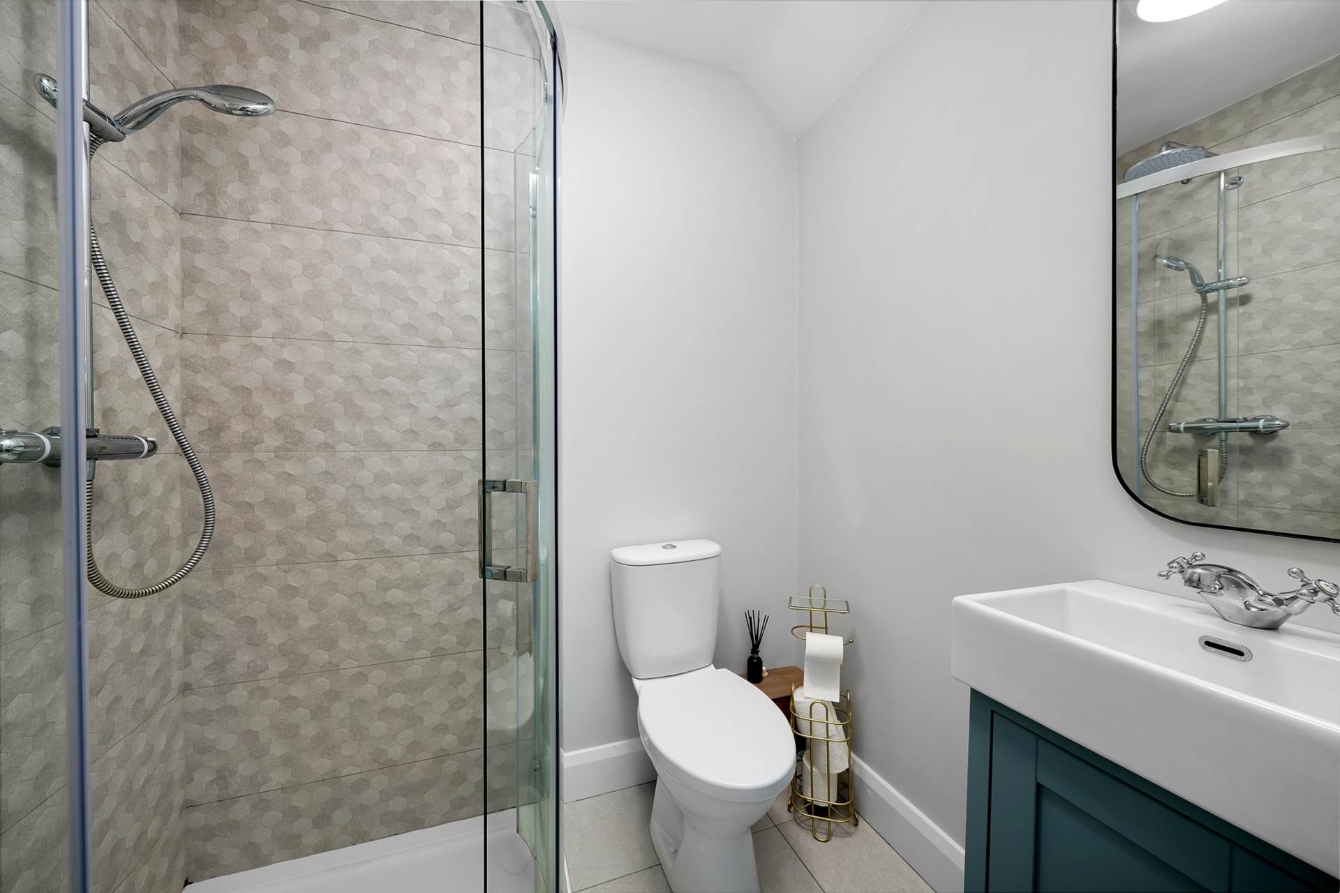 Modern ensuite with corner shower, WHB with cabinet under and vanity mirror. WC. Tiled floor. Extractor fan.