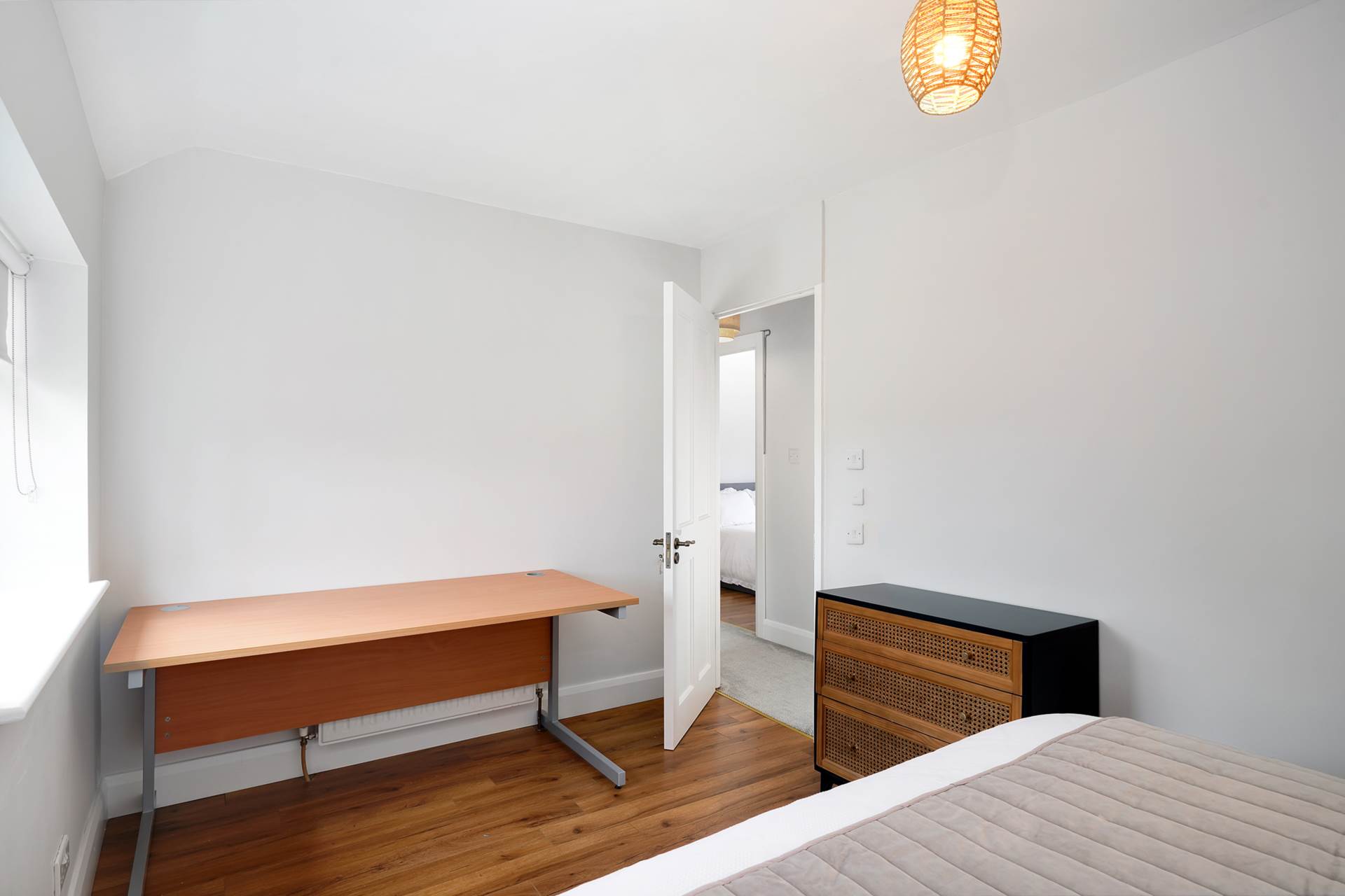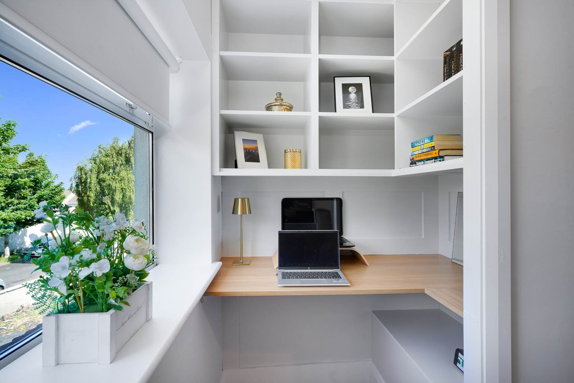 Currently in use as a home office. Window to front. Wood laminate flooring. Alcove above the stairs with fitted desk and shelving.