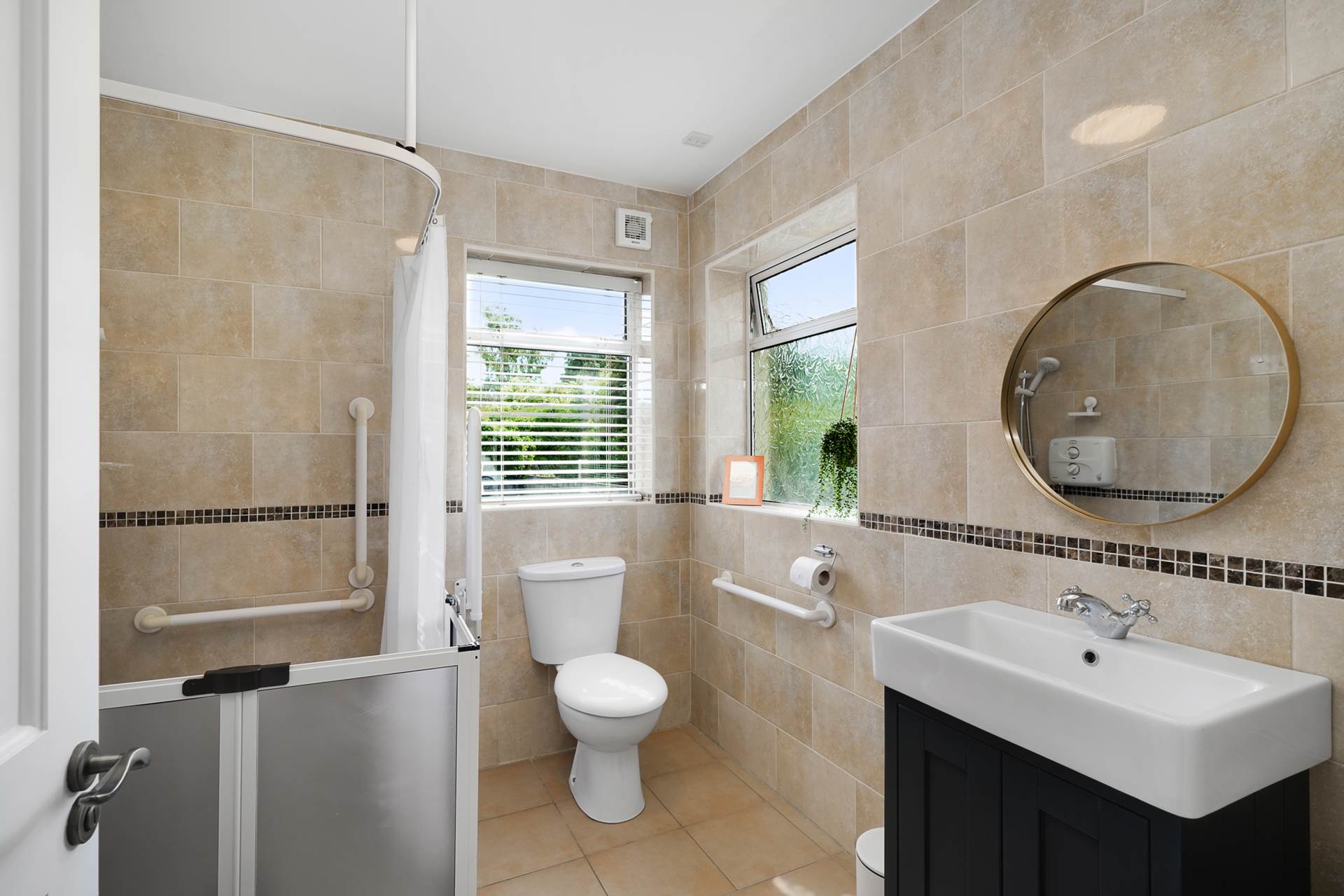 Fully tiled accessible wet room with assistance grips. Walk-in shower. Triton T90Z electric shower. WC. WHB with cabinet underneath. Heated towel rail. Extractor fan.Two windows. Pitched roof.