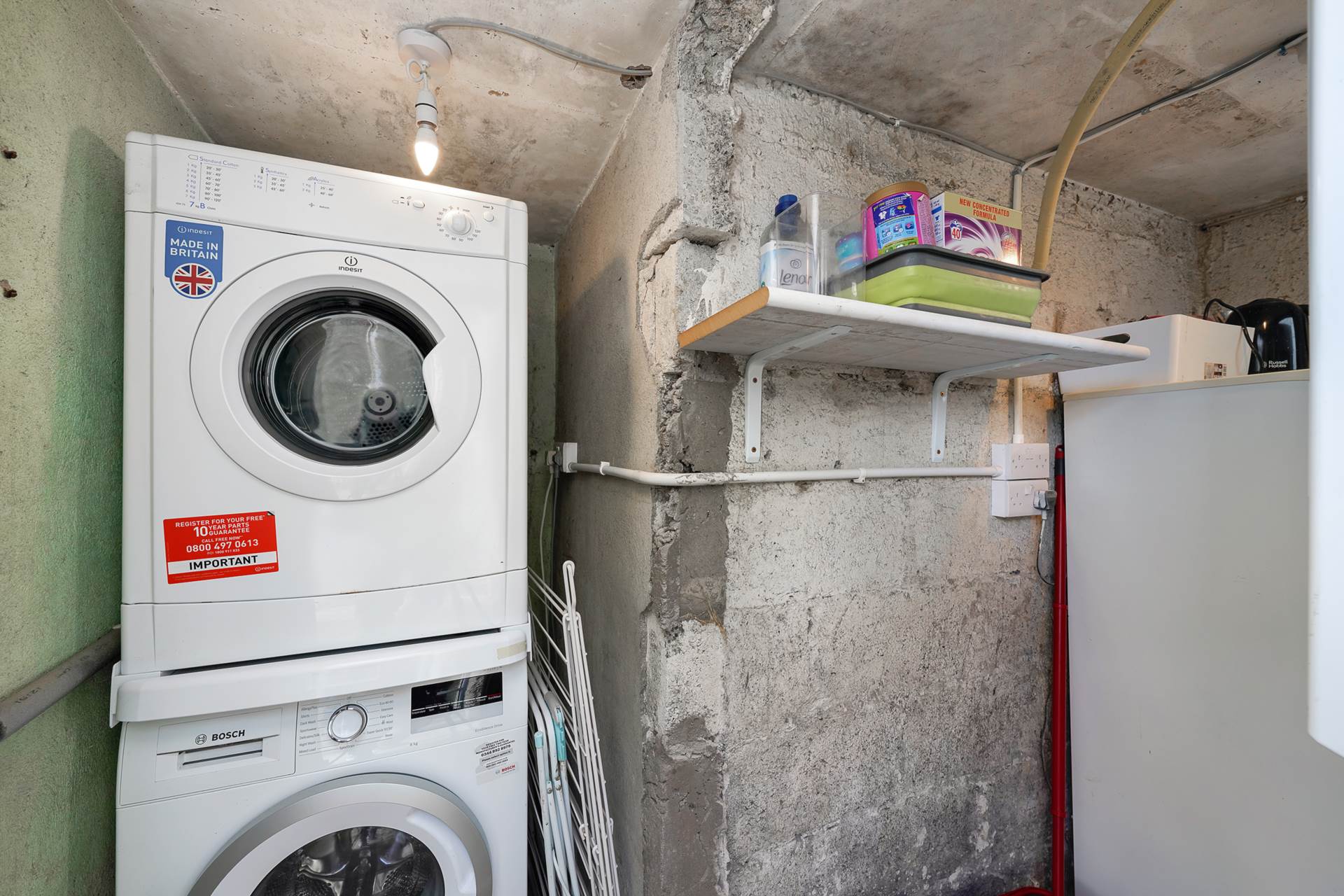 Block built shed with two doors. One leads to what used to be the outside WC, which is now plumbed for a washing machine and dryer. The other used to lead to teh fuel store, which now houses an upright freezer (not included in sale), Combi boiler for GFCH.