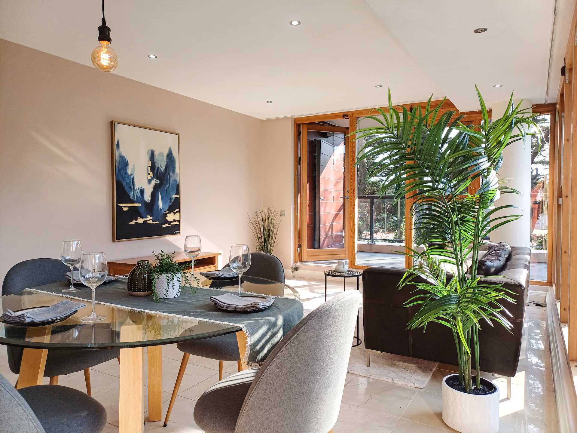 This is a beautifully bright and open space with full height windows along two sides facing towards Leopardstown Park and Tennis Club. It is quite private and not overlooked. Glazed doors lead to a generous SW facing balcony which wraps around to smaller NW facing balcony off the dining area. Polished marble floor. High speed Broadband/TV point. Opening to kitchen.