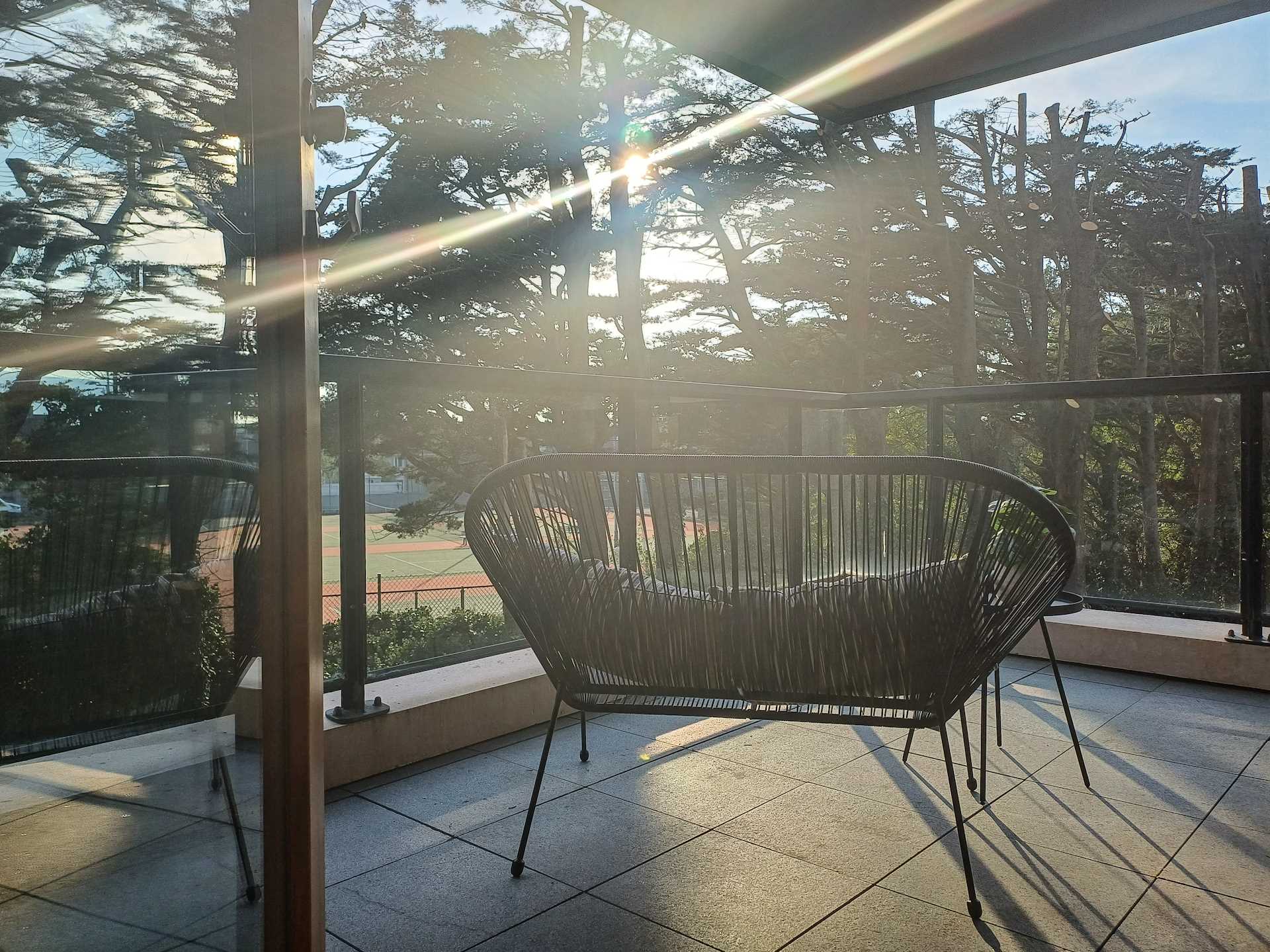 Totally private and very spacious, sunny, SW facing, covered balcony. Glass balustrade. Granite slab flooring. External lighting. Easy maintenance coated steel walls at both ends.