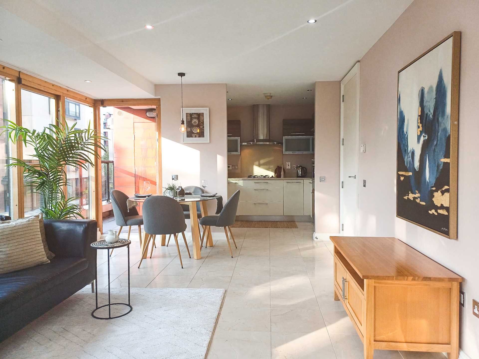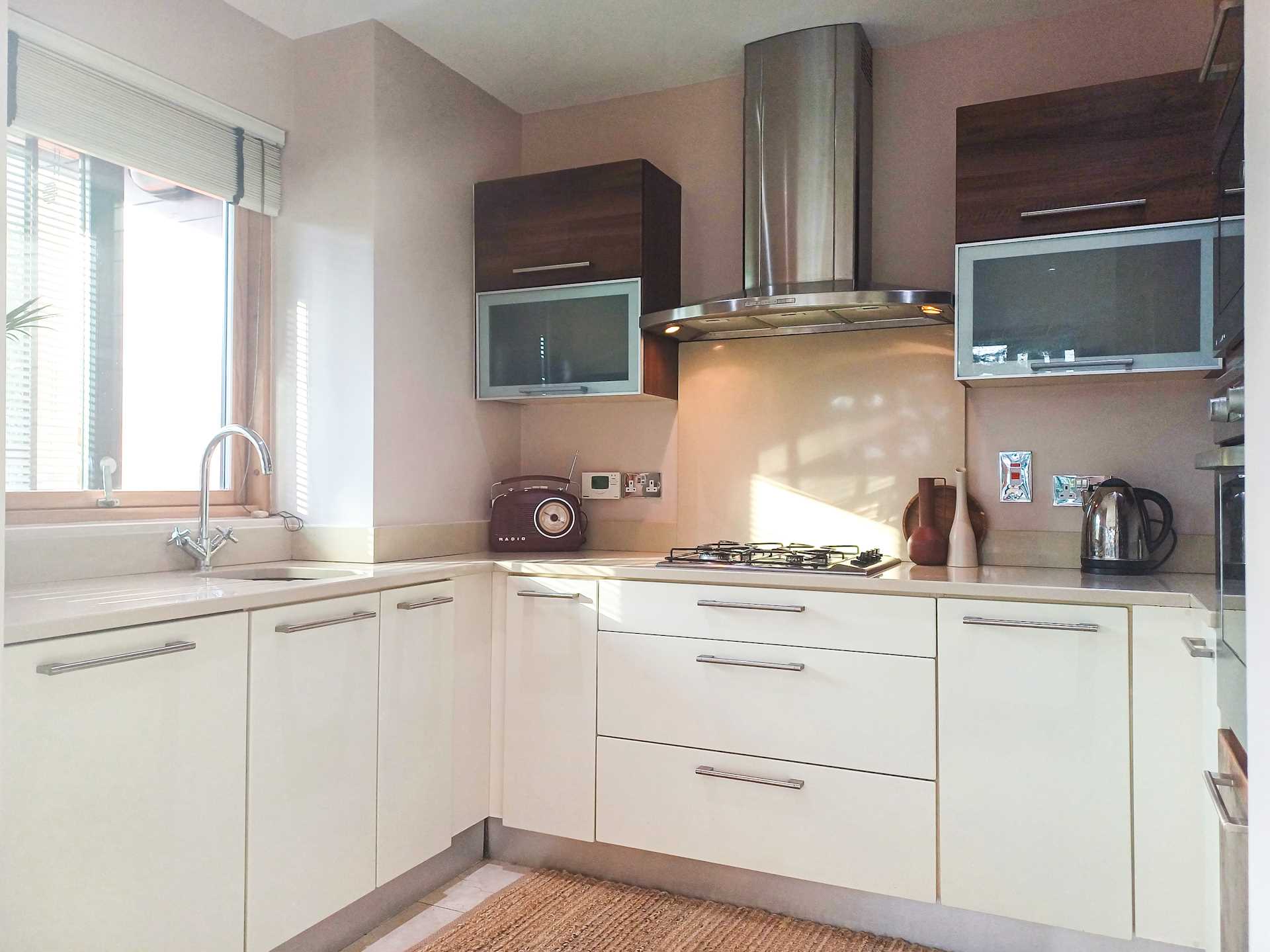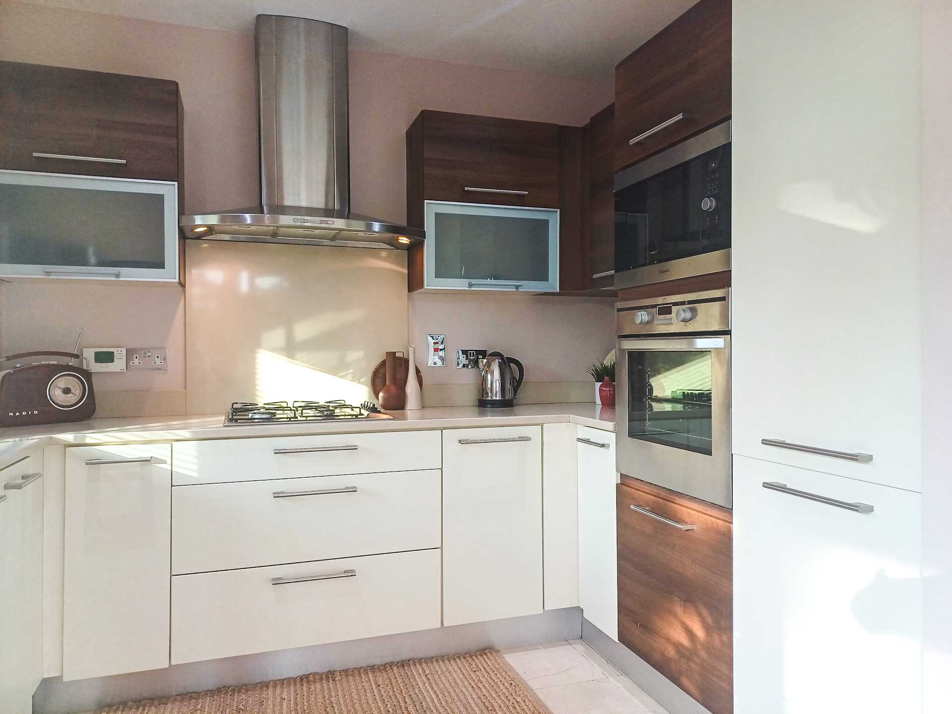 It is finished to exacting standards including polished marble flooring with underfloor heating throughout, a fully equipped high gloss fitted kitchen (with a kitchen window, gas hob, eye-level oven, fitted microwave, fridge/freezer, dishwasher, lit display cabinets), two plush bathrooms, contrasting natural feel wood feature elements in the kitchen and both bathrooms, full height fitted wardrobes in both bedrooms, five different storage spaces including a utility room with a washing machine, high quality wood frame alu-clad double-glazed windows, recessed lighting, and chrome fittings such as light switches, electrical sockets, door handles and bathroom fittings.