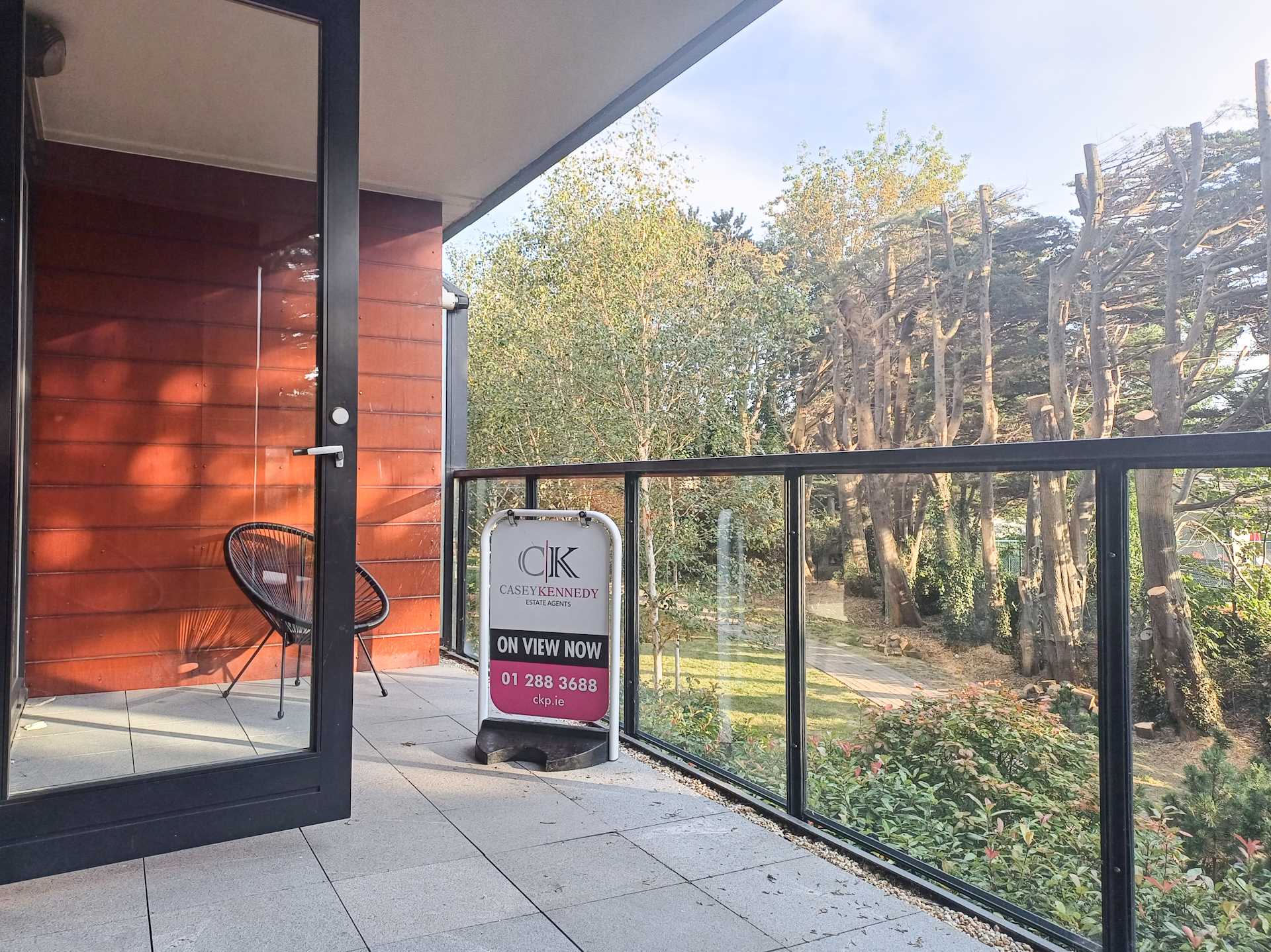 Covered balcony with glass balustrade and granite slab flooring. This has a lovely private setting on the SW corner of The Grange looking through the tress to Leopardstown tennis club and park.There is no road noise, just the sound of people playing tennis. This gets excellent afternoon and evening sun. External lighting. Easy maintenance coated steel walls at both ends containing two storage units, one of which holds the boiler for the gas fired central heating..The main balcony area measures approx. 4.25m x 2m.