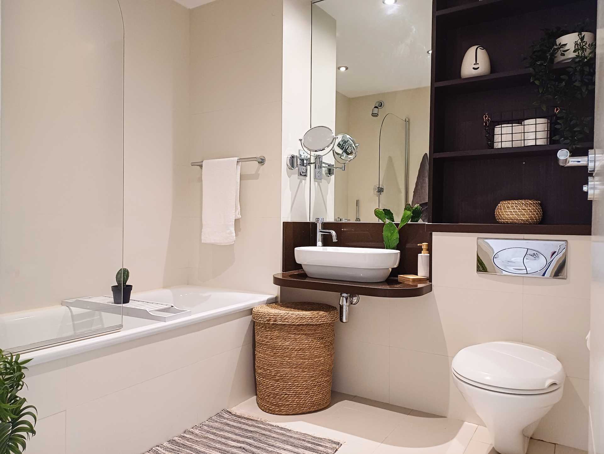 Beautifully finished with cream coloured ceramic tile floor and walls. Display shelving.with contrasting wood finish. Generous walk-in shower. Prestige wash hand basin with vanity shelf and large vanity mirror. Floating WC with hidden cistern. Recessed lighting. Extractor fan.