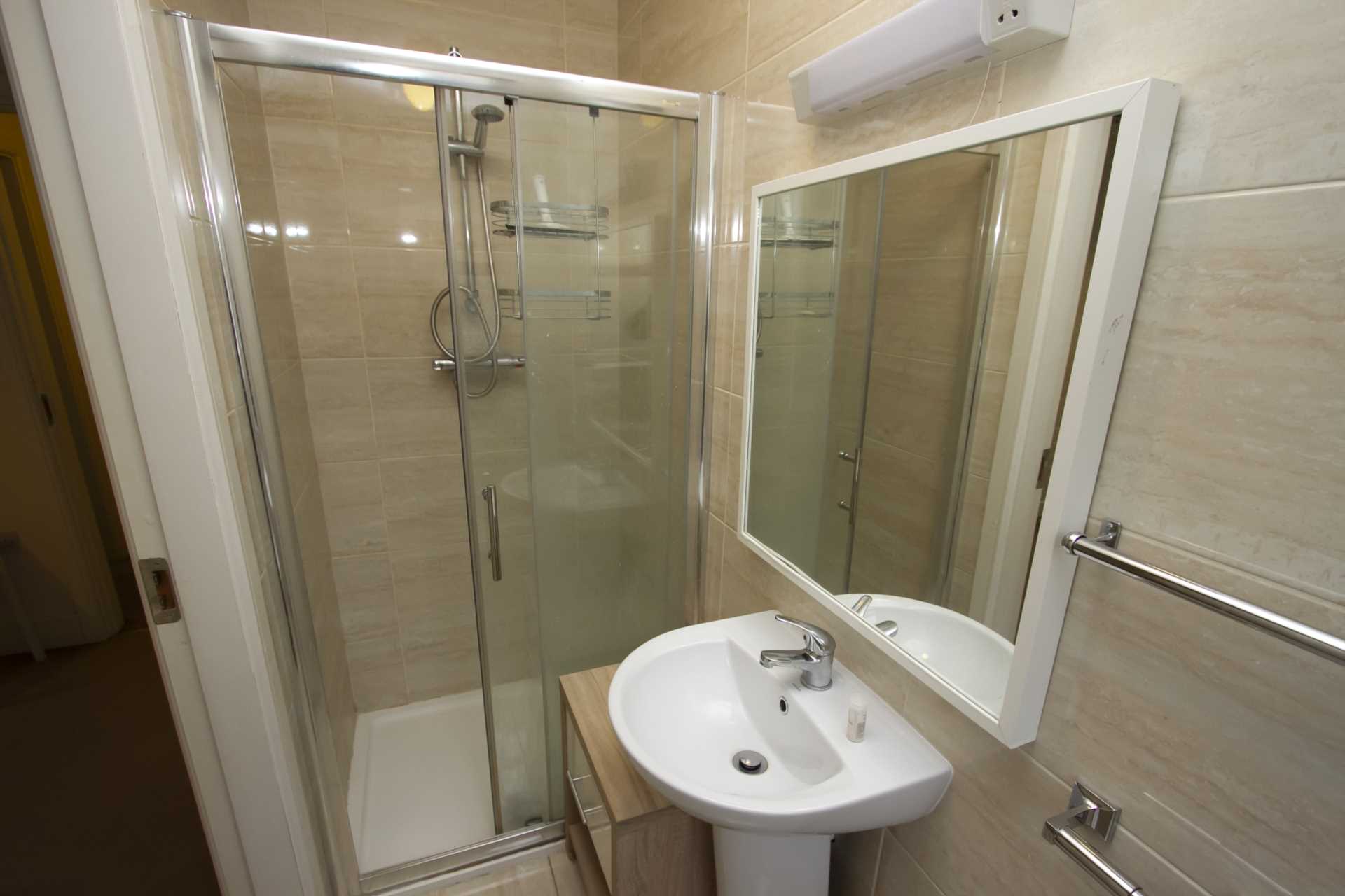 With w.c., w.h.b., bath with shower attachment and tiled floor.