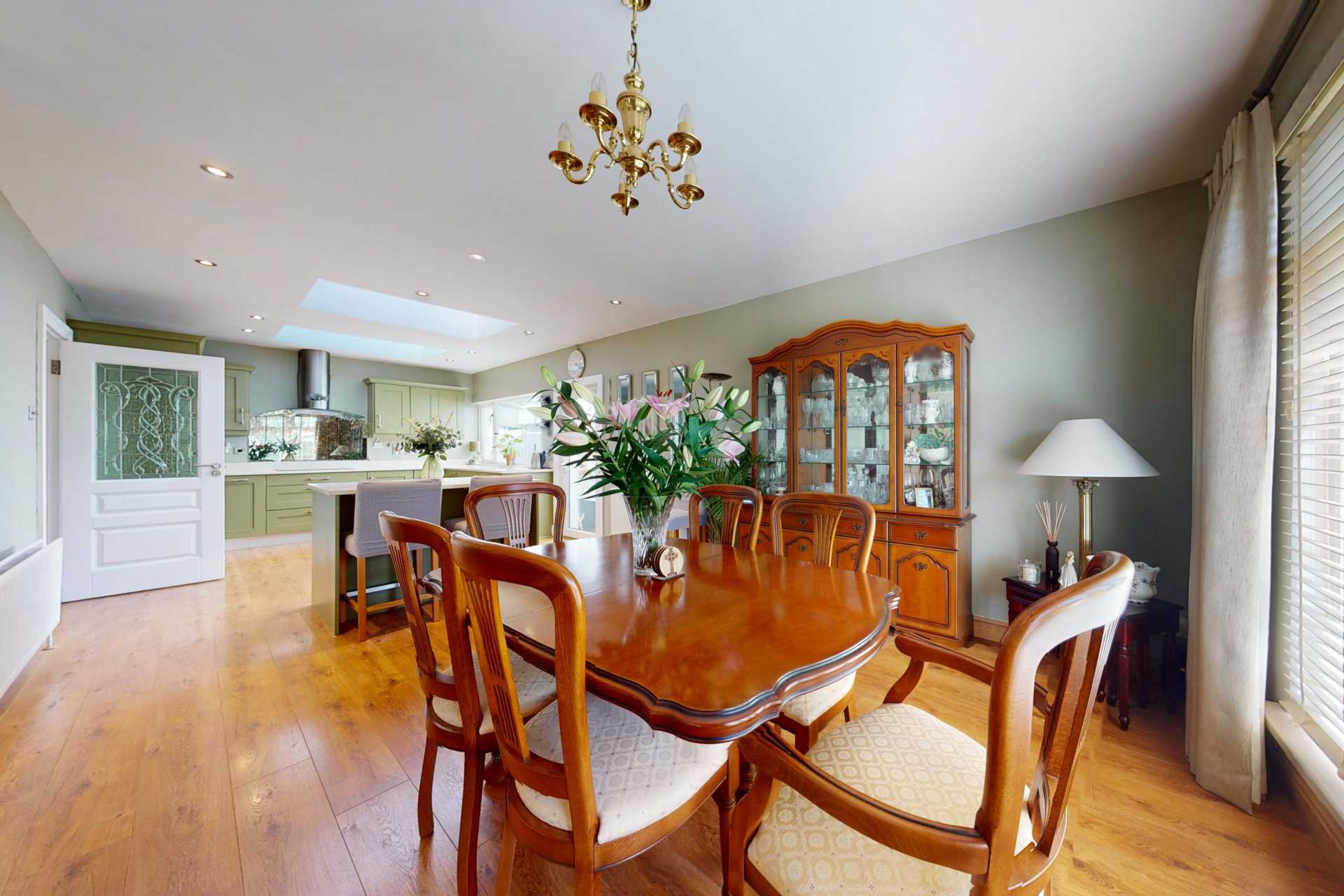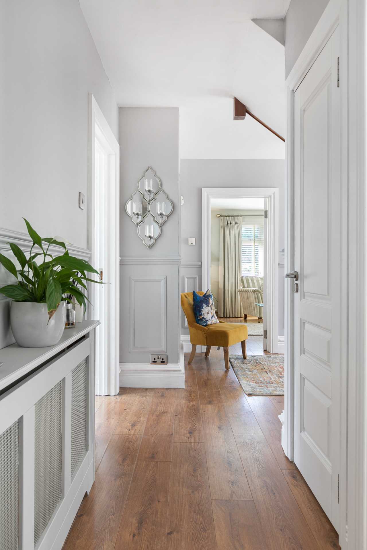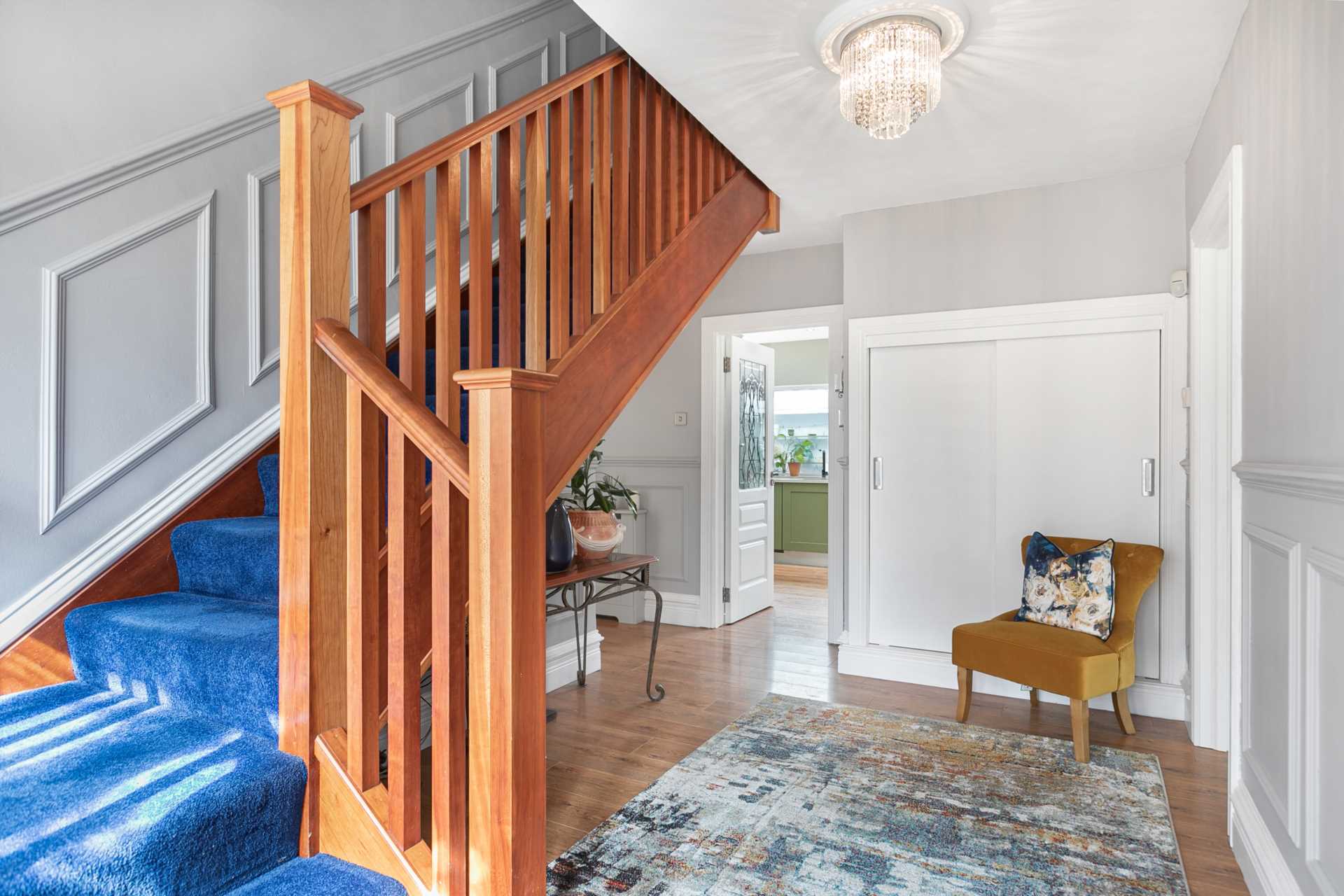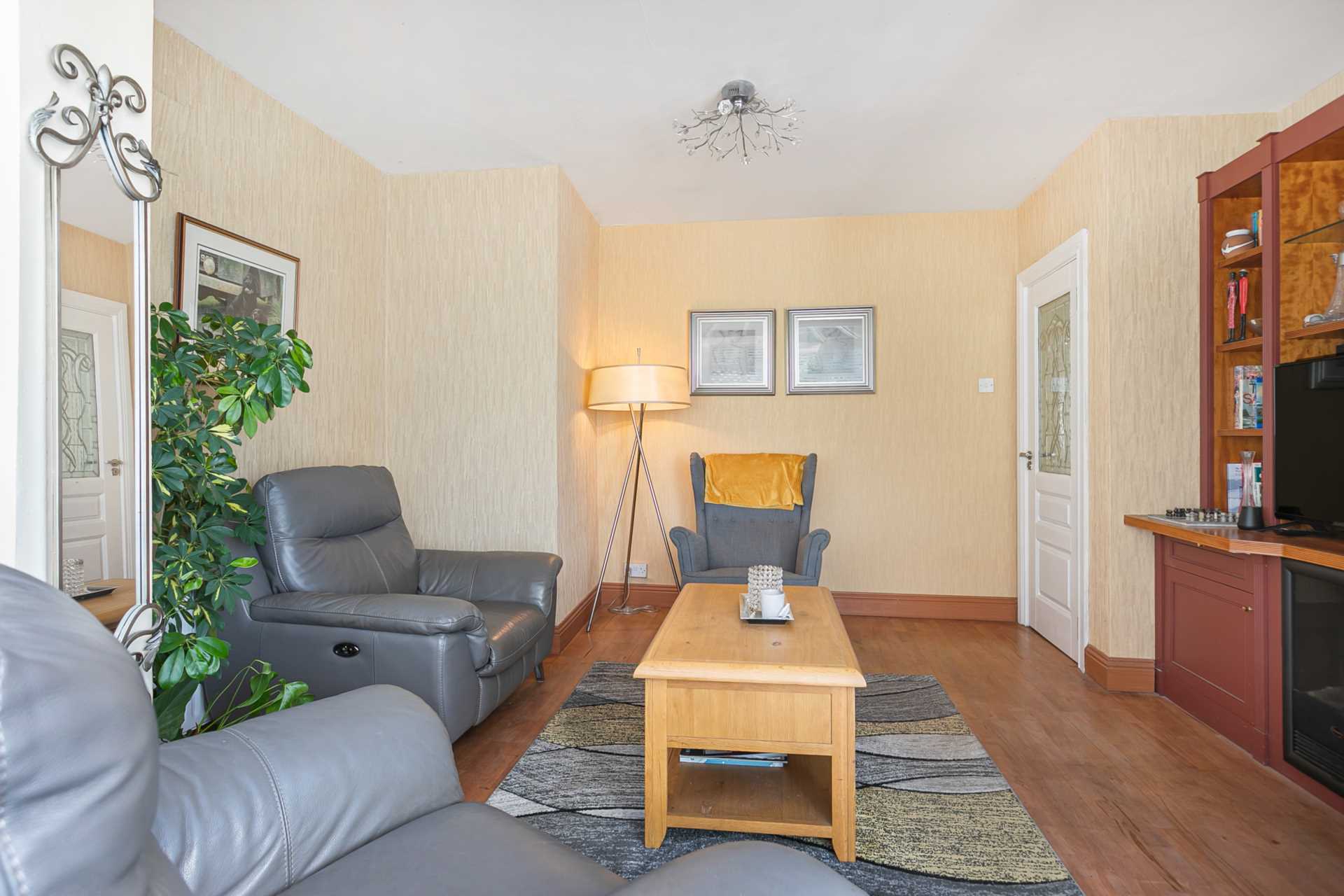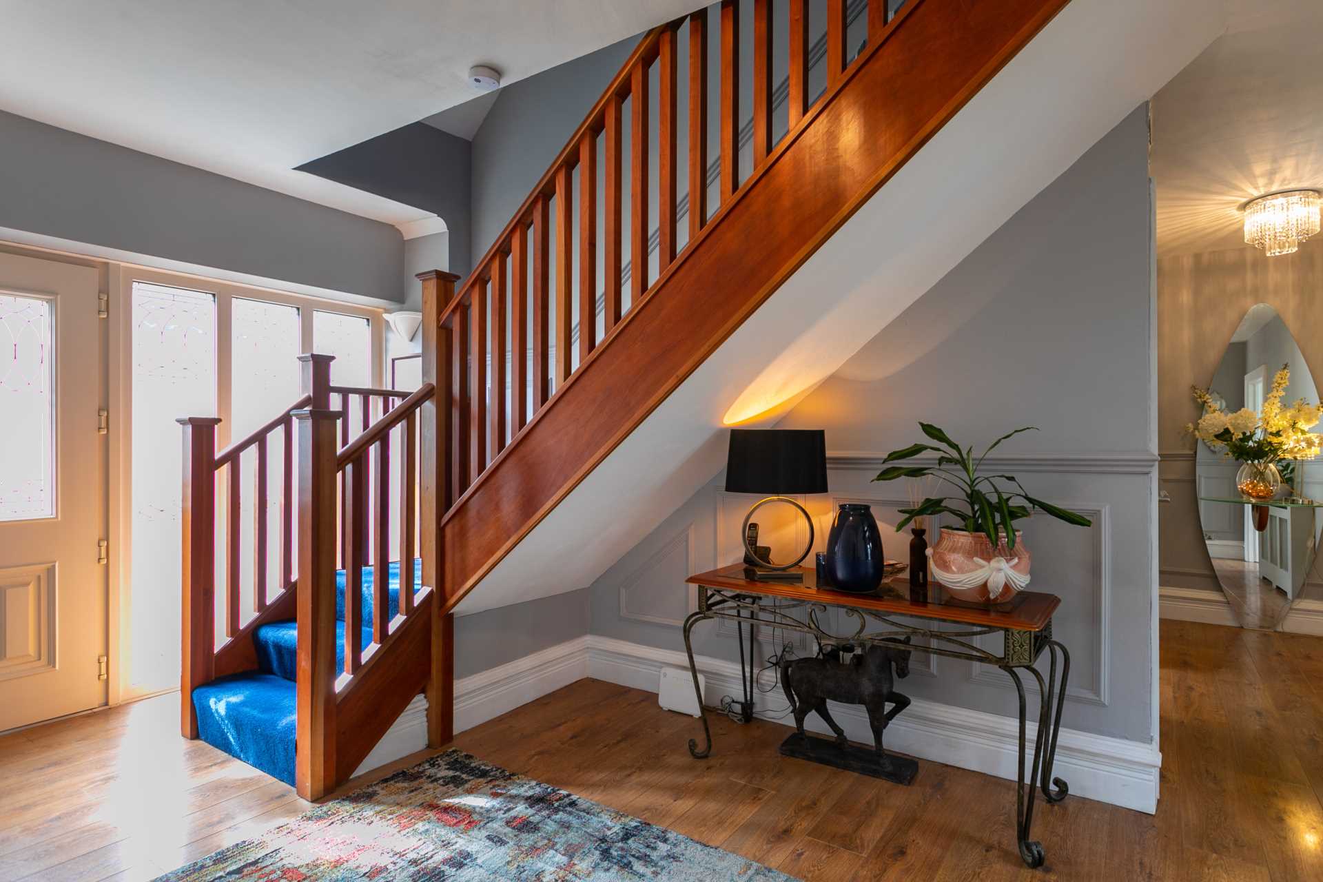 Lovely bright space with a large triple-glazed window with stained glass elements matching the front door. Beautiful mahogany staircase with protective carpet. Attractive grey painted wood panelling and wood effect flooring give a luxury feel. Radiator cover matching the wood panelling. Coat press. L-shaped section leading to downstairs bedroom, bathroom and lounge/conservatory. The hot press is off this section. Two matching chandelier type light fittings. White painted solid wood internal doors with attractively leaded safety glass. Medium oak flooring.