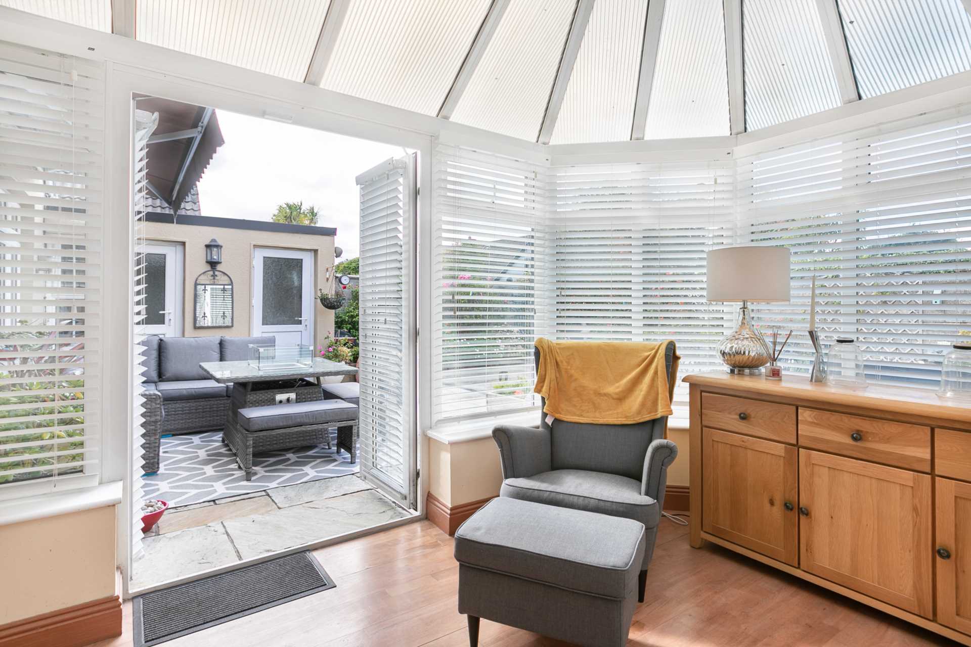 Wood flooring. Light fitting. Ceiling fan with light in sun room area. Double glazed sun room with toughened glass roof. French doors to patio area. Blinds.