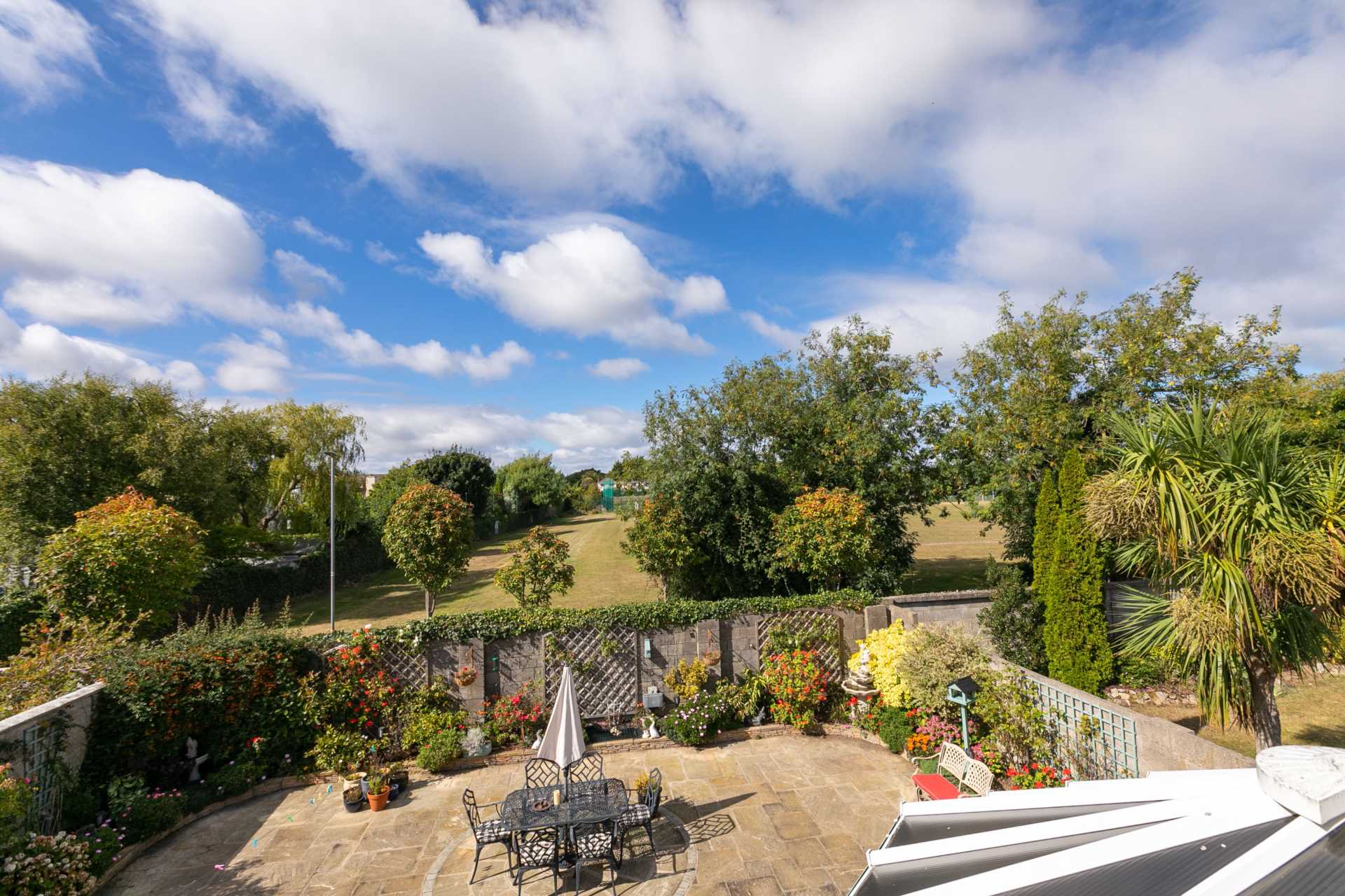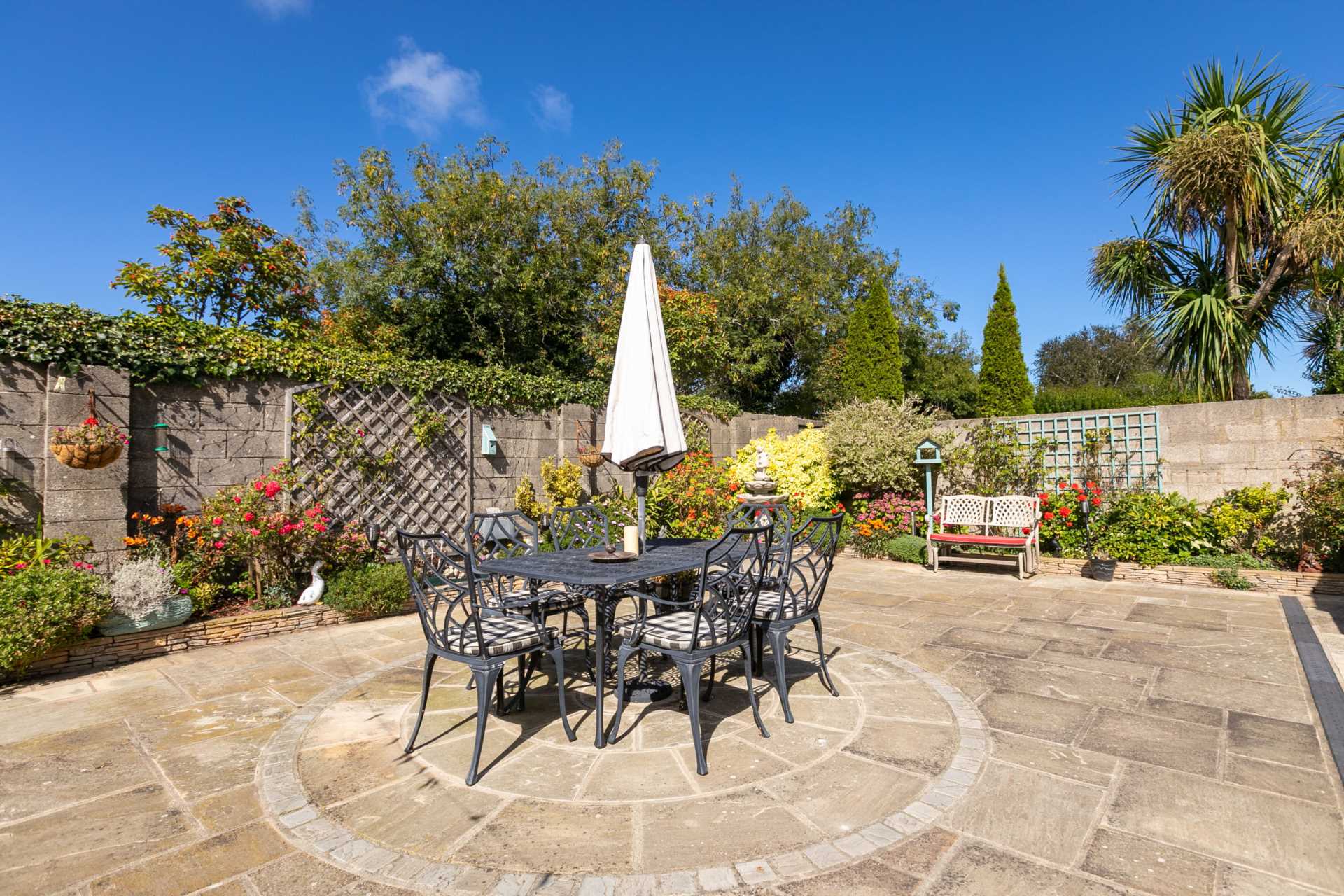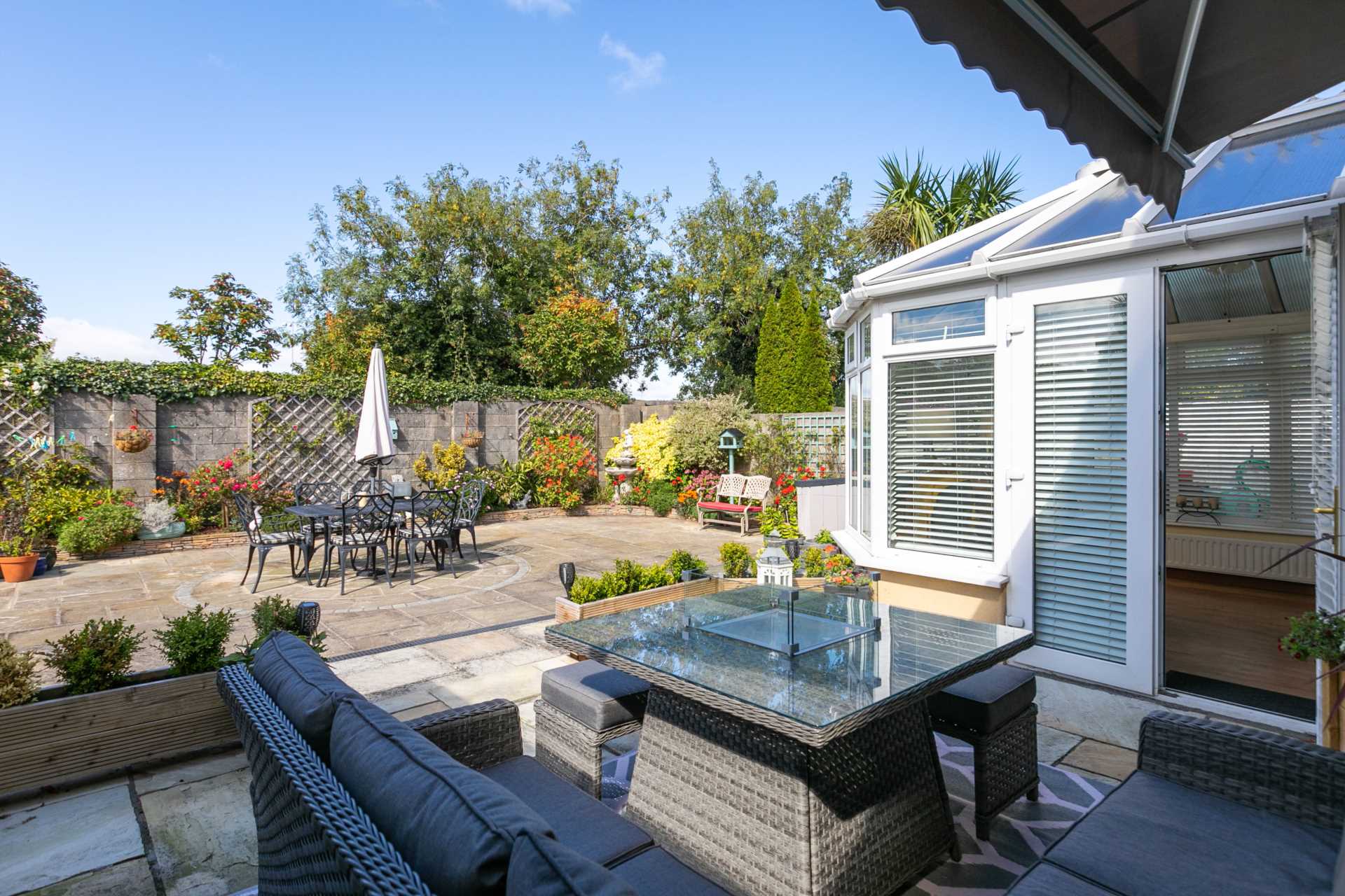 Raised sandstone patio area ideal for outdoor seating and al-fresco dining. Low maintenance, attractively paved garden surrounded a low stone wall and well tended flower beds bursting with an array of colourful flowers. Goldfish pond. Trellising. Garden lighting. Very private. Not overlooked. Awning not included.