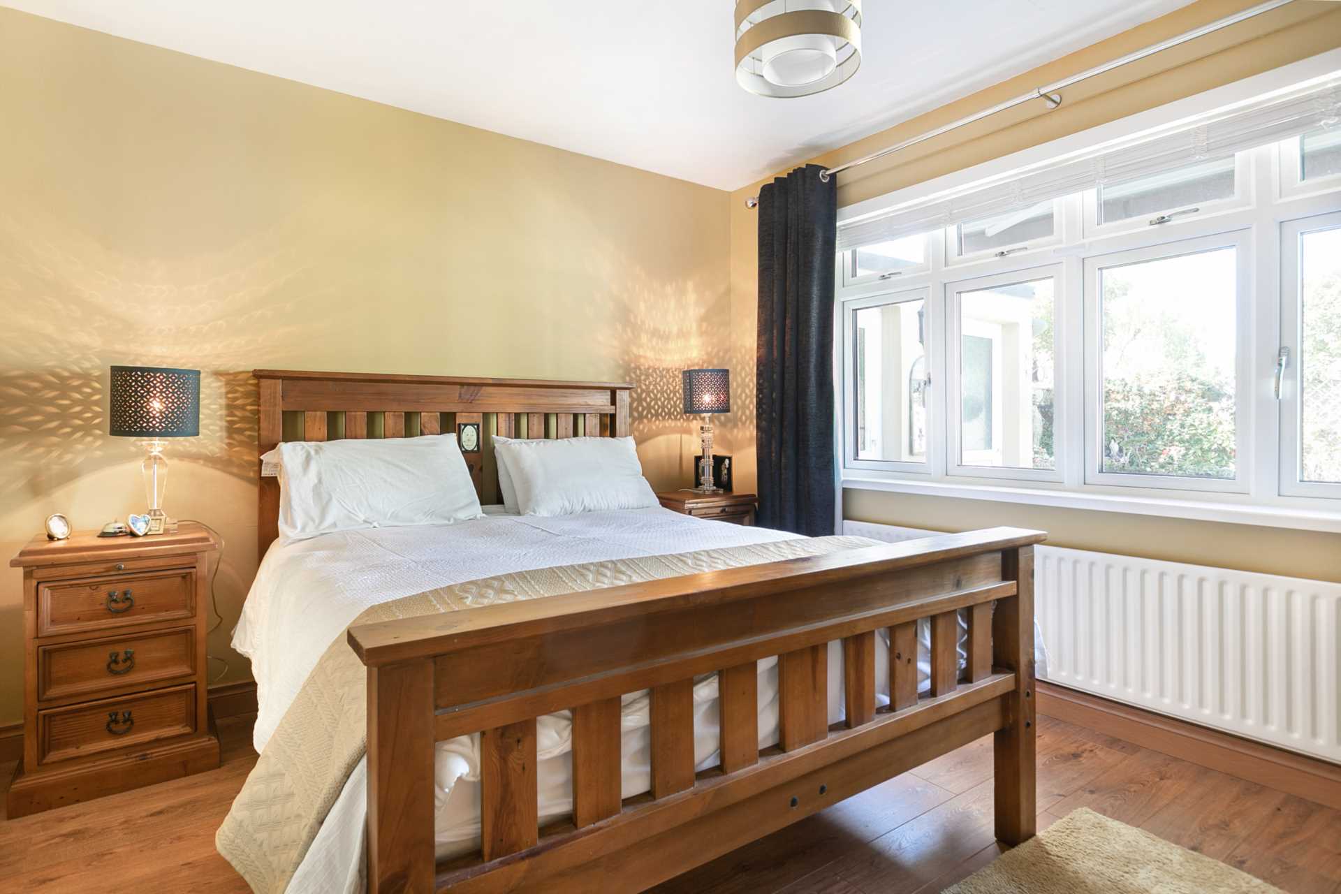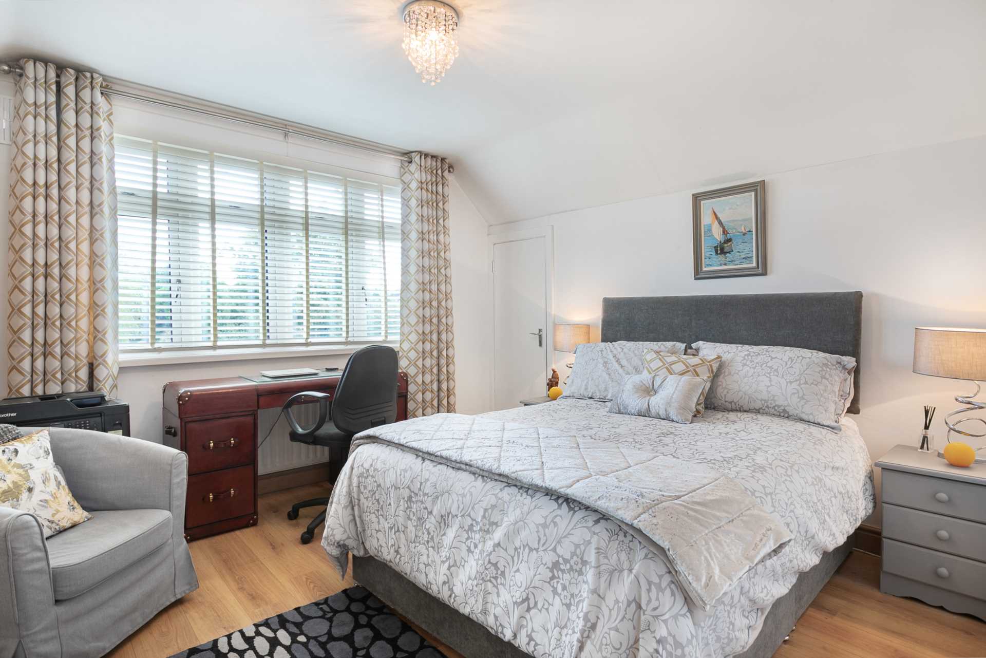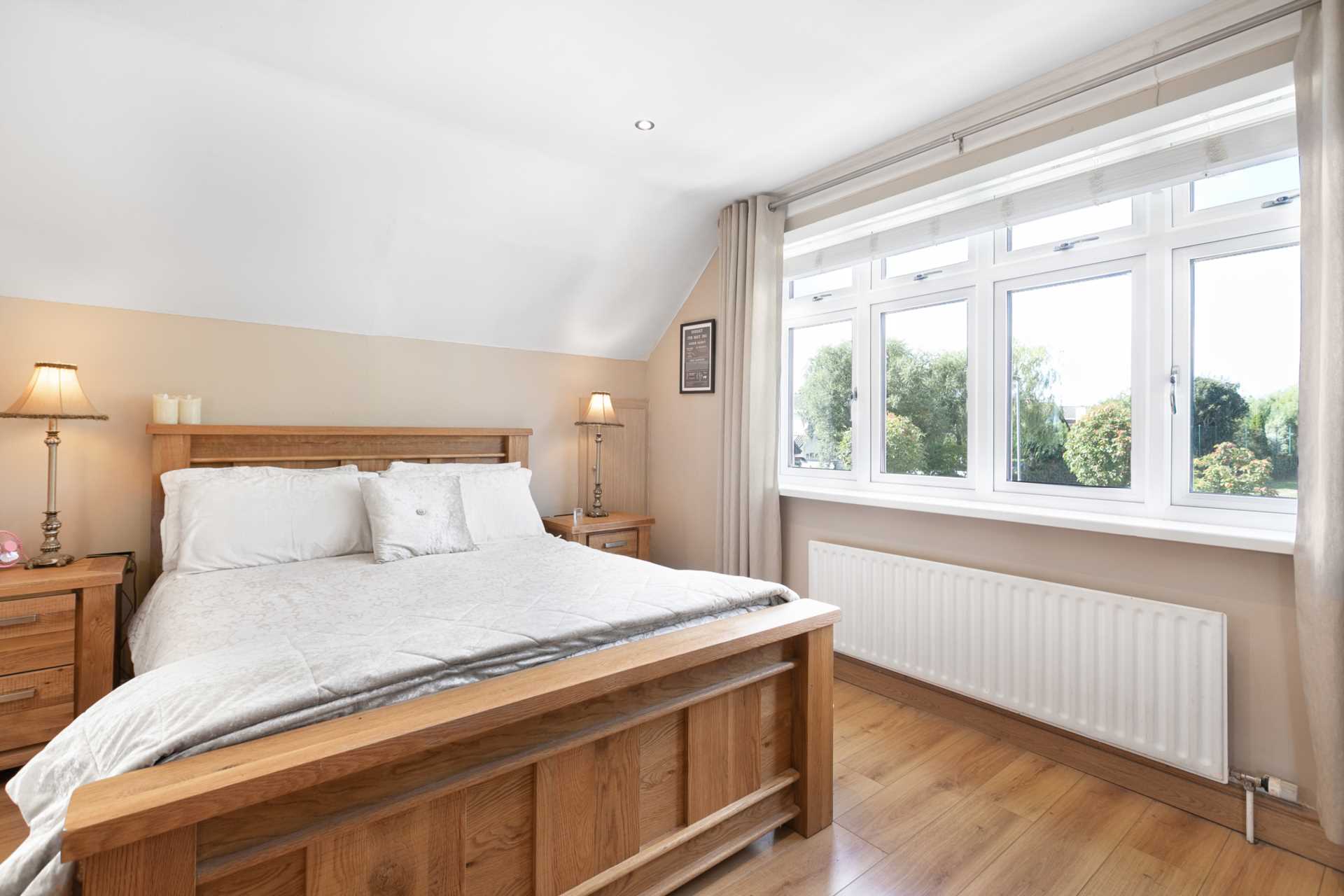 King sized room. Large triple-glazed window to rear. Blinds. Curtain rod. Medium oak flooring.
