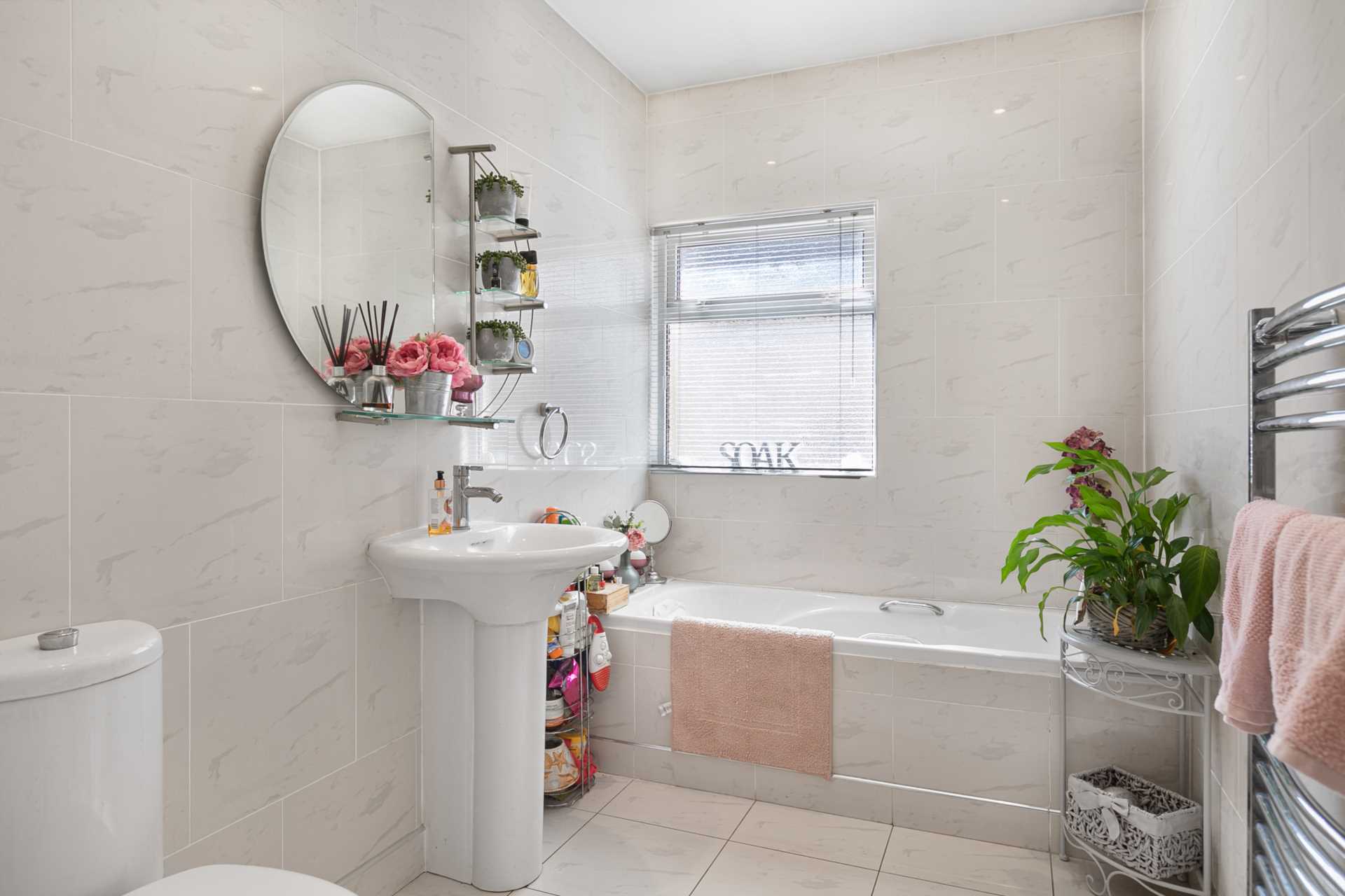 Fully tiled. Full size bathtub. WC. Pedestal WHB with mixer taps. Vanity mirror with glass shelving. Towel ring. Heated towel rail. Window with blinds.