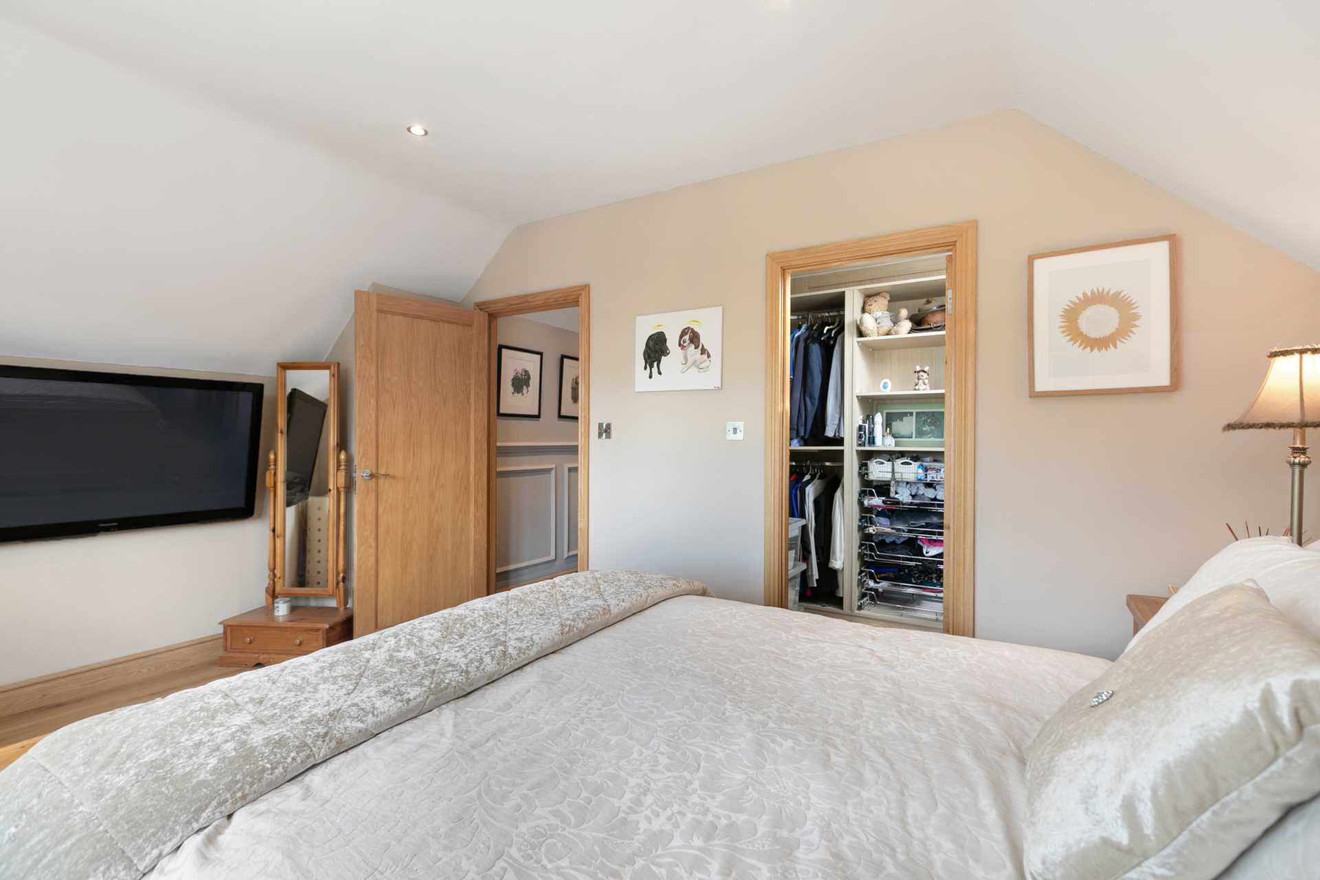 Originally an extra room. The door from the landing was closed off and this was made into a larger walk-in wardrobe. Skylight. Wardrobe fittings. There is precedence in the area for adding a dormer window to this room.